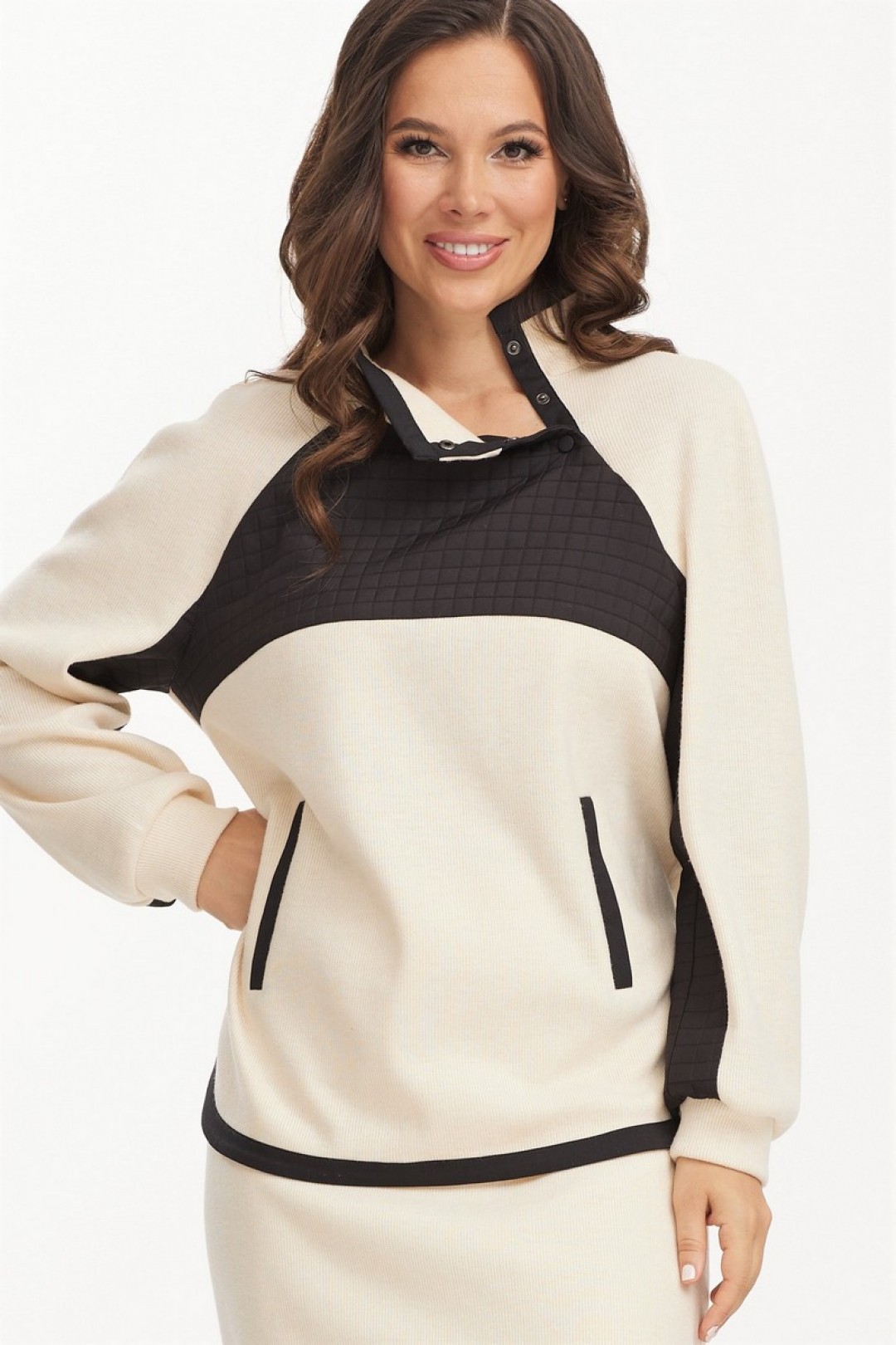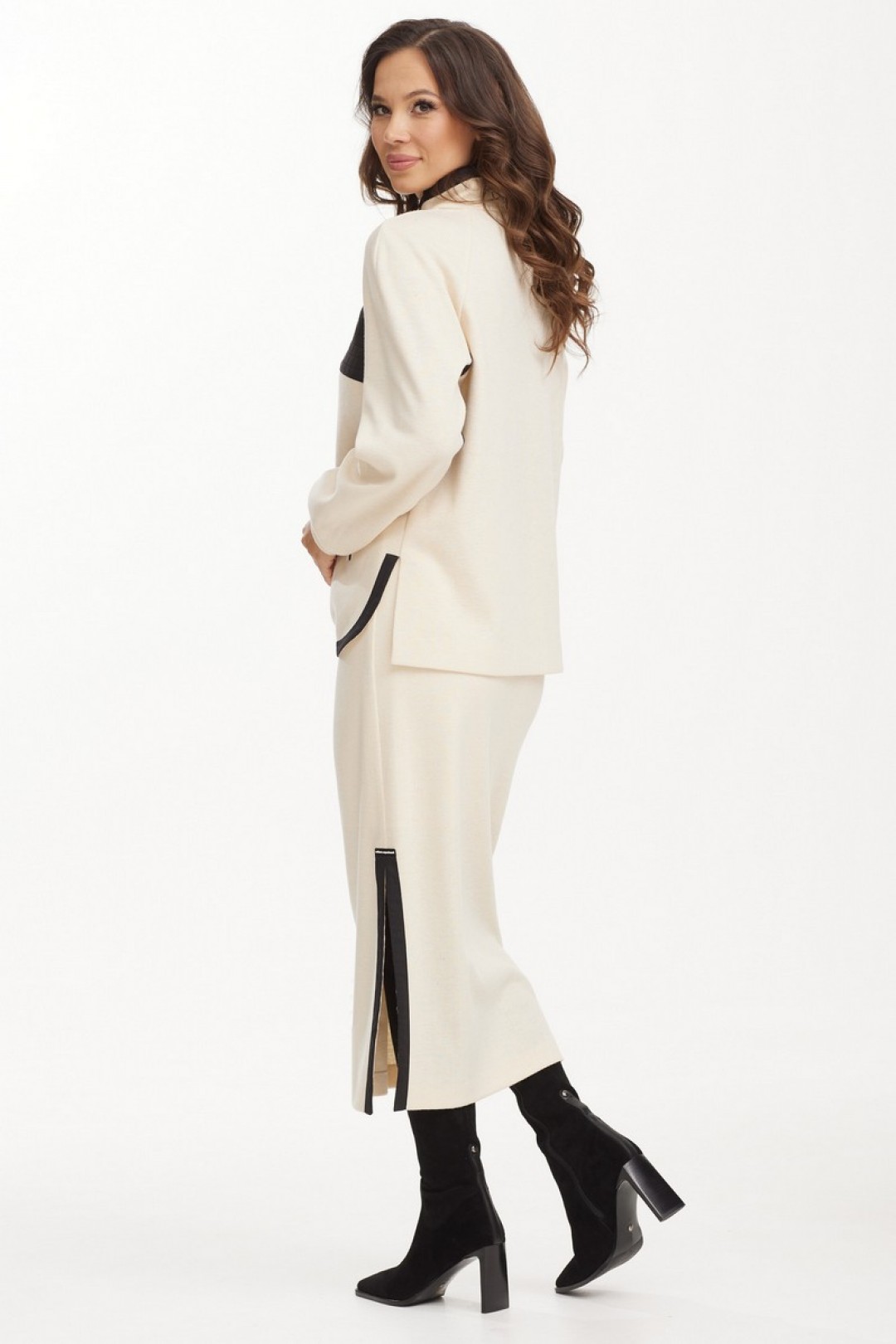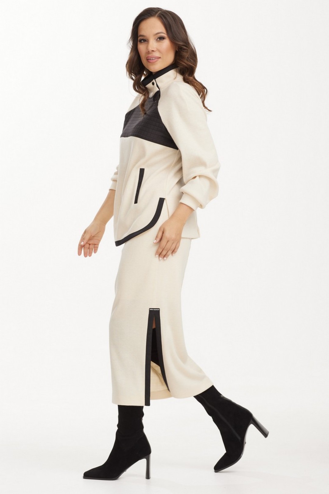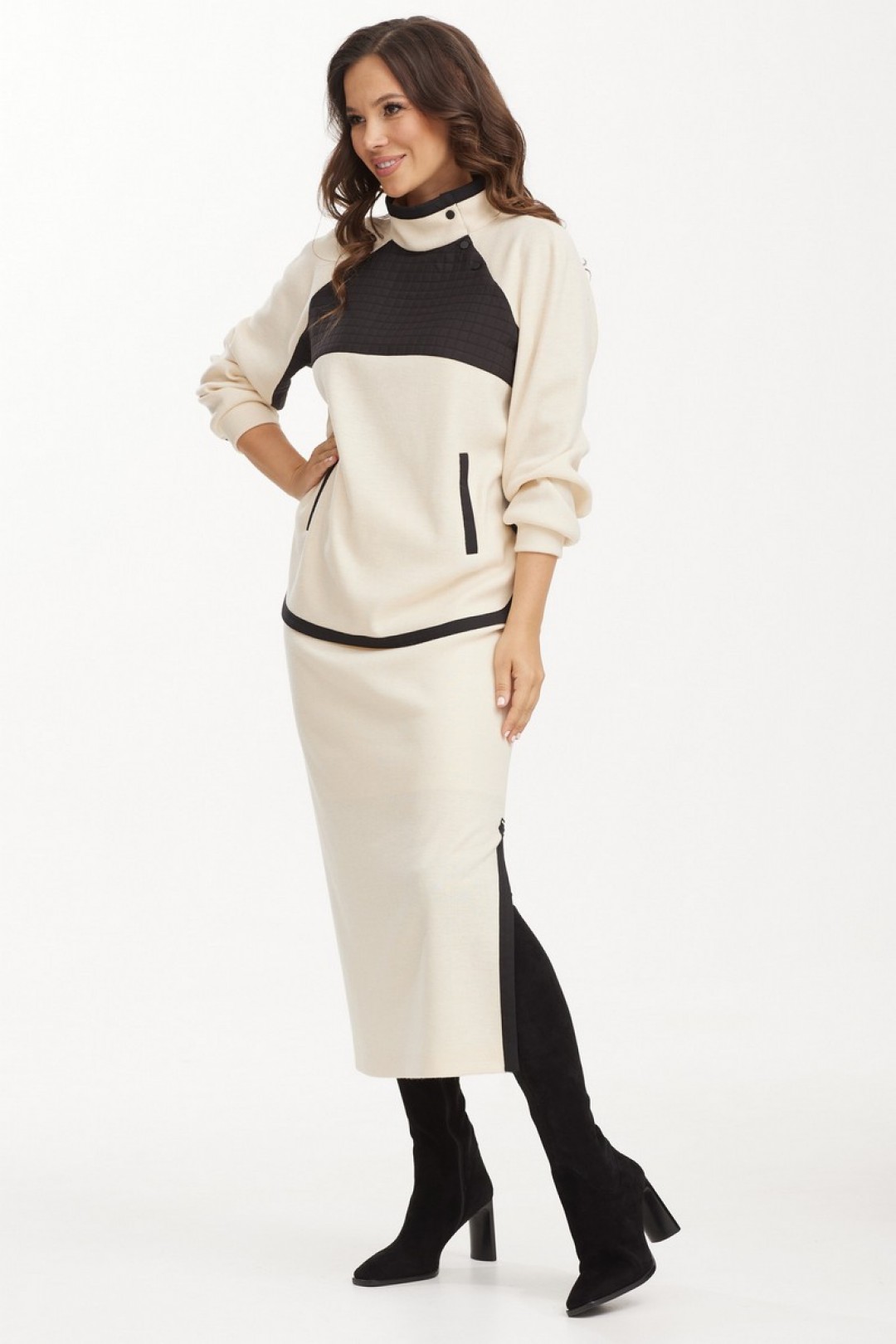 Выполнен из фактурного, приятного к телу трикотажного полотна в мелкий рубчик. Джемпер прямого свободного кроя с цельнокроеным рукавом. По низу рукав дополнен притачной манжетой. Горловина обработана стойкой с застежкой на металлические кнопки. Джемпер дополнен вставкой из поливискозной ткани с имитацией стежки. Юбка миди с боковым разрезом. По талии эластичная тесьма. Юбка дополнена комфортной трикотажной подкладкой.