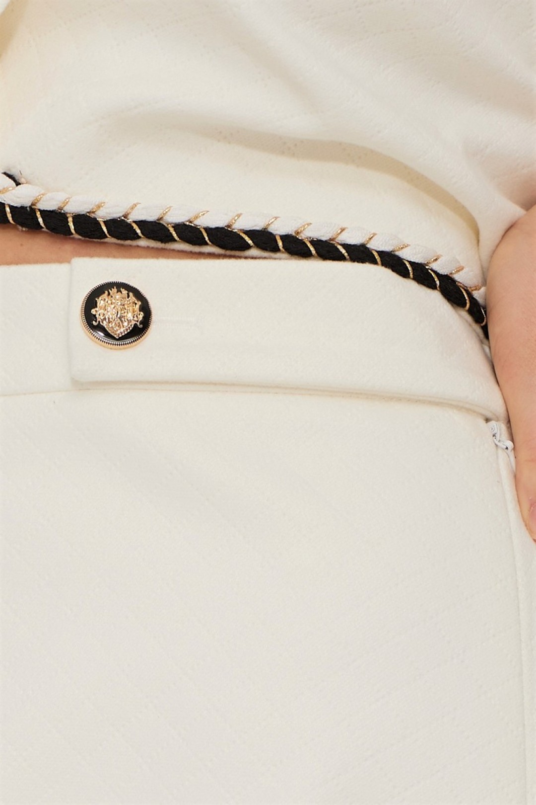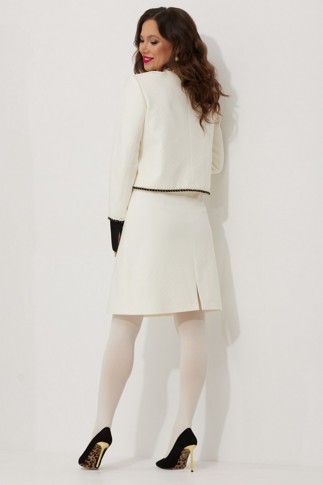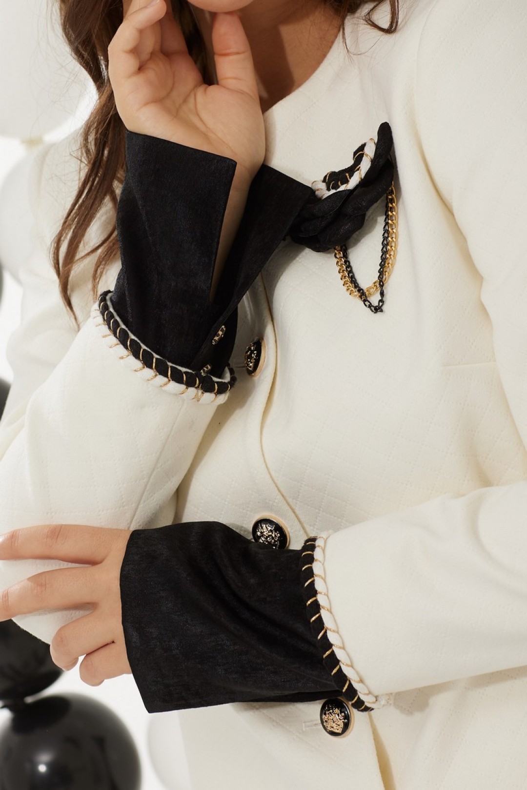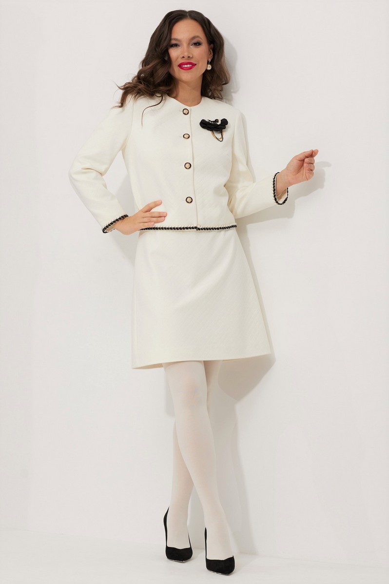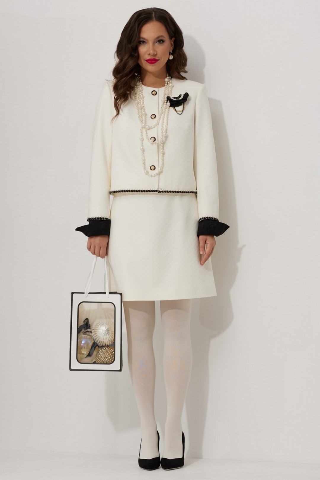 Стильный и элегантный костюм в стиле Сhanel. Выполнен из плотного фактурного трикотажного полотна с эффектом стежки. Жакет прямого кроя на подкладке, с центральной застежкой на пришивные пуговицы. Горловина округлой формы, рукав втачной. Дополнен отделкой декоративной тесьмой. Имеет съемные манжеты черного цвета с застежкой на пришивные пуговицы. По низу жакет так же дополнен отделкой декоративной тесьмой. Юбка А-силуэта на подкладке, с притачным поясом, дополненным эластичной тесьмой. Застежка по боковому шву на потайную молнию и пуговицу. Эта модель сделает образ сбалансированным и изящным. Брошь в комплекте (ручная работа).