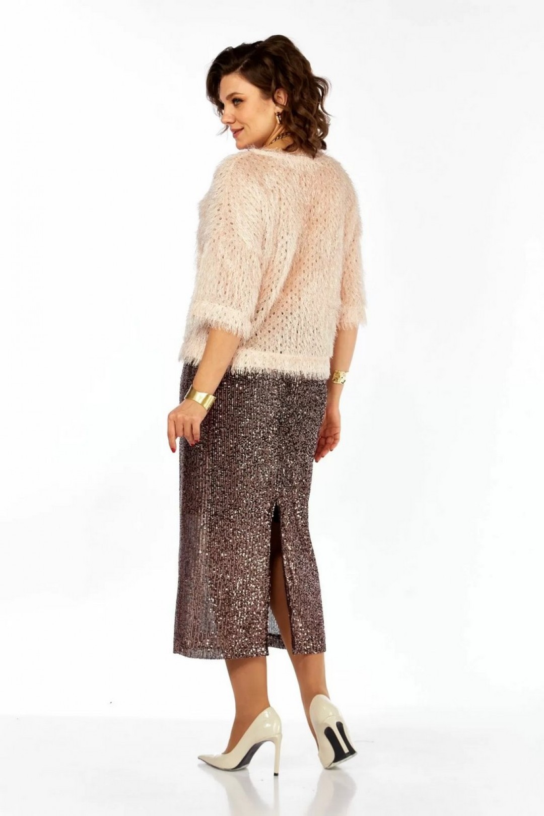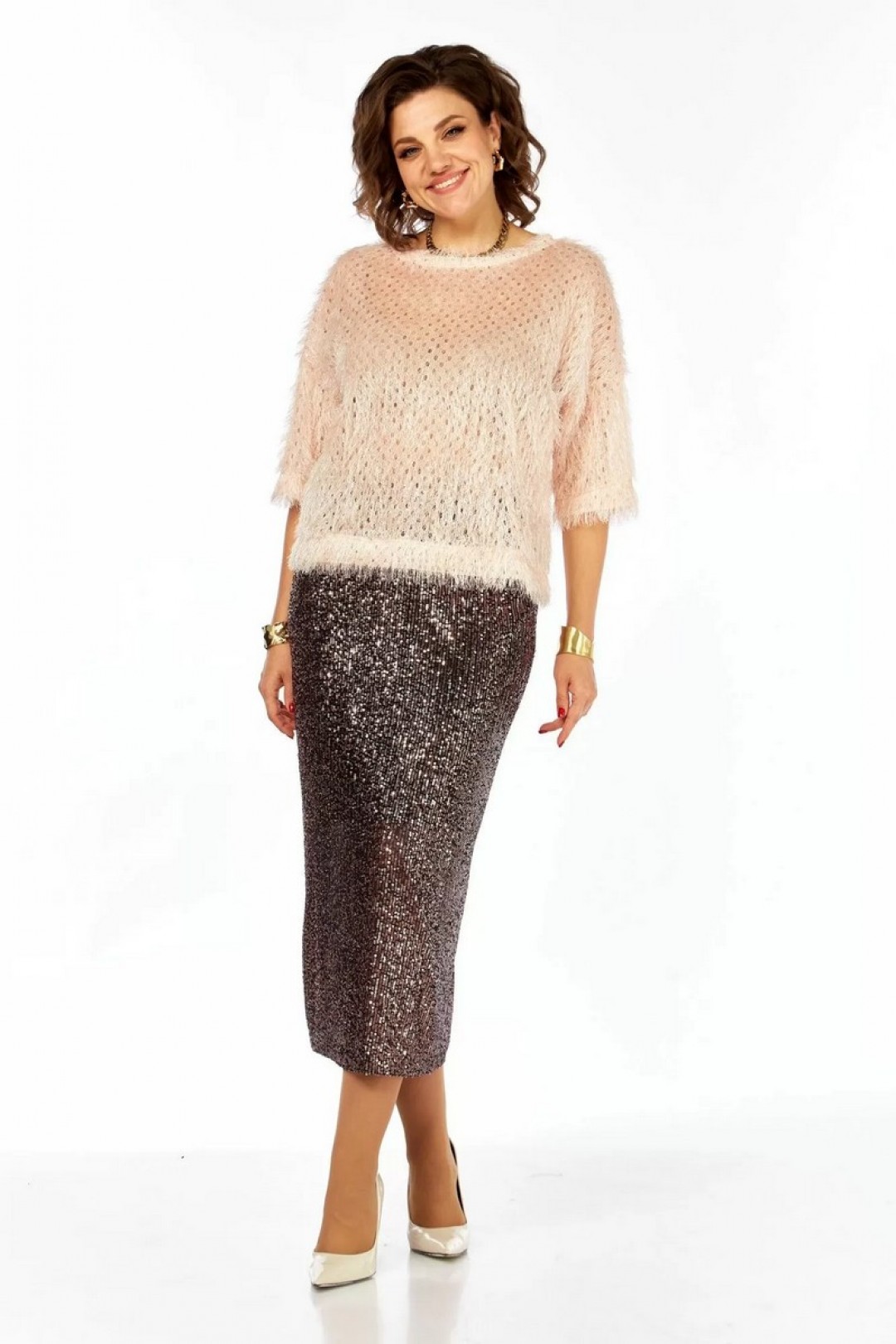 Шикарный комплект, сочетающий мягкую бахрому и паетки -must-have сезона. Блузка нарядная прямого силуэта, из интересной ткани с бахромой. Вырез горловины округлой формы, со спущеныным рукавом длиной 3/4. Юбка длиной миди на поясе (резинка по бокам) из отделочной атласной ткани. По спинке средний шов, в который вставлена потайная молния и заканчивающийся разрезом длиной выше колена. Юбка на подкладке.