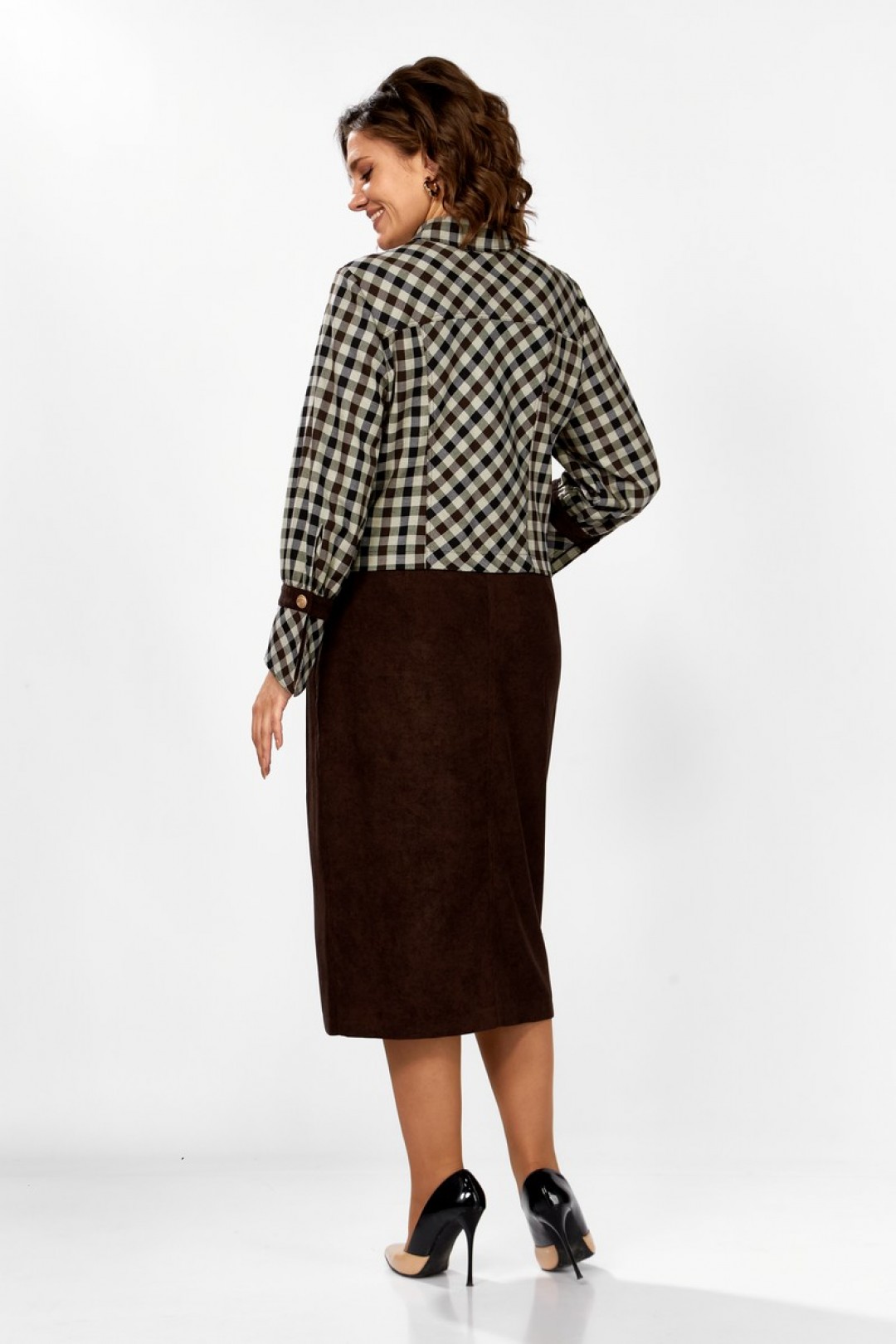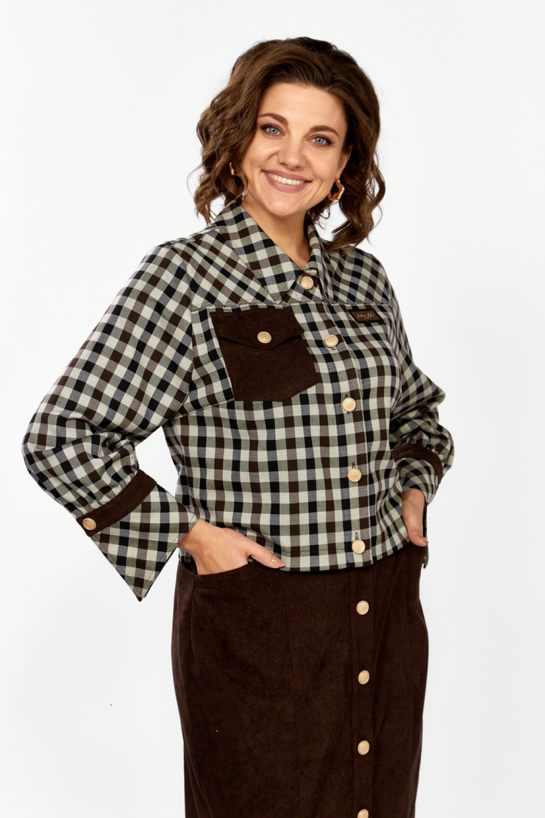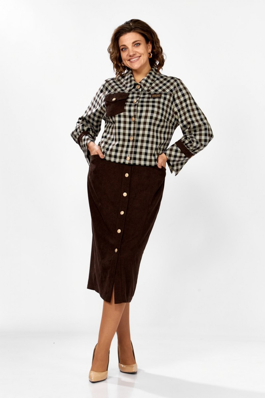 Жакет выполнен из текстильной ткани в клетку, в качестве отделки штрукс. Горловина обработана воротником со стойкой, застежка по переду на пуговицы. На полочке обработаны рельефы и кокетки, также на полочке обработан накладной карман с клапаном из штрукса по одной стороне, по второй нашивка. Спинка идентична полочке, рукав втачной, по низу с манжетой из штрукса и текстиля в клетку, застегивается на пуговицу. Юбка выполнена из штрукса, с застежкой по переду на планку с пуговицами. Верхний срез обработан притачным поясом, по переду обработаны вертикальный подрезы и карманы. Заднее полотнище юбки со средним швом и вытачками. Эффектный и стильный комплект для вашего осеннего образа!