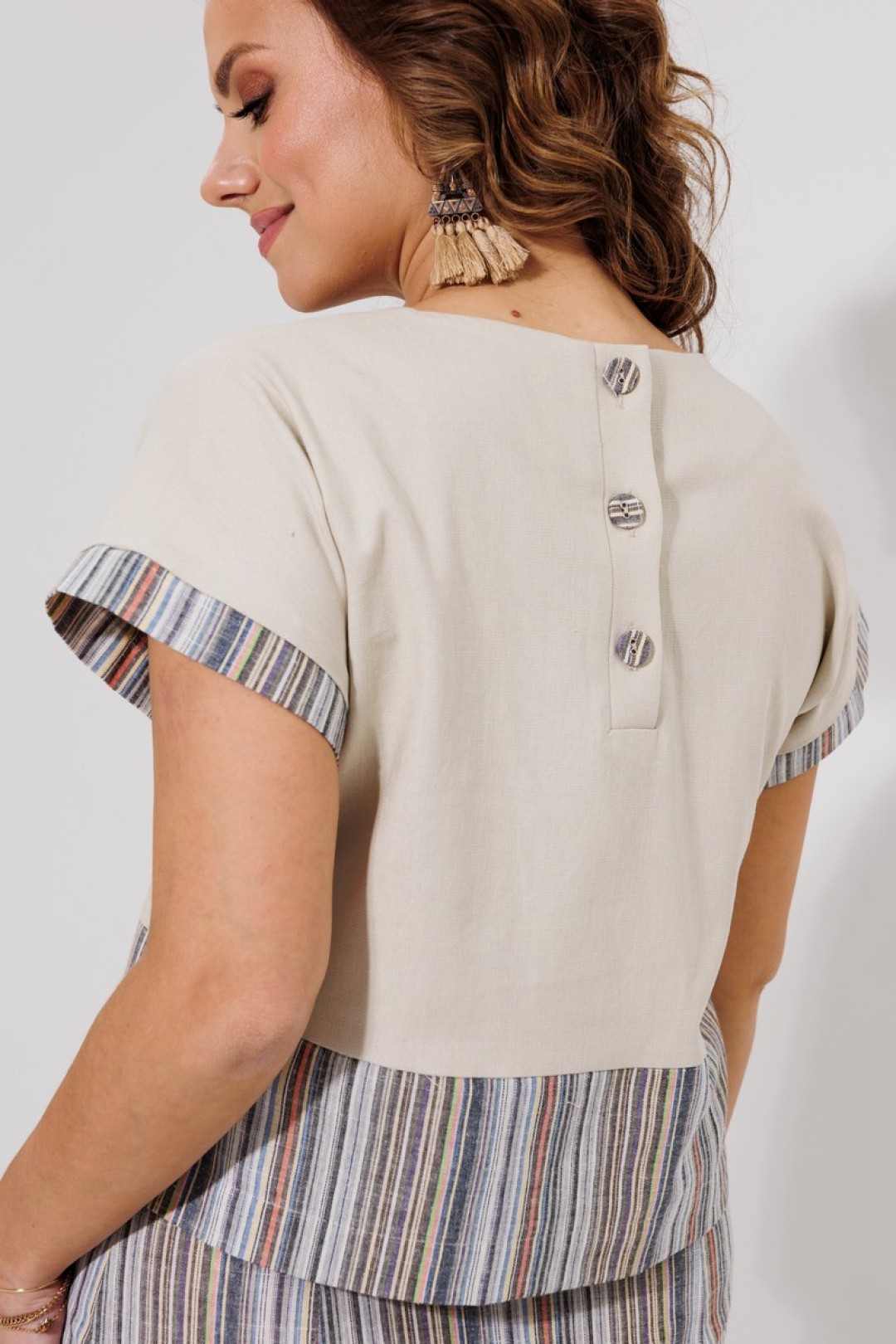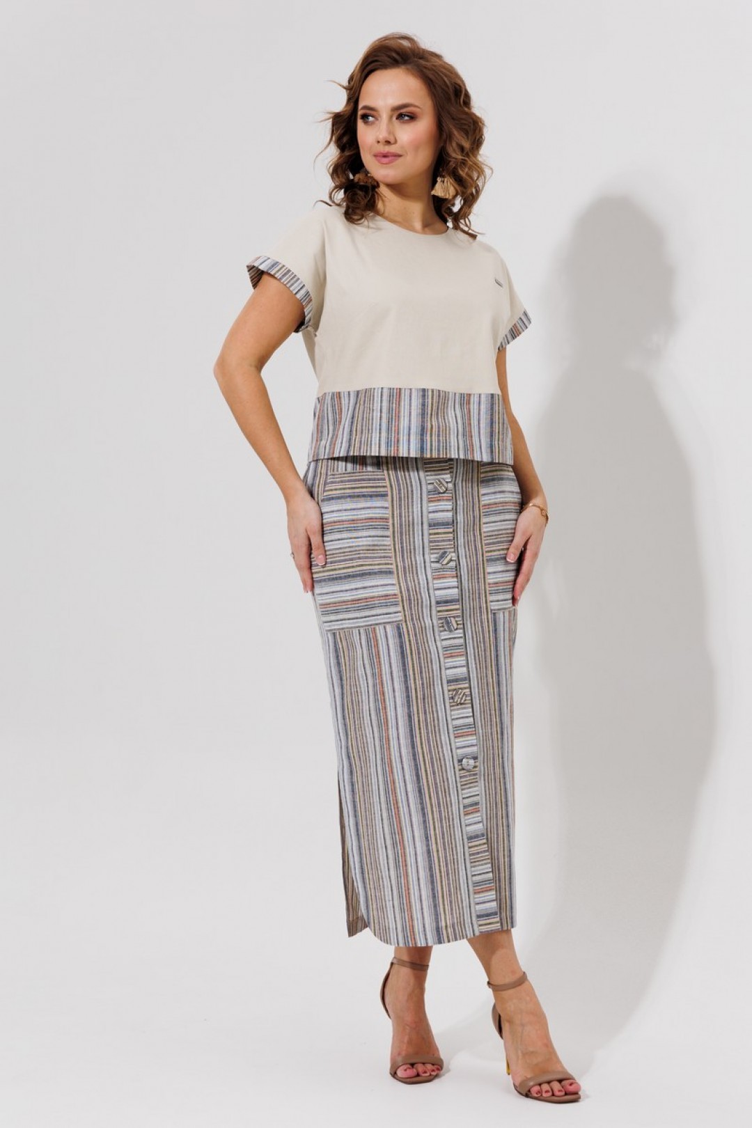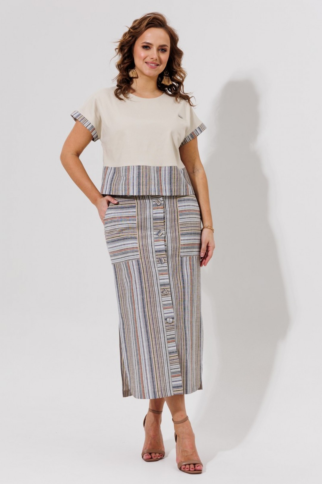 Комплект женский, состоящий из блузки и юбки, из натурального льна. Блузка прямого силуэта с цельнокроеным коротким рукавом, по низу переда и спинки притачная деталь из отделочной ткани, по низу рукава манжеты из отделочной ткани. Перед блузки украшен металлической пришивной фурнитурой. На спинке блузки функциональная застежка-планка с пуговицами из отделочной ткани в полоску.