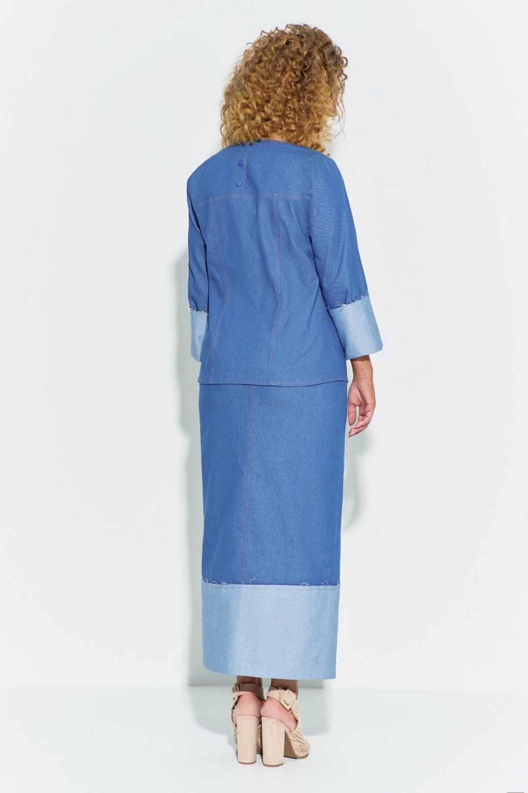 Джинсовый женский юбочный костюм с декором ручной работы на груди. Костюм с юбкой миди состоит из джинсовой юбки карандаш и блузона. Блузон свободного кроя с отрезной кокеткой по переду и декором в области груди. Горловина -лодочка, рукав втачной длинный с отворотом. Спинка изделия с рельефами и отрезной кокеткой. застежка - короткая планка с кнопками.