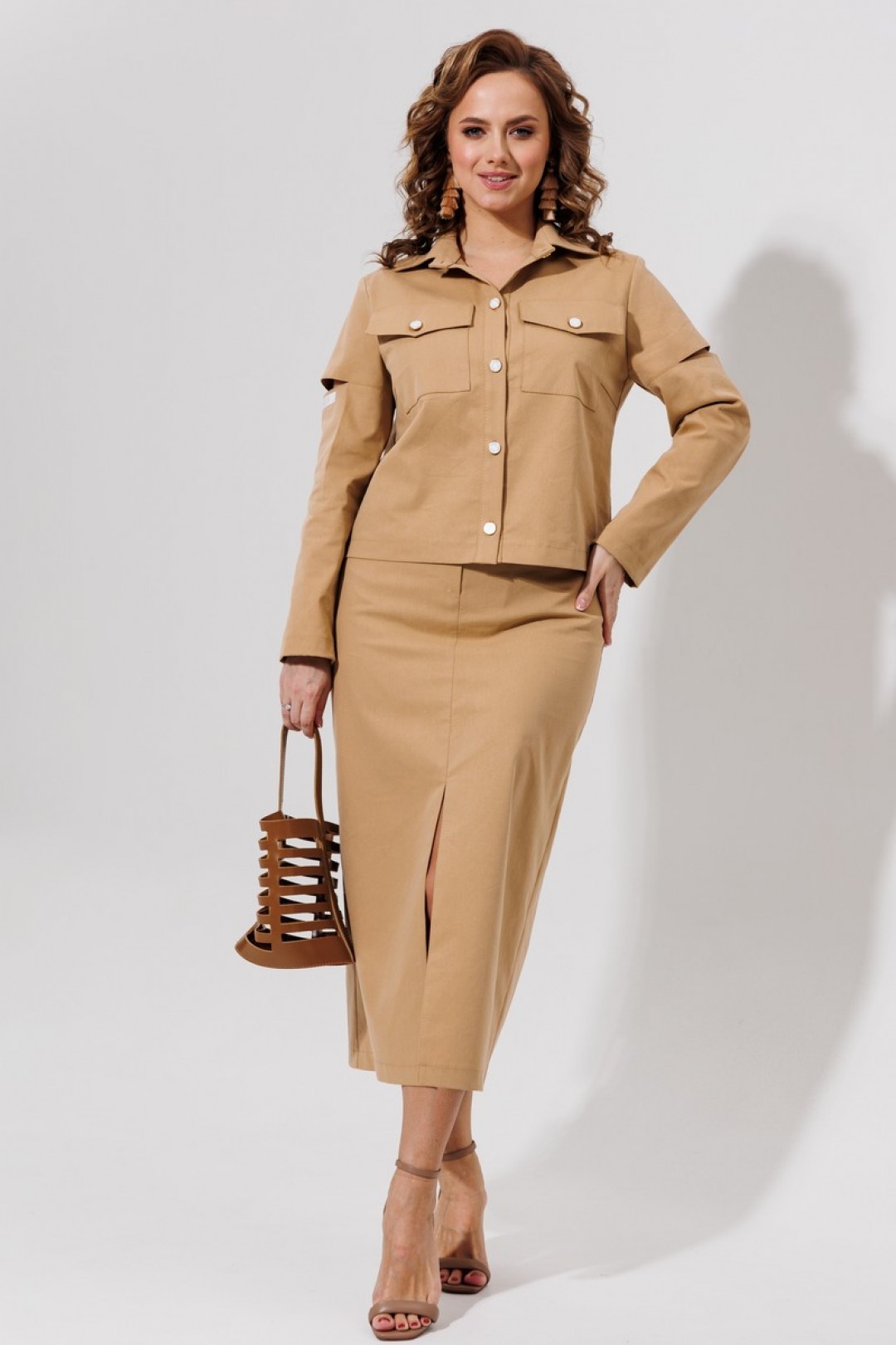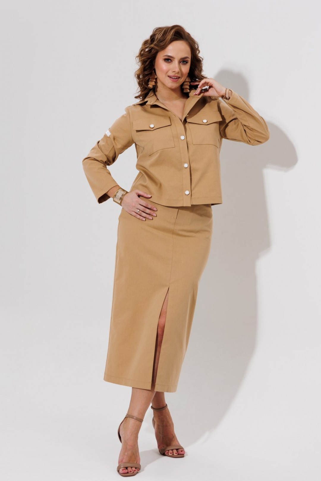 Юбка прямая с карманами на поясе, спереди застёгивается на молнию. По среднему шву расположен разрез.