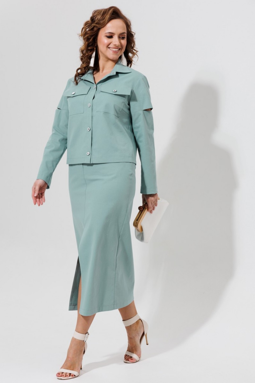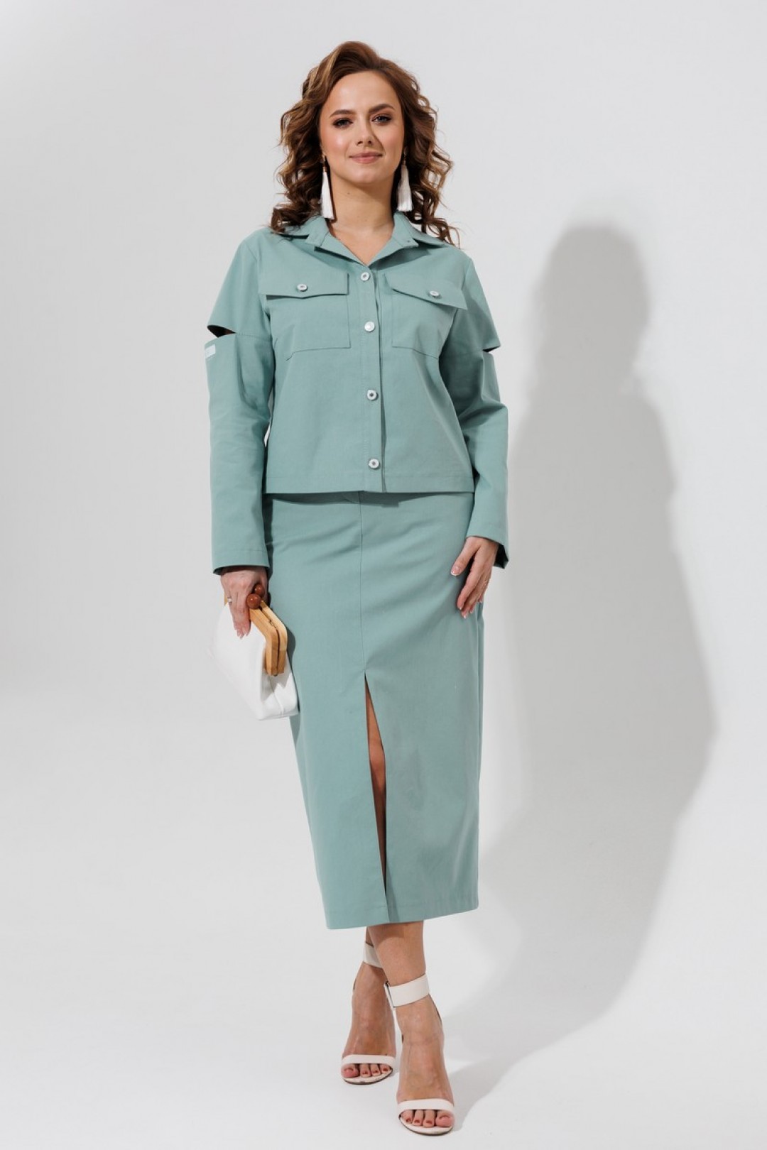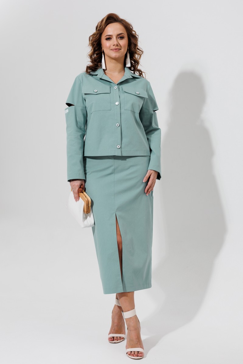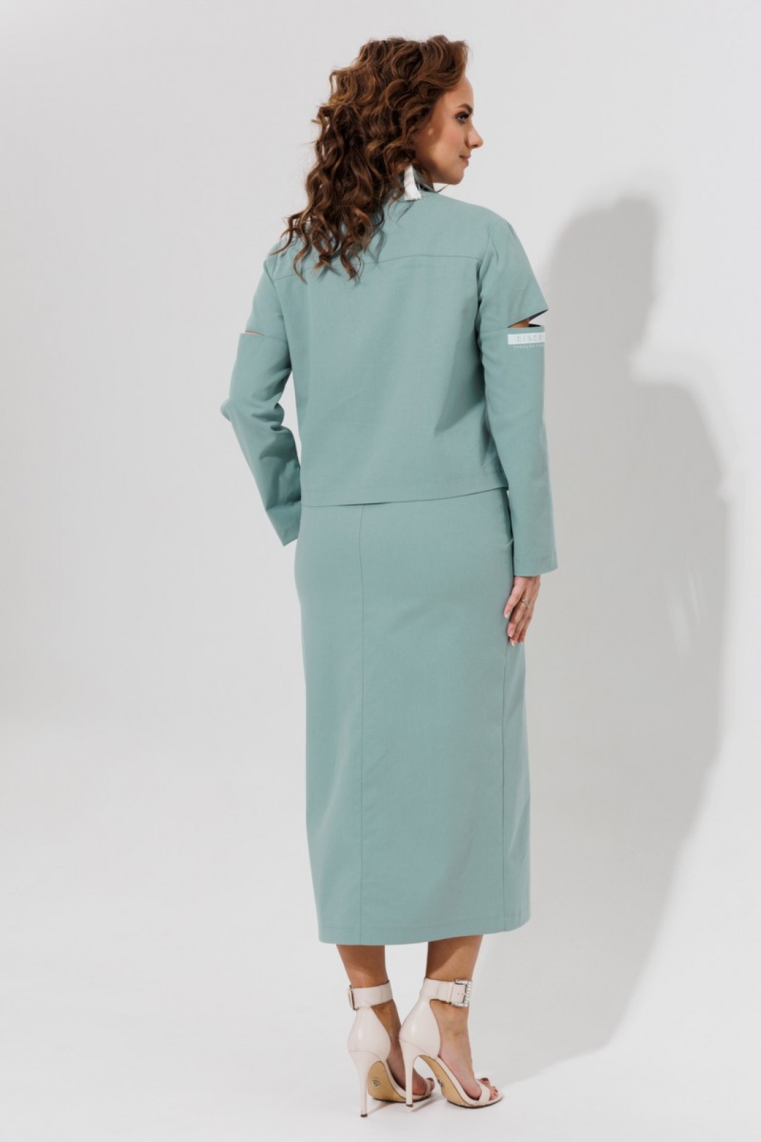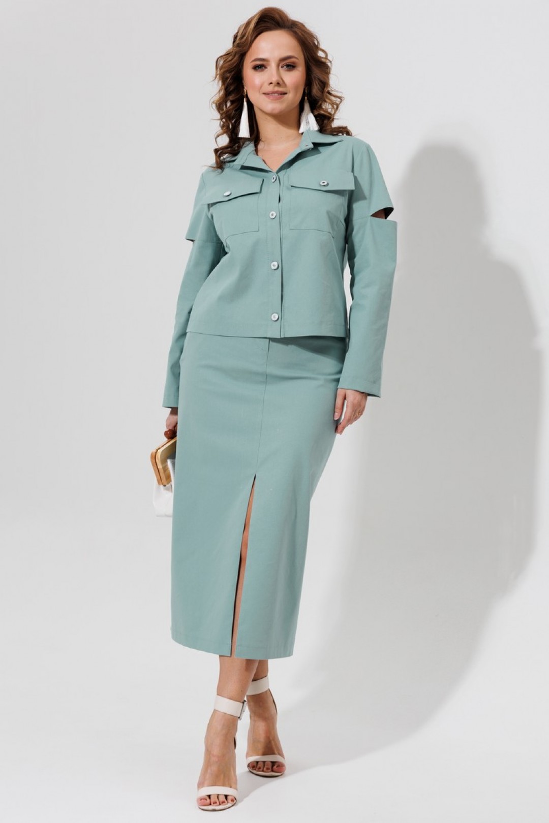 Юбка прямая с карманами на поясе, спереди застёгивается на молнию. По среднему шву расположен разрез.