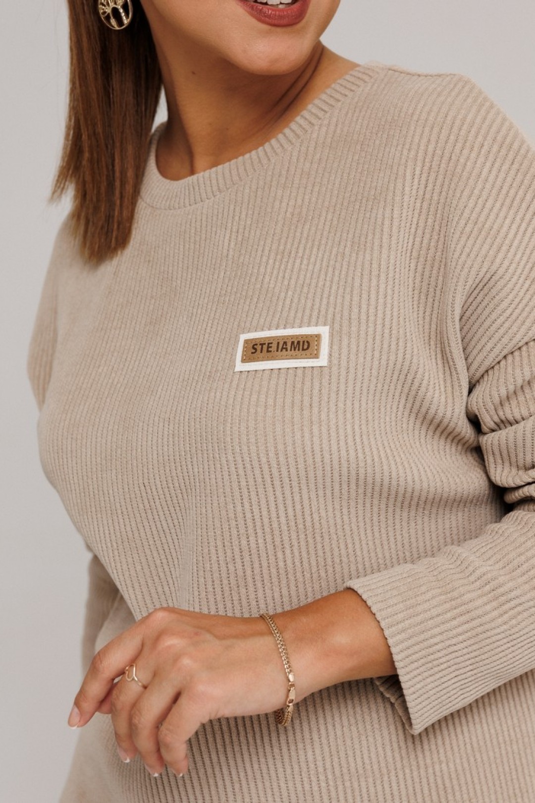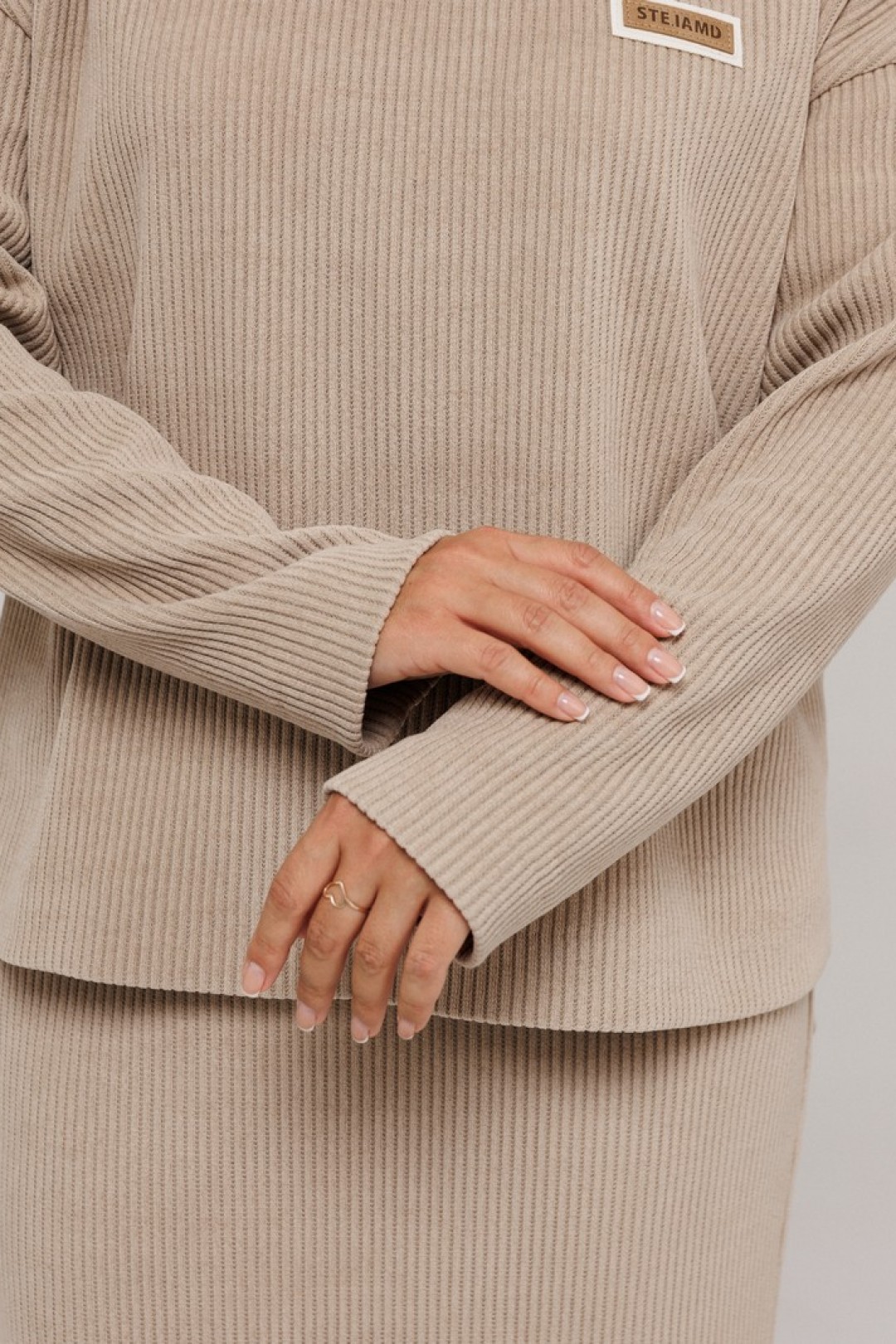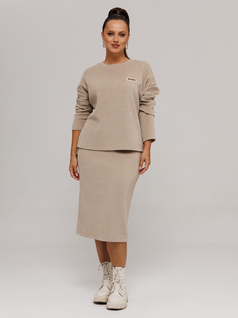 Данный комплект выполнен из мягкого трикотажного полотна, идеально подойдёт для демисезонного периода, благодаря натуральному составу в нём будет тепло, но не жарко. Свитшот свободного кроя с длинными рукавами и спущенным плечом, предаёт образу мягкость и непринуждённость. Горловина выполнена из отделочной ткани в "рубчик", что является очень функциональным и стильным элементом. Юбка прямая, на подкладке, на поясе, слегка зауженная к низу. Длина ниже линии колена. Средний шов юбки заканчивается шлицей