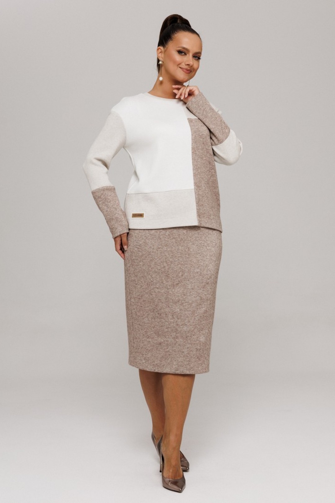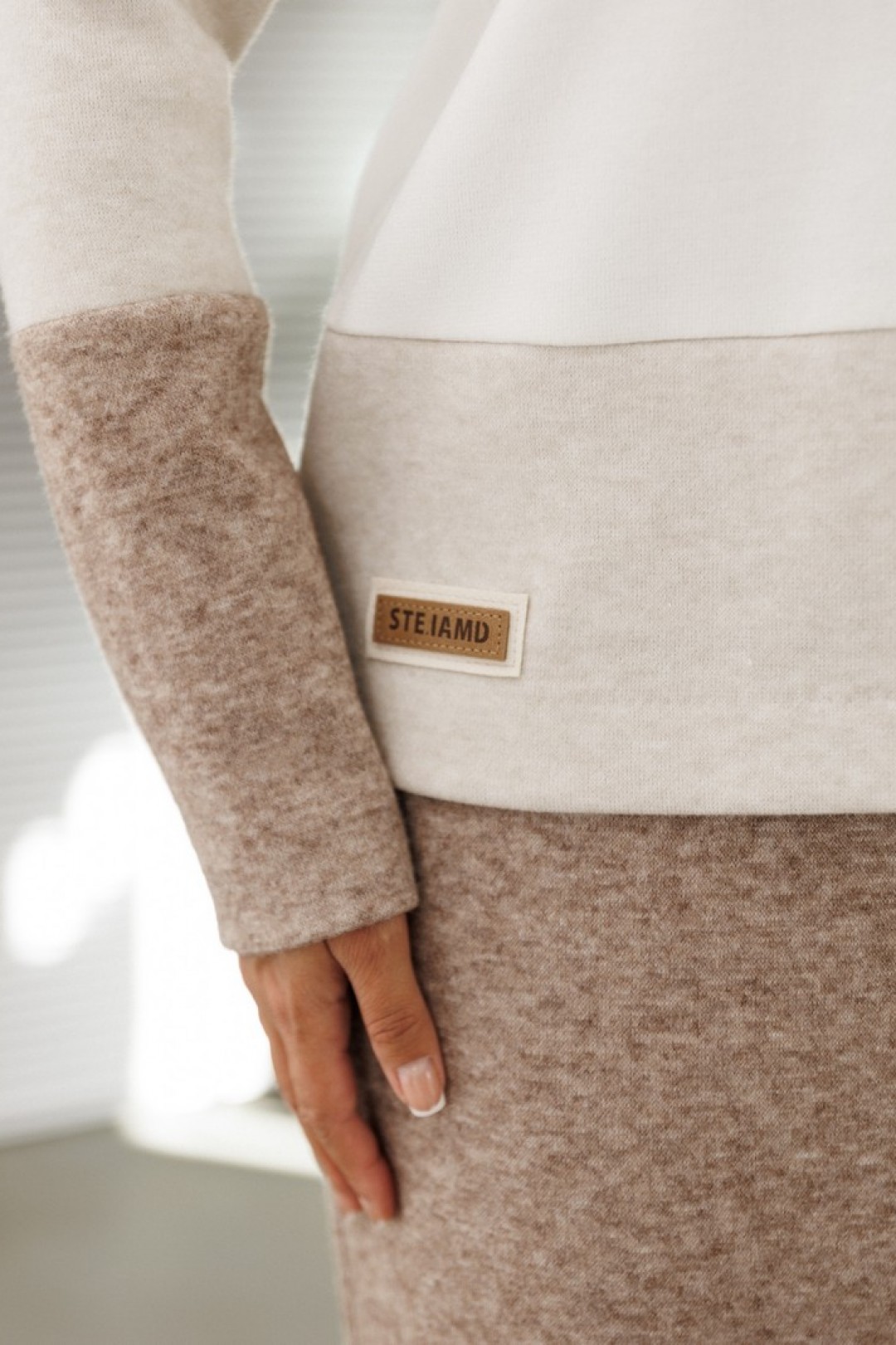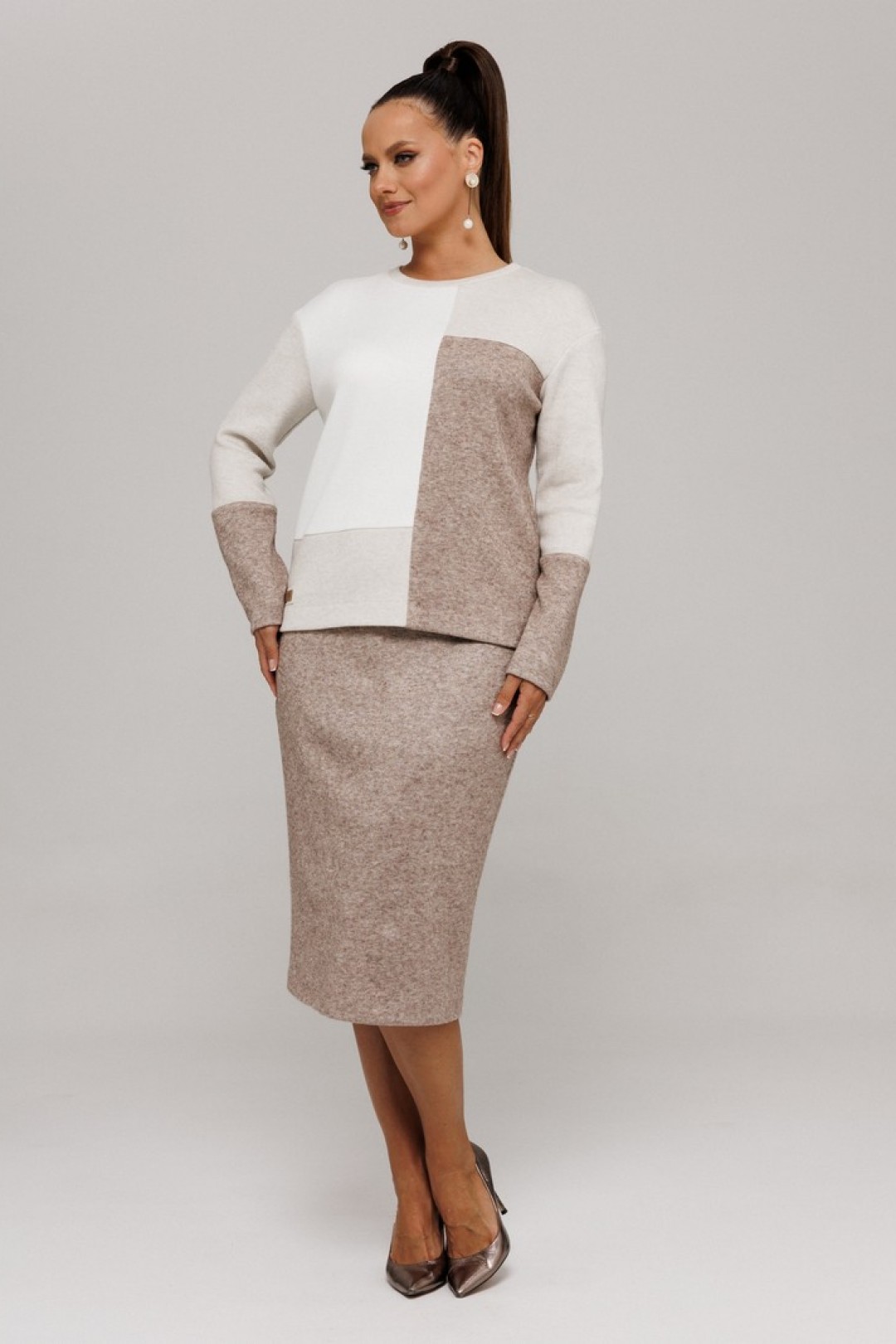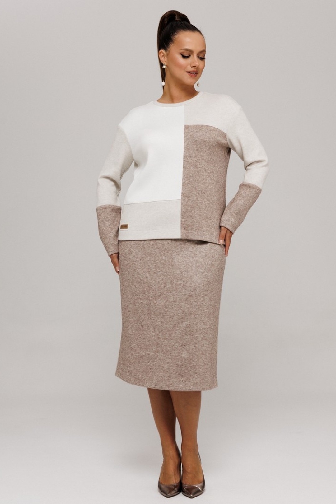 Идеальный костюм для осени, выполнен из высококачественного трикотажа в сочетании разных цветов одной фактуры. Мягкий трикотаж с плотной фактурой придает образу винтажный шарм, а натуральные материалы обеспечивают тактильные ощущения течение всего дня. Джемпер прямого силуэта, со спущенным рукавам, имеет дизайнерские членения по переду и рукавам. Горловина обработана планкой.