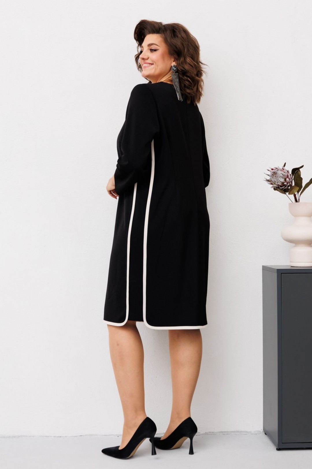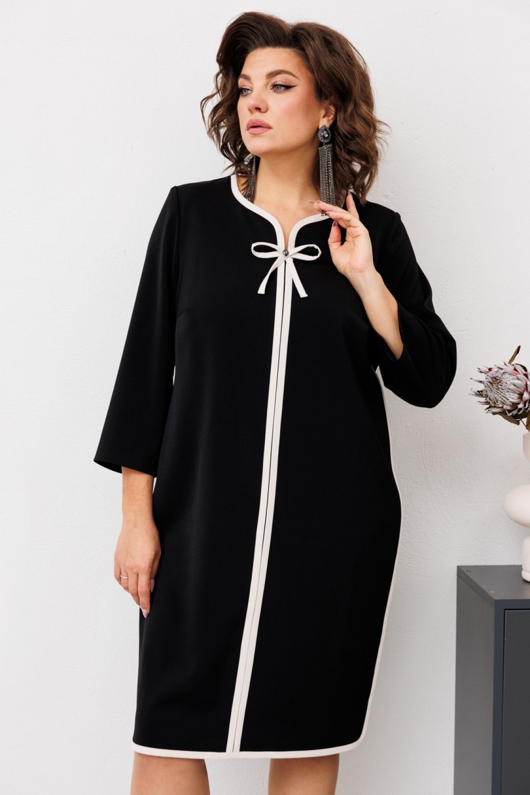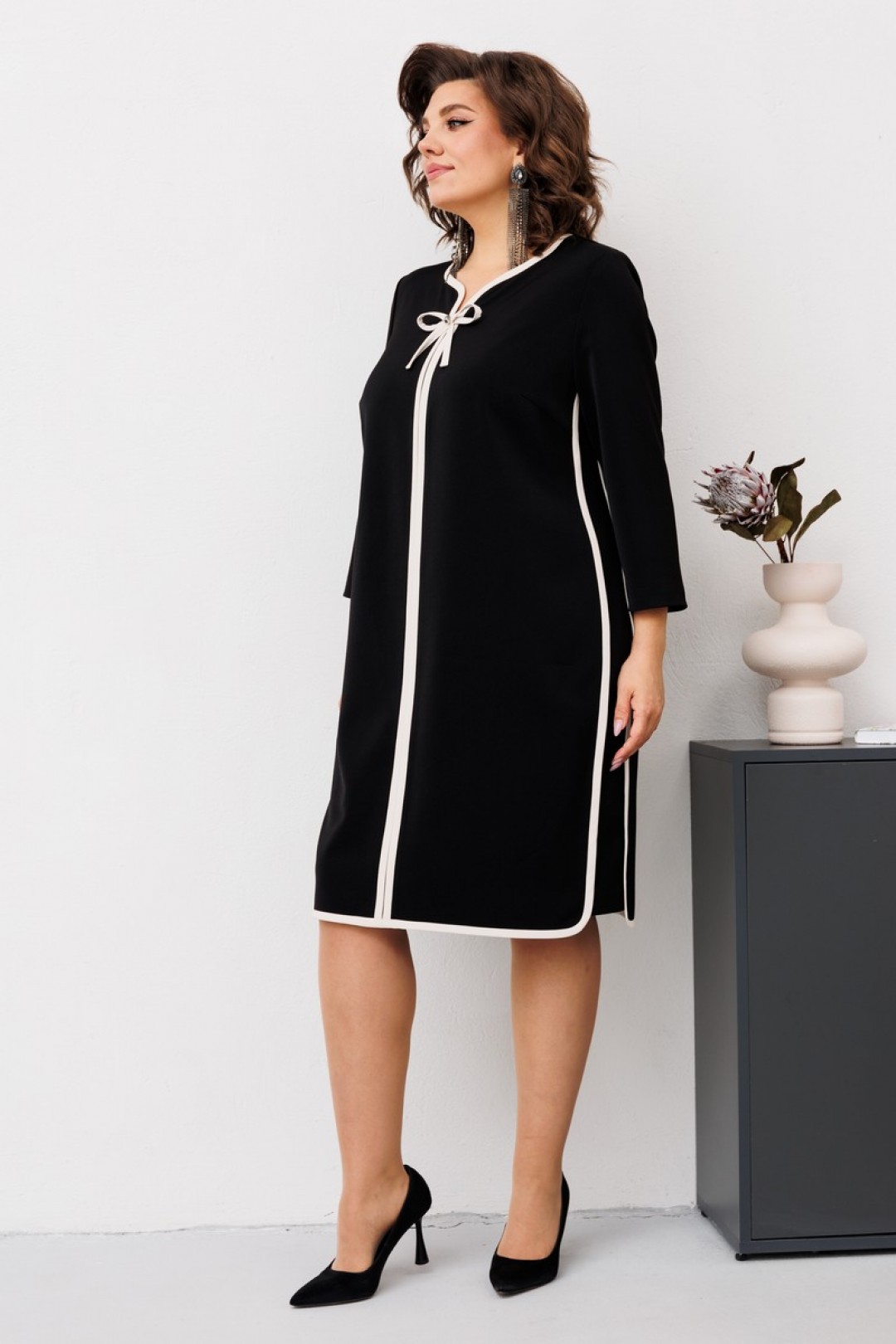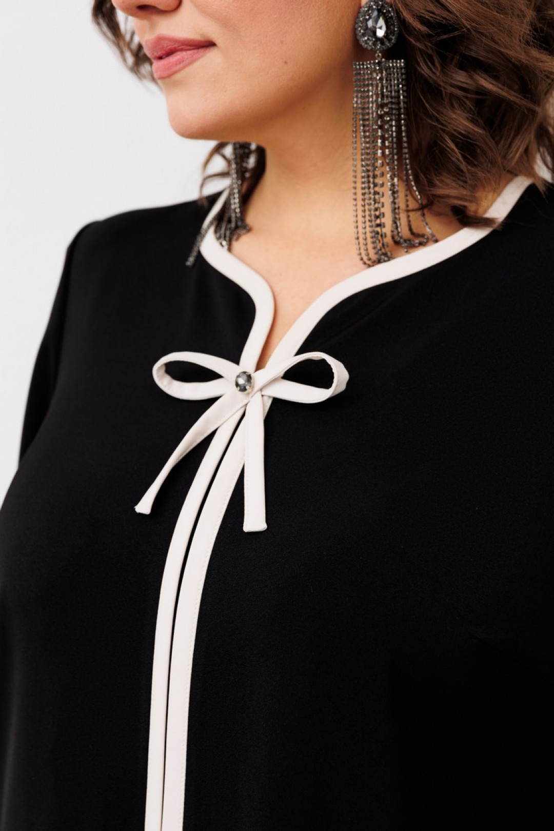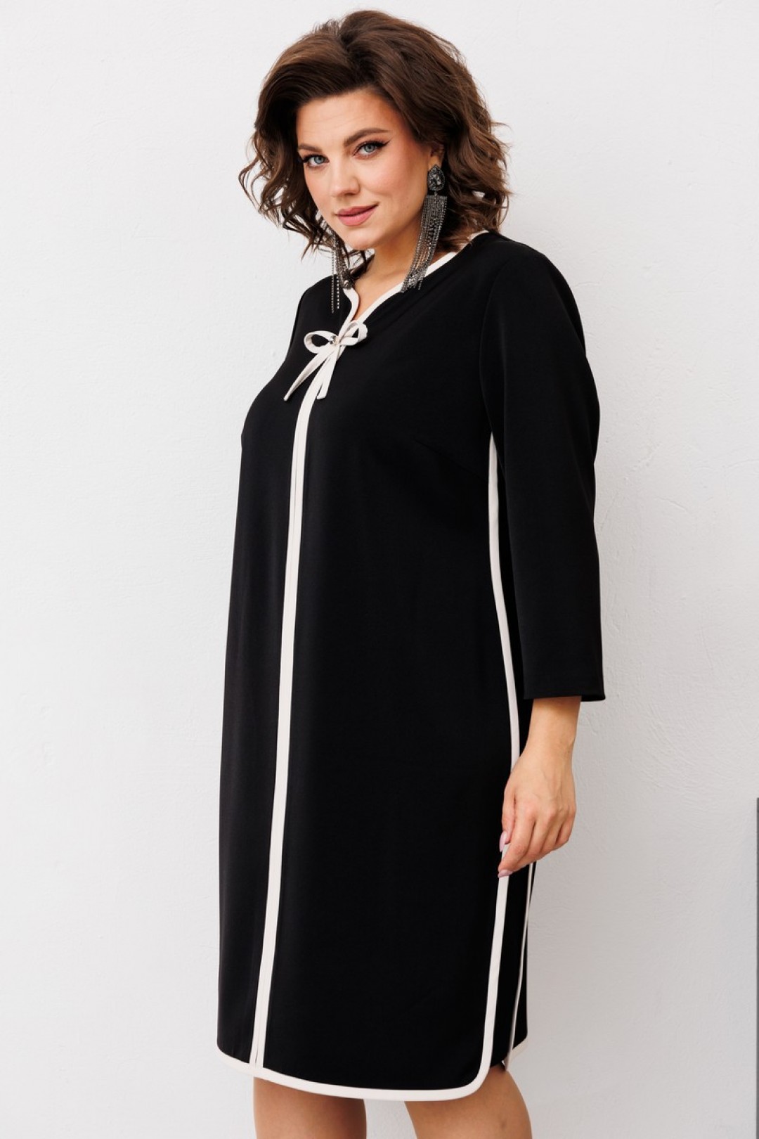Платье женское предназначено для повседневной носки. Платье женское, полу прилегающего силуэта, длиной за колено. Перед с2-мя нагрудными вытачками и средним швом. Спинка с 2-мя таллиевыми вытачками средним швом. Платье с отрезными бочками. Горловина фигурная. Срезы горловины переда, среднего шва переда, низа платья, боковые швы переда и спинки обработаны косой бейкой из отделочной ткани, ширина бейки 1,2 см. Вырез горловины декорирован пришивным бантом из отделочной ткани и пришивной стразой. Низ платья фигурный. Рукав втачной, одно шовный, длиной 7/8. Платье с плечевыми накладками.