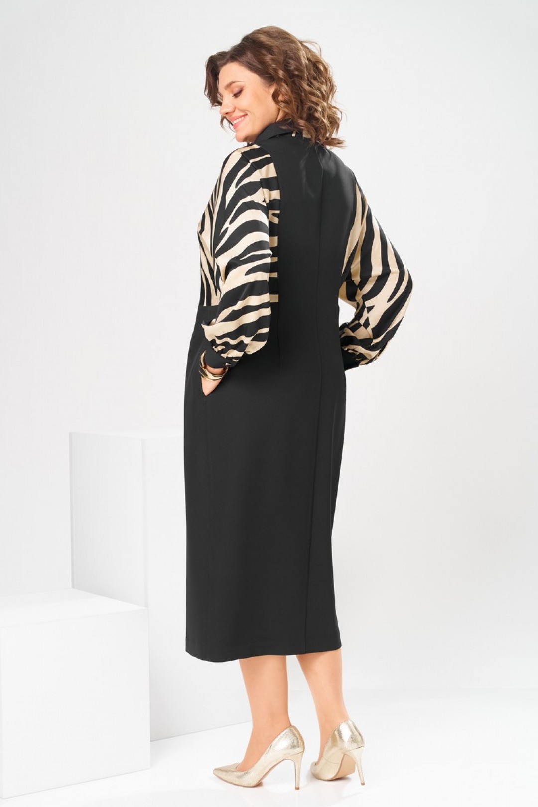 Платье женское прямого силуэта, предназначено для повседневной носки. Платье женское, прямого силуэта, длиной до середины икры. Перед с 2-мя отрезными бочками, с 2-мя вертикальными цельнокроеными планками. Спинка со средним швом, с 2-мя отрезными бочками, с 2-мя таллиевыми вытачками. Рукав длинный одно шовный, цельнокроеный с бочком переда и бочком спинки, рукав из отделочной ткани, внизу со сборкой и притачной манжетой с застёжкой на петлю обмётанную 1-ну и 1-ну пришивную пуговицу. Боковые швы с карманами. Горловина круглая с втачным воротником рубашечного типа с отрезной стойкой из отделочной ткани. Застёжка центральная на 8-мь вертикально обмётанных петель и 8-мь пришивных пуговиц. Платье без плечевых накладок.