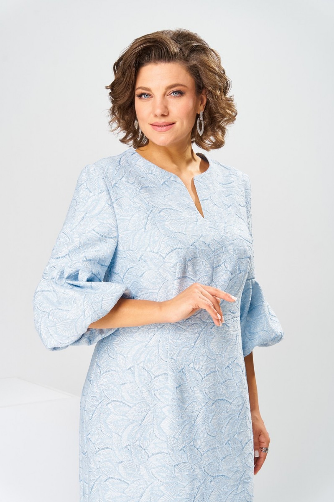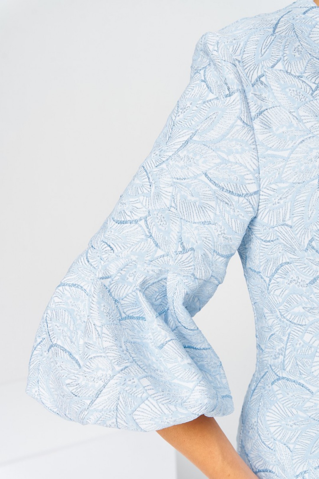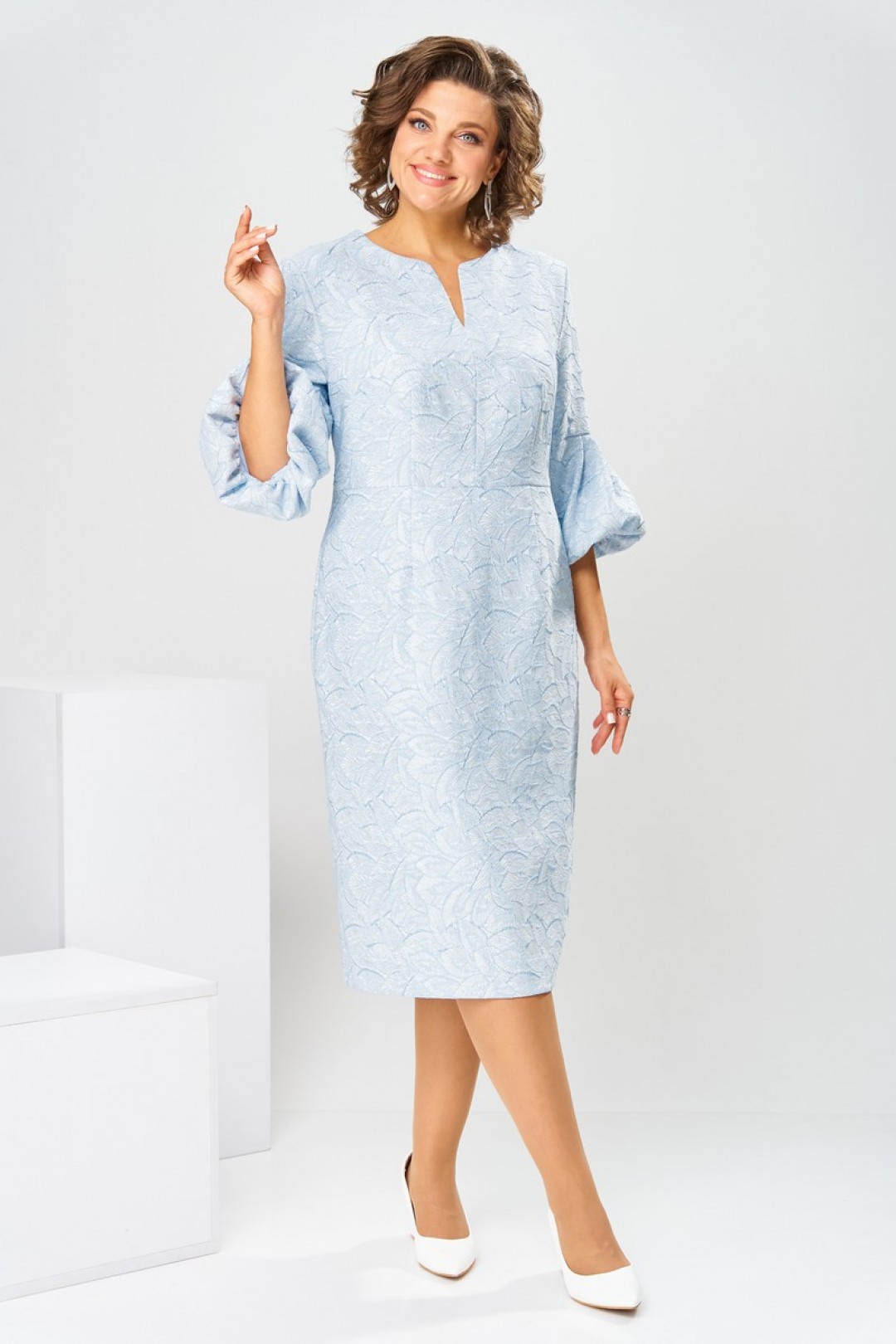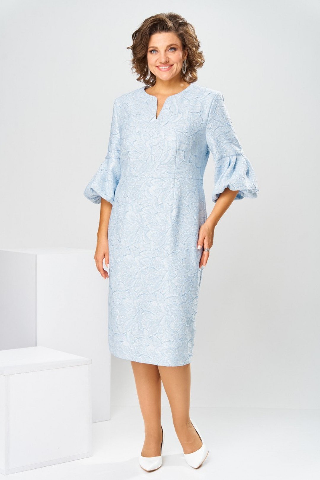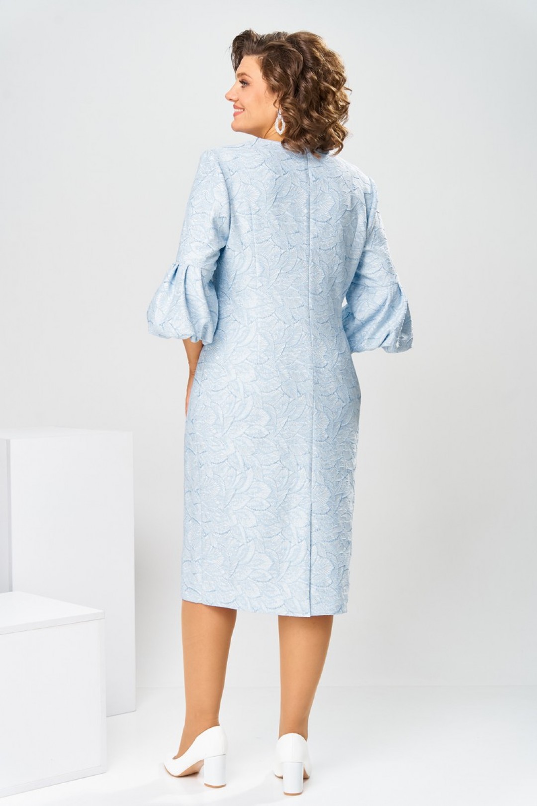 Платье женское, относится к торжественной нарядной одежде. Платье женское, полу прилегающего силуэта, длиной ниже колена. Перед отрезной по линии талии. Верхняя часть переда со средним швом и 2-мя таллиевыми вытачками, нижняя часть с 2-мя таллиевыми вытачками. Спинка с 2-мя таллиевыми вытачками и средним швом, заканчивающимся шлицей. Горловина фигурная, обточная, без воротника. Застёжка на потайную тесьму-молнию в среднем шве спинки. Рукав втачной, одно шовный, длиной 3/4, с горизонтальным разрезом, нижняя часть рукава с 5-ю односторонними складками, со сборкой по низу, низ обточной. Платье на подкладке с плечевыми накладками.