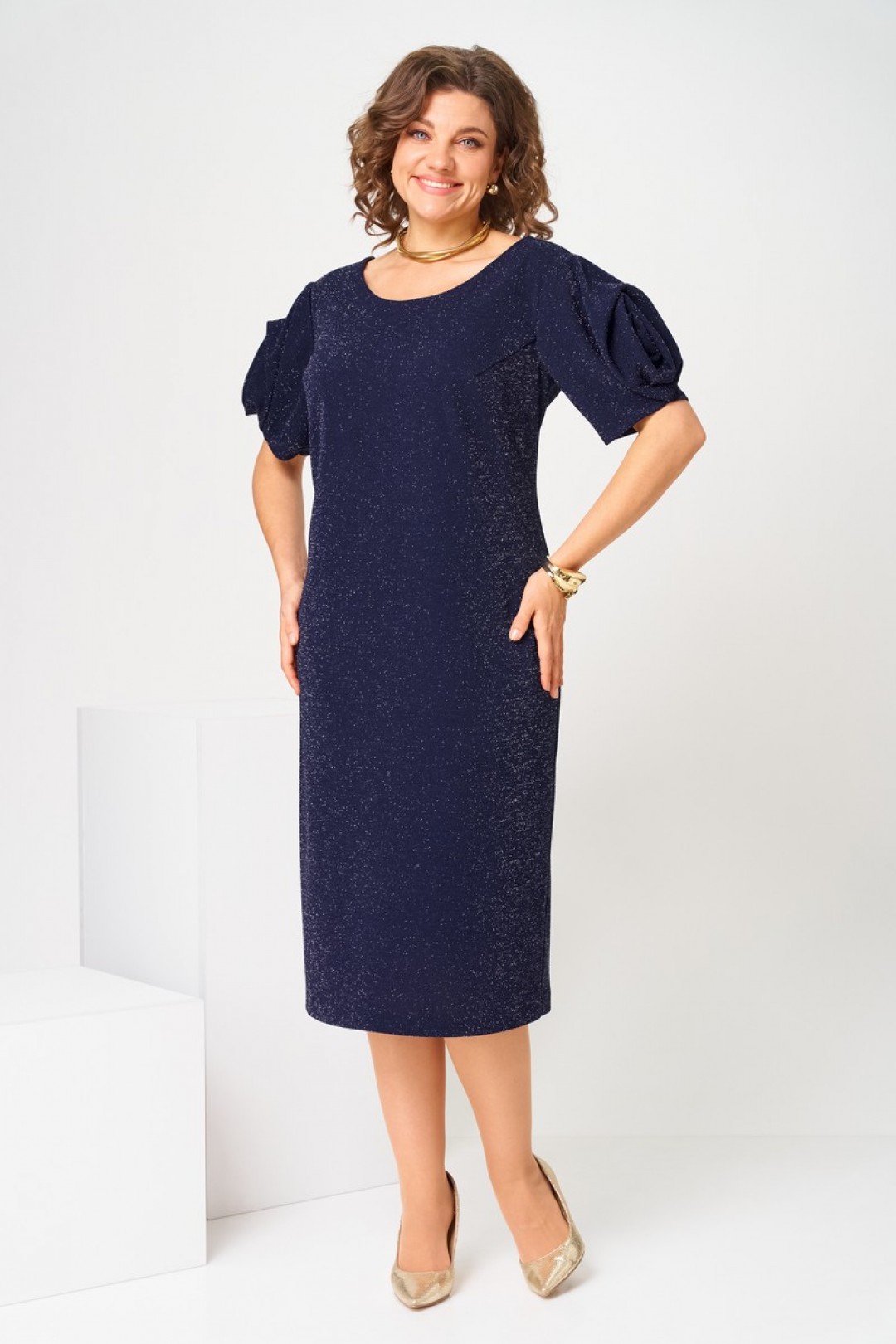 Платье женское, предназначено к нарядной торжественной одежде. Платье женское, полу прилегающего силуэта, длиной ниже колен. Перед с 2-мя нагрудными вытачками. Спинка с 2-мя таллиевыми вытачками, со средним швом, заканчивающимся шлицей. Горловина круглая, обточная, без воротника. Застёжка на потайную тесьму молнию в среднем шве спинки. Рукав втачной одно шовный, короткий, с обтачным низом, на подкладке. Рукав декоррирован цветком. Платье на подкладке. Платье с плечевыми накладками.