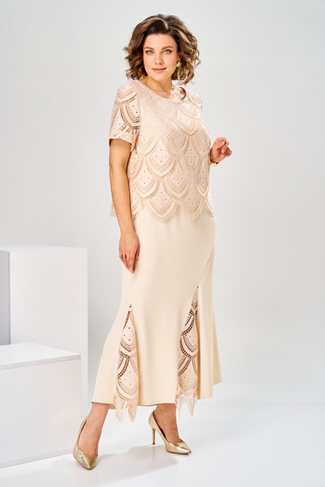 Платье относится к нарядной торжественной одежде. Платье женское, полу прилегающего силуэта, длиной до нижней части икры, расширенное к низу, выполнено в виде имитации костюма. Перед с 2-мя нагрудными вытачками, с отлетной верхней частью из отделочной ткани, с отрезным бочком в левой нижней части платья; шов соединения с треугольной вставкой из отделочной ткани, такими же вставками декорированы и боковые швы. Спинка со средним швом и 2-мя таллиевыми вытачками с отлетной верхней частью из отделочной ткани. Горловина круглая, обточная, без воротника. Рукав короткий, втачной, одно шовный, из отделочной ткани. Платье без плечевых накладок.
