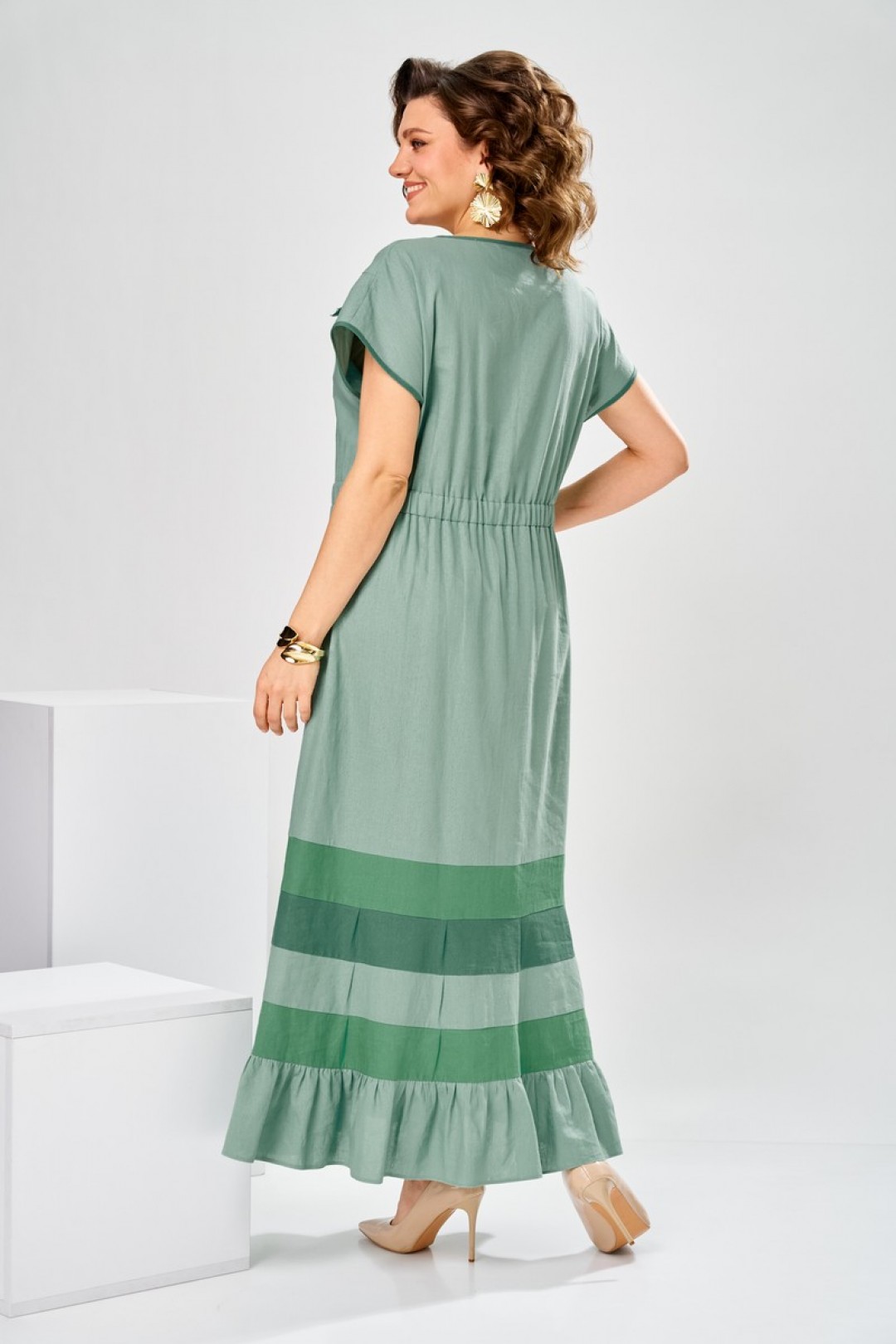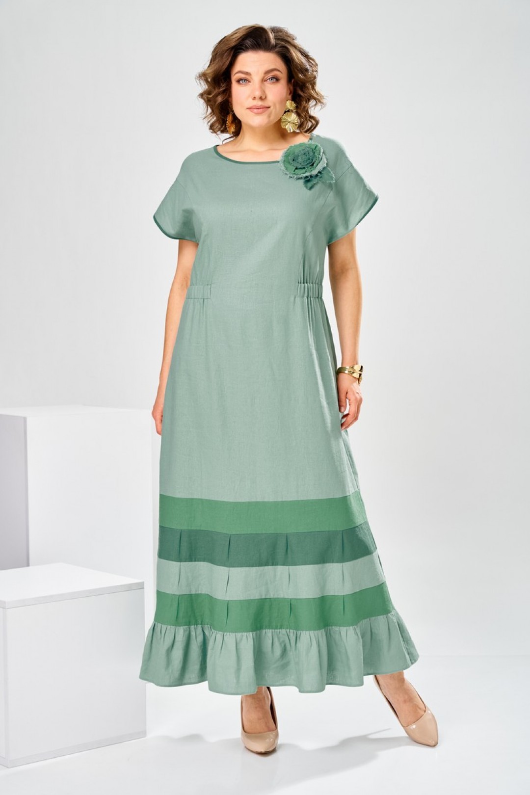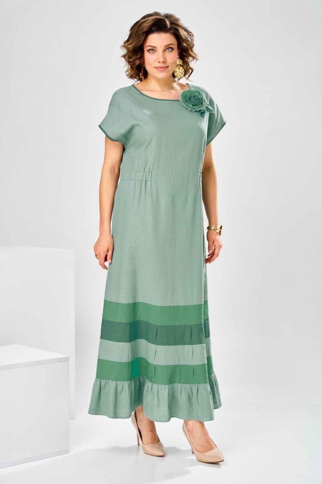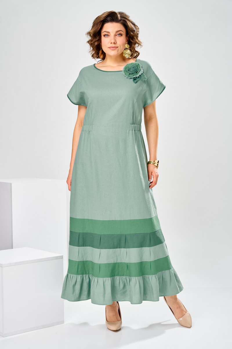 Платье женское, предназначено для повседневной носки. , так же может использоваться как нарядная одежда. Платье женское, длинное, слегка расширенное к низу. Перед с 2-мя отрезными бочками от подреза на уровне линии талии. Спинка отрезная по линии талии. Шов соединения деталей платья платья по линии талии с надстрочной кулисой собранной на эластичную тесьму. Низ платья с 4-мя горизонтальными притачными планками, чередующимися по цвету, на 3-х планках по 4-и односторонних маленьких складки по переду и спинки, формирующими расширение к низу. Низ платья с притачным воланам, с лёгкой сборкой по верхнему срезу. Горловина круглая, без воротника. Рукав цельнокроеный, короткий. Горловина и низ рукава обработаны косой бейкой. Платье со съёмным украшением. Платье без плечевых накладок.