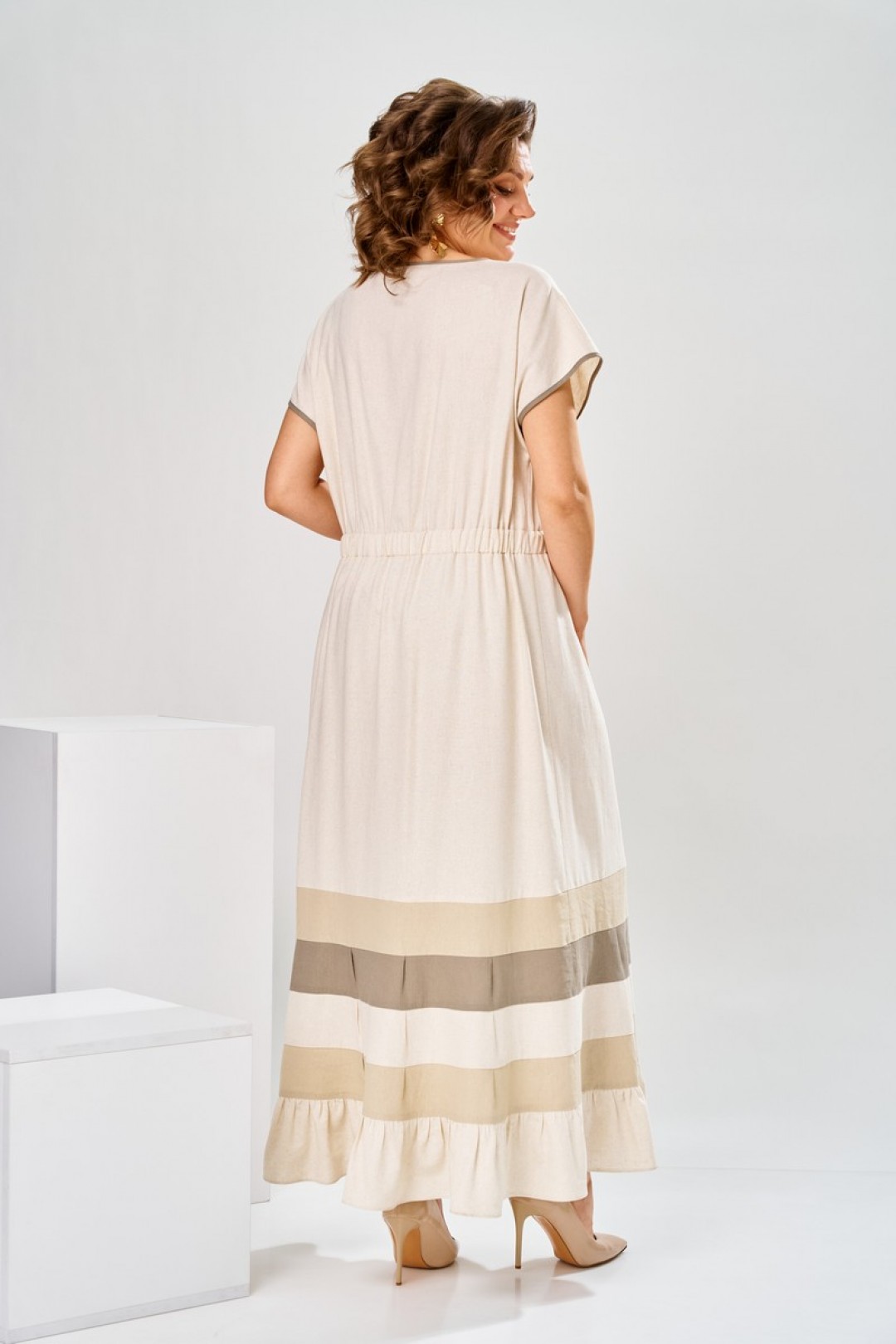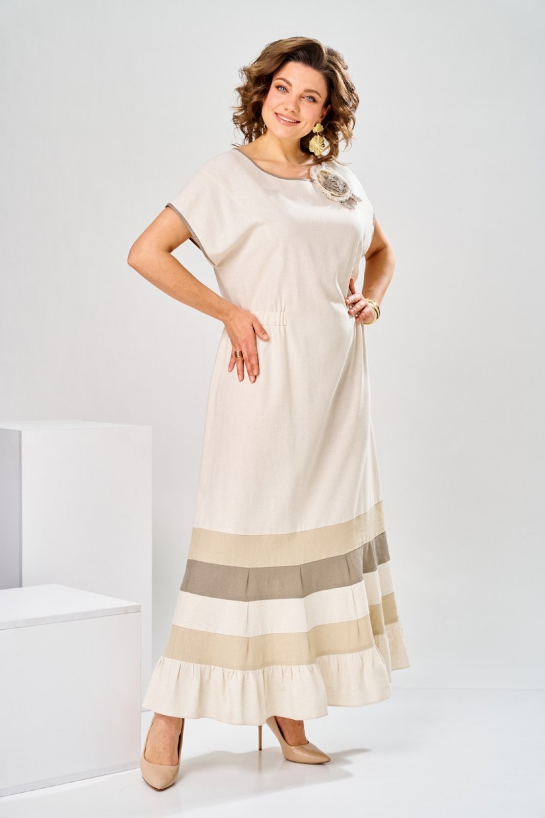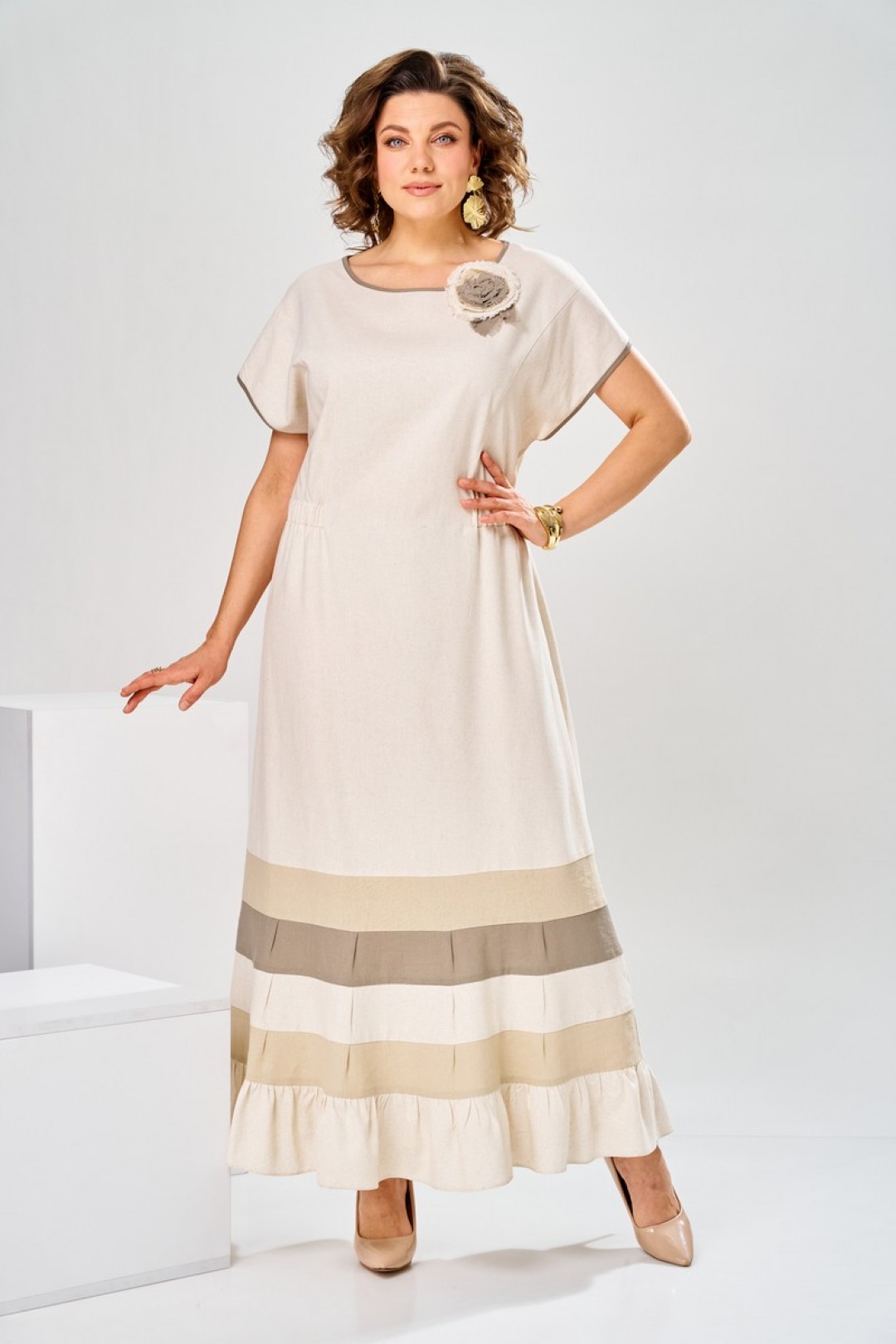 Платье женское, предназначено для повседневной носки. , так же может использоваться как нарядная одежда. Платье женское, длинное, слегка расширенное к низу. Перед с 2-мя отрезными бочками от подреза на уровне линии талии. Спинка отрезная по линии талии. Шов соединения деталей платья платья по линии талии с надстрочной кулисой собранной на эластичную тесьму. Низ платья с 4-мя горизонтальными притачными планками, чередующимися по цвету, на 3-х планках по 4-и односторонних маленьких складки по переду и спинки, формирующими расширение к низу. Низ платья с притачным воланам, с лёгкой сборкой по верхнему срезу. Горловина круглая, без воротника. Рукав цельнокроеный, короткий. Горловина и низ рукава обработаны косой бейкой. Платье со съёмным украшением. Платье без плечевых накладок.