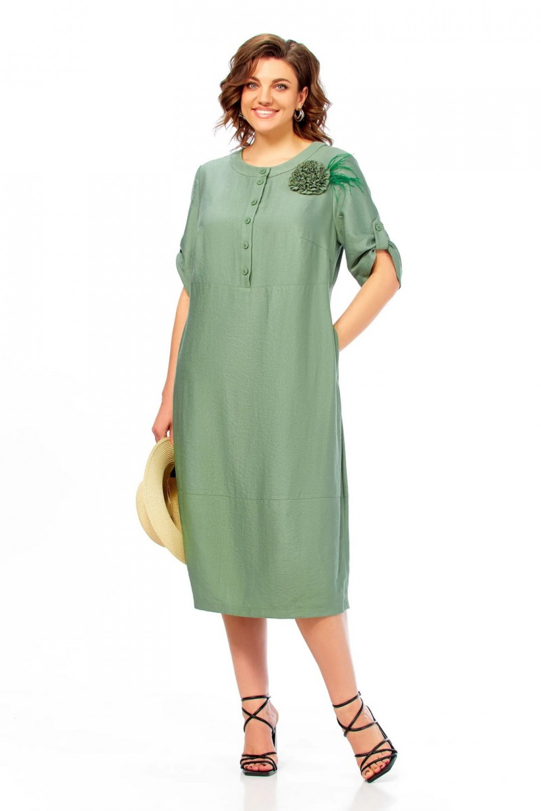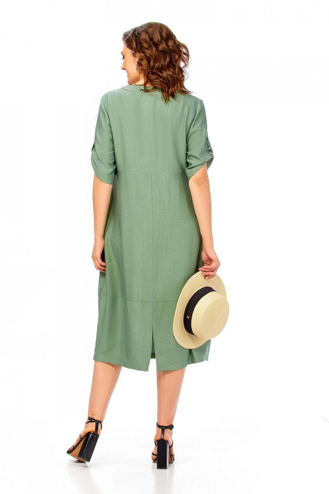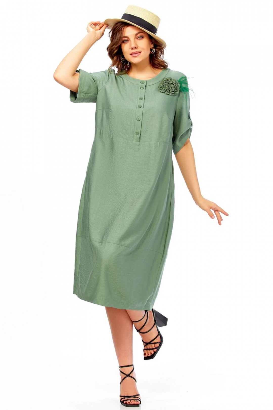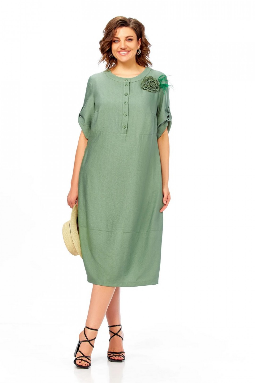 Платье женское, свободного силуэта с втачным рукавом, длина которого регулируется патой. Вырез горловины округлый, обработан притачной бейкой. По линии груди горизонтальный подрез. Застежка на полочке, на петли и пуговицы до подреза. Карманы в боковых швах. Декоративная брошь ручной работы в виде цветка.