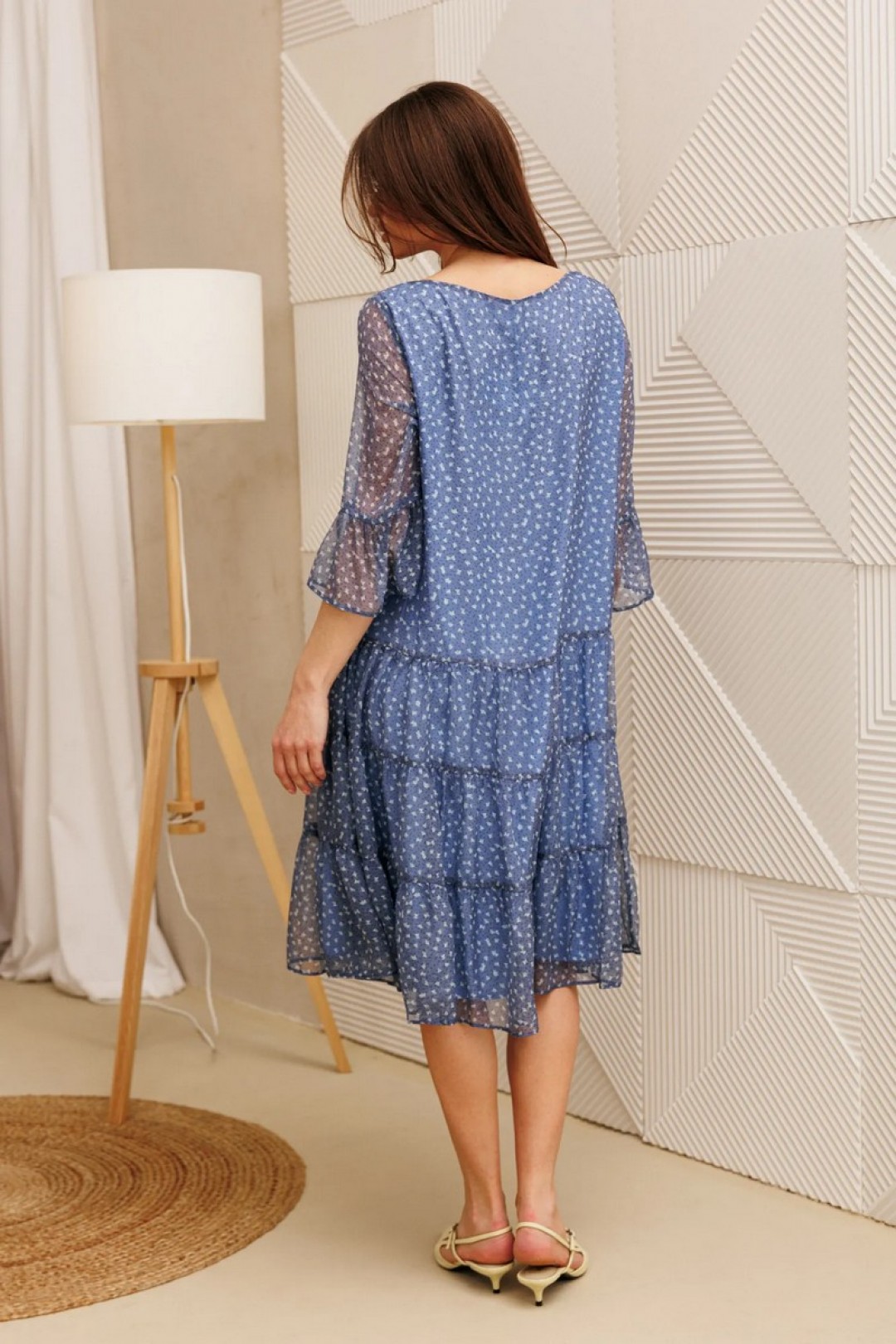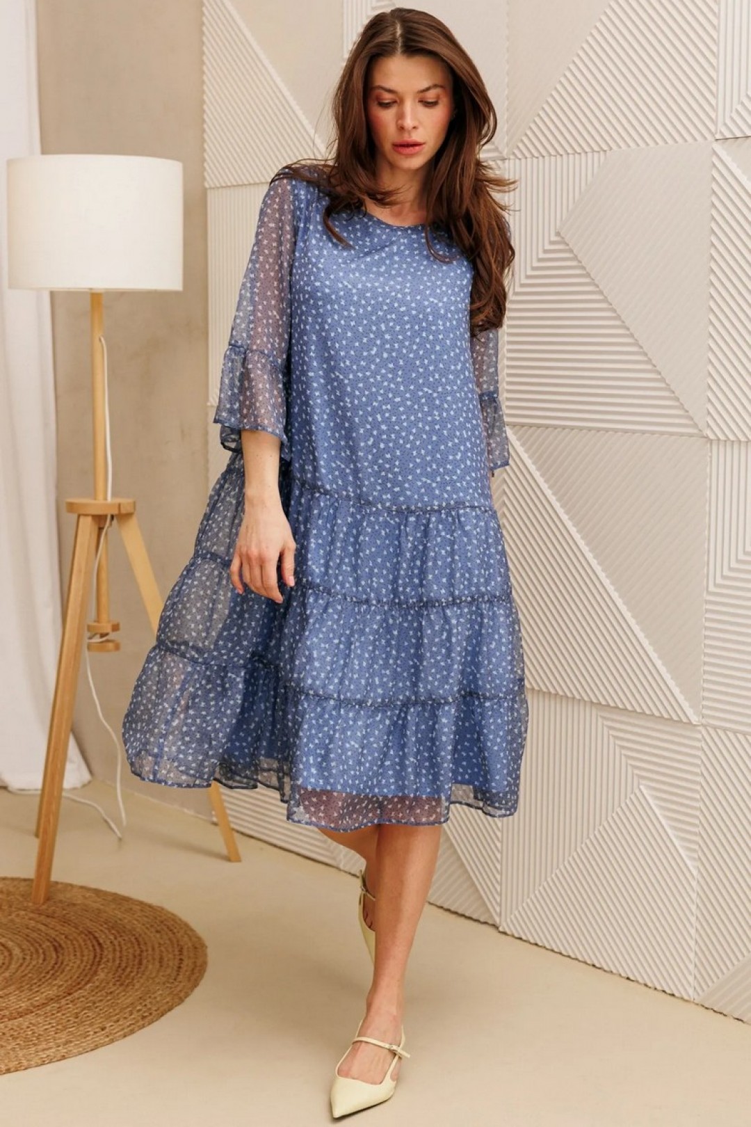 Стильное платье от бренда Anastasia - идеальный выбор для офиса, на прогулку для повседневной носки и для торжества. Платье шифоновое больших размеров идеально подойдет на носку под сапоги так и под босоножки. Наше платье для женщин с размером плюс, в меру закрытое и широкое, подойдет на любую фигуру. Стройнит. Свободный крой, рукав расширенный на сборке, длина миди подойдет для высоких и невысоких дам. Идеально на работу в офис, повседневное или на торжественное событие, на выход, корпоратив. Стильная и легкая, базовая модель, горловина удобного покроя-лодочка. Неброский принт делает его подходящим нарядом для похода в театр, на юбилей бабушки, в ресторан. Идеально для беременных. Модель трапециевидной формы с 3-мя воланами. Рукав 3/4 длины также с воланом. Вырез горловины в форме лодочки.