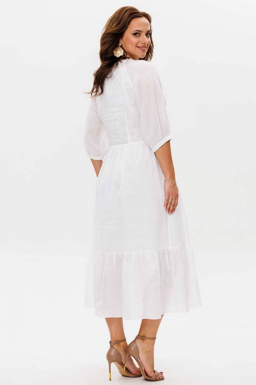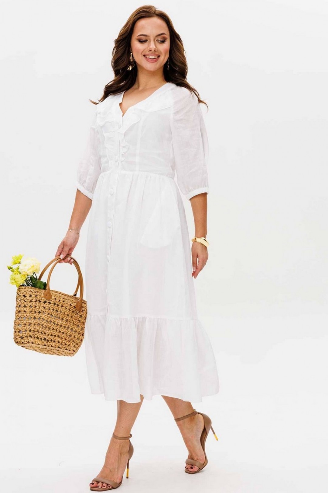 Описание:Платье женское полуприлегающего силуэта, отрезное по талии, отрезная присборенная рюша по низу изделия. Вдоль горловины притачная планка. Застежка по переду на петли-пуговицы. В области груди, частично по переду вдоль планки, обработаны рюшки. Рукав-реглан, по низу на резинке. Платье на подкладке, карманы в боковых швах.