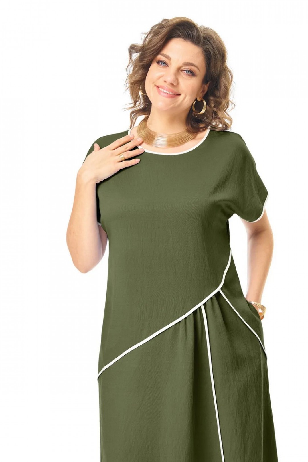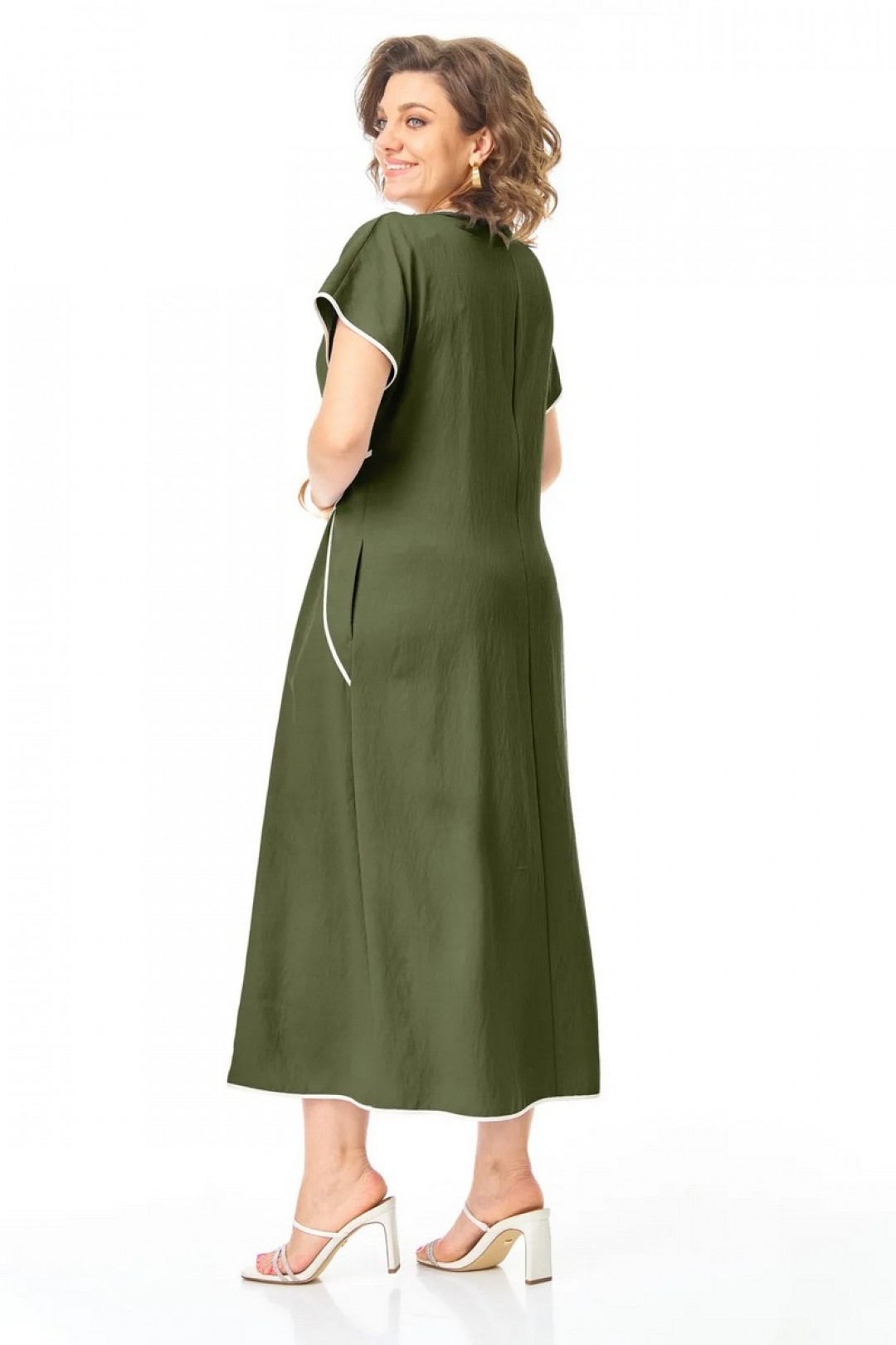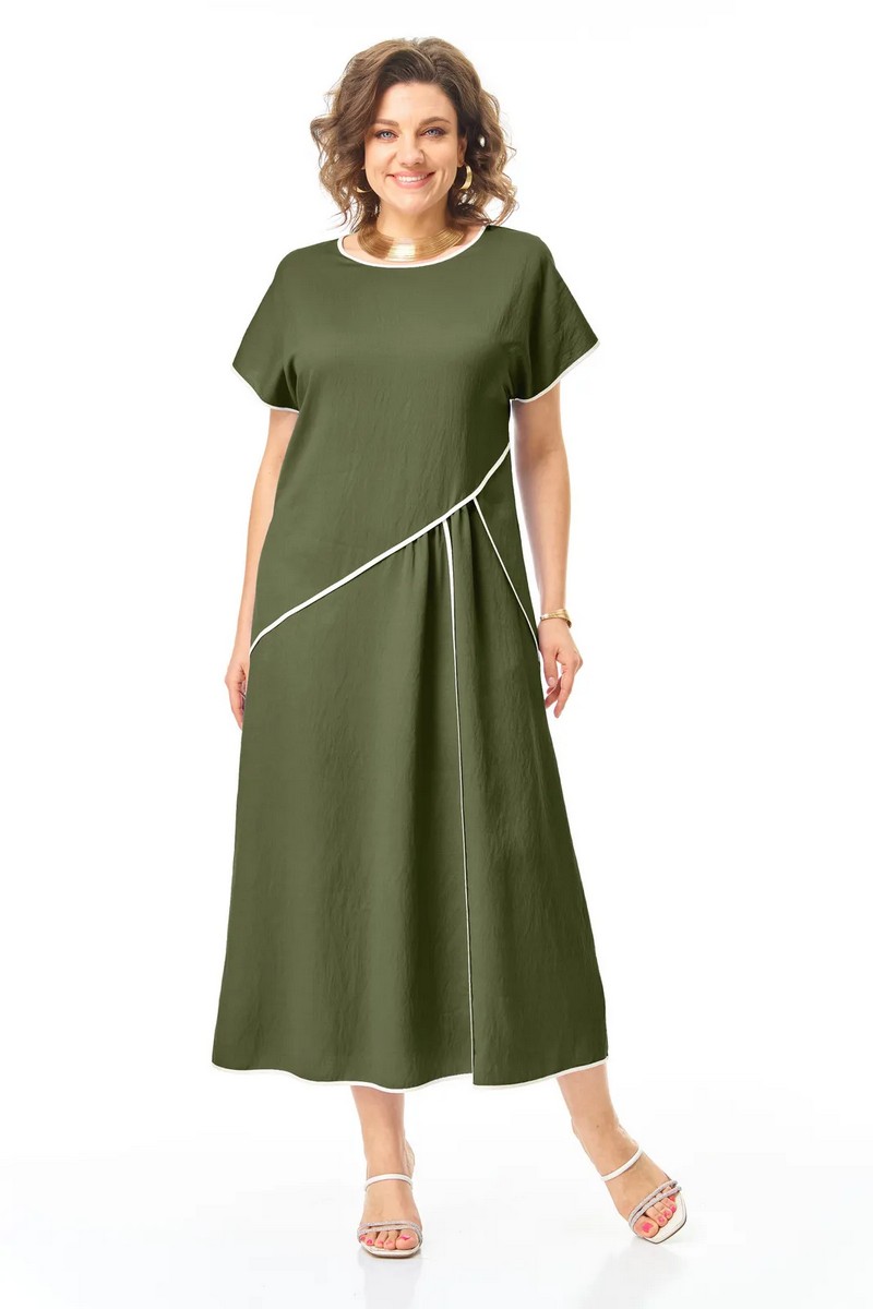 Платье женское А-образного силуэта со спущенной линией плеча. Рукав типа "летучая мышь". Горловина округлой формы. В среднем шве спинки застежка на тесьму-молнию. По переду выполнен ряд ассиметричных подрезов с кантами контрастного цвета и легкая сборка. В боковых швах обработаны карманы.