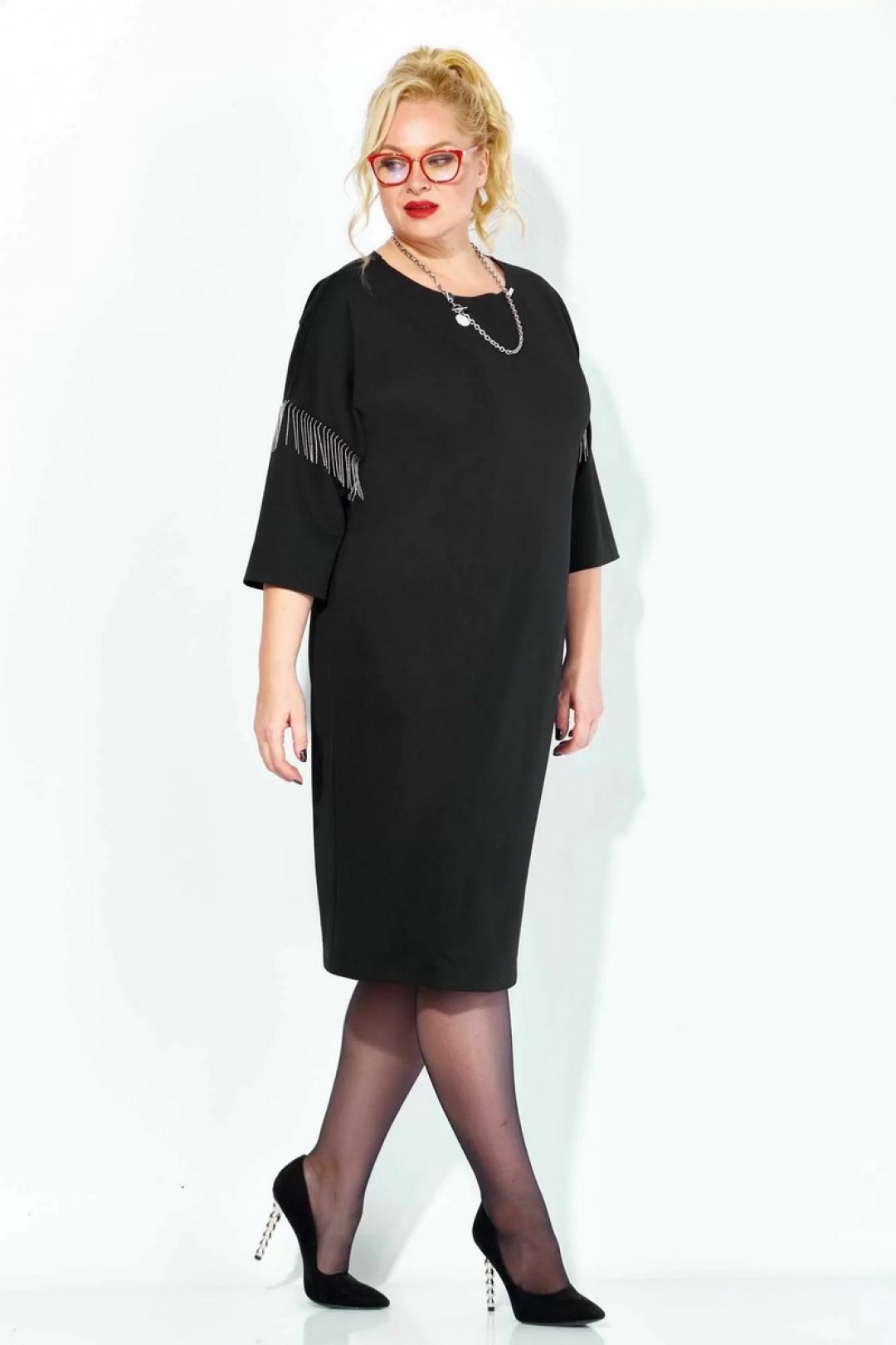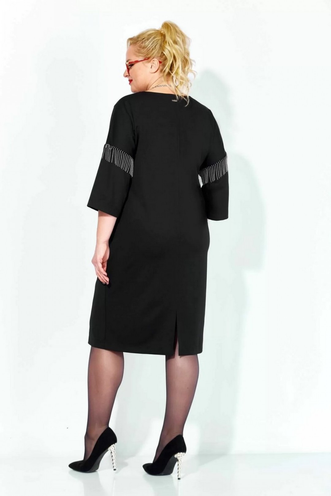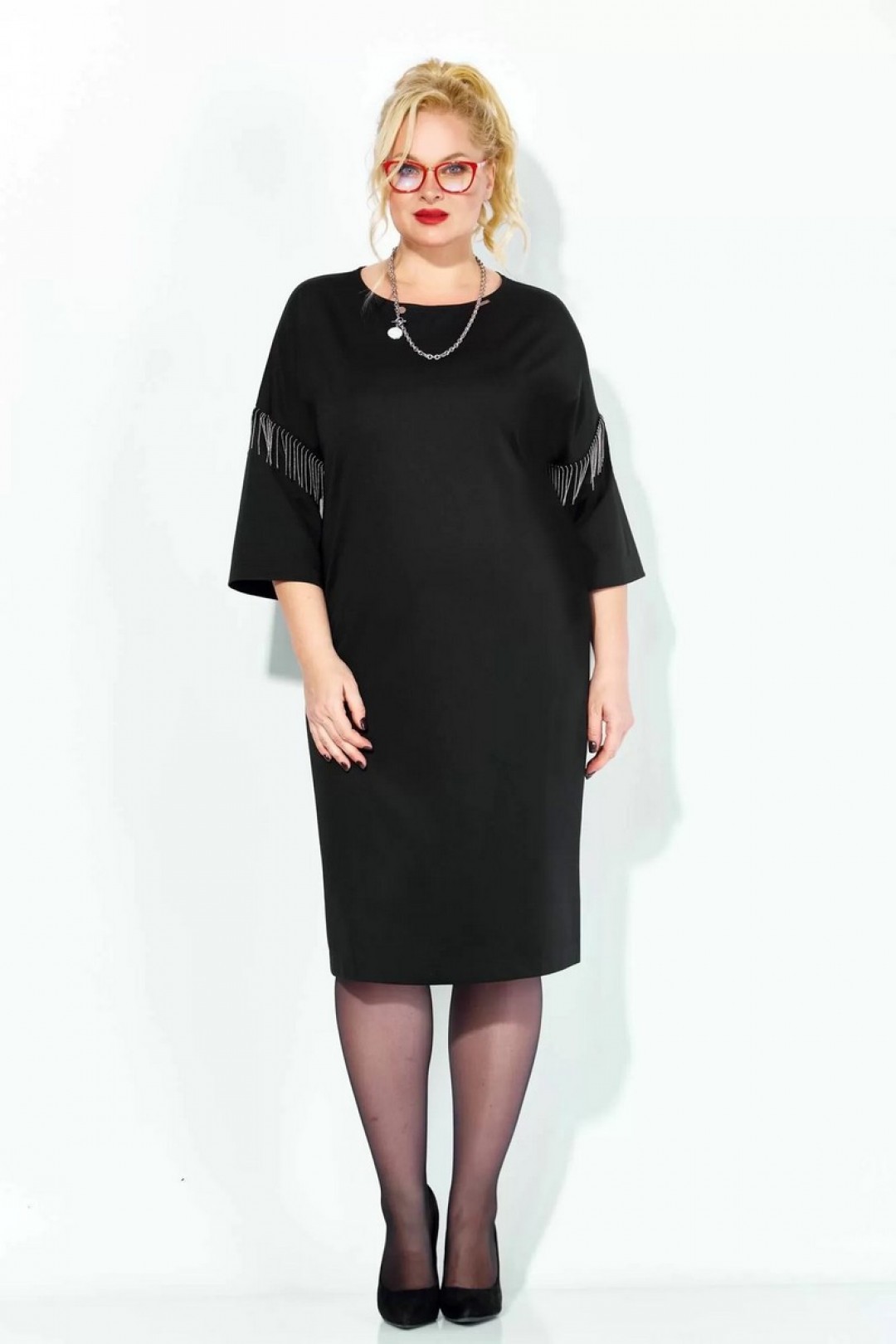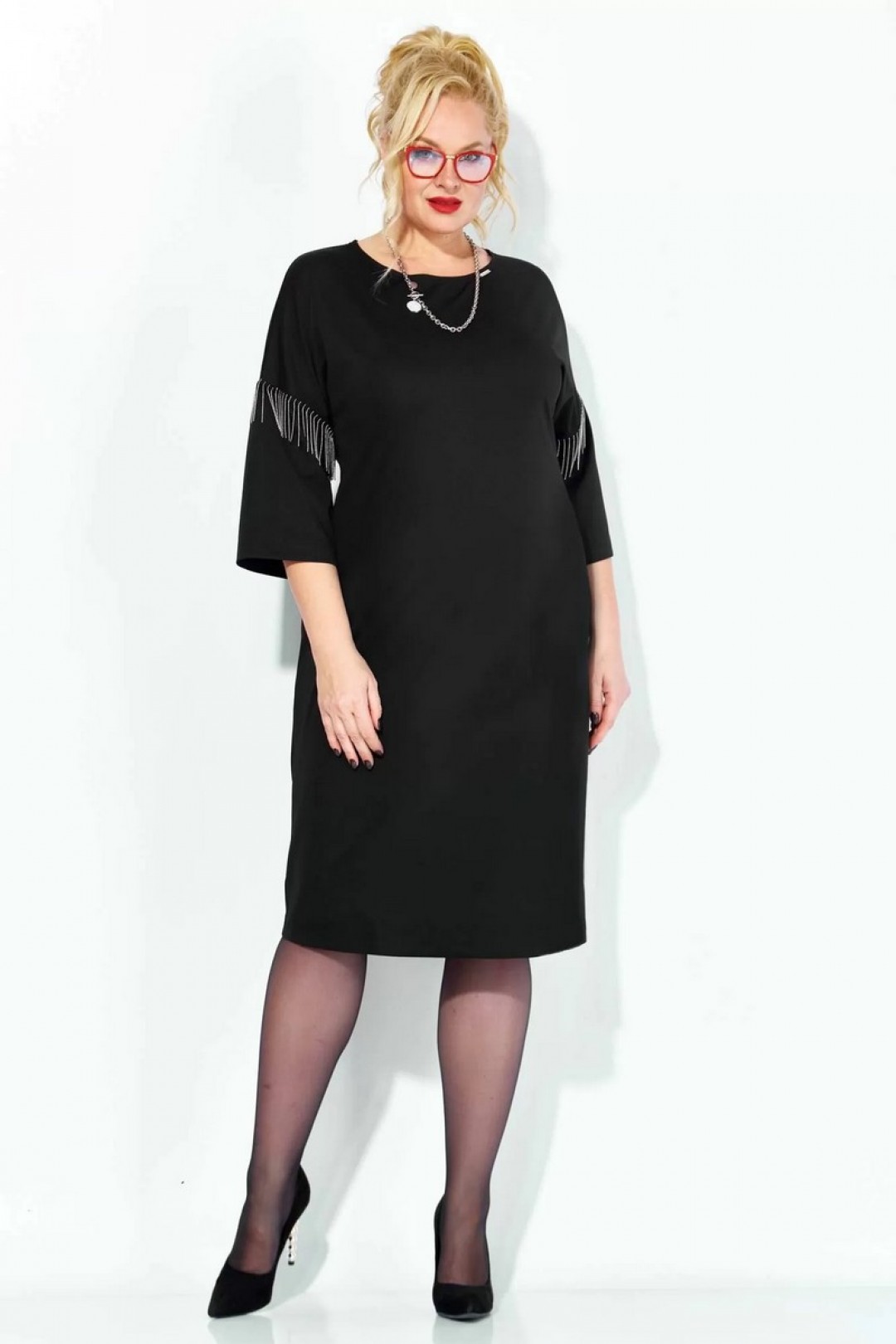 Черное платье миди — не просто одежда, это заявление о вашем стиле и вкусе. Элегантное праздничное платье прямного силуэта из трикотажного полотна. Ткань не мнется. Благодаря своему крою подойдёт для разных типов фигуры. Оно подчеркнёт вашу индивидуальность и станет отличным дополнением к вашему гардеробу. В нём вы будете чувствовать себя уверенно и комфортно, зная, что выглядите на все сто. Выбирая его, вы выбираете качество, комфорт и стиль. Классическое черное платье прямого силуэта, со спущенным плечом. Такое платье незаменимая вещь в любом гардеробе. В качестве декора металлизированная бахрома на рукавах, брендированная нашивака на горловине и спинке. По спинке идет средний шов. Такое платье незаменимая вещь в любом гардеробе. Рекомендуется носить на черное белье.