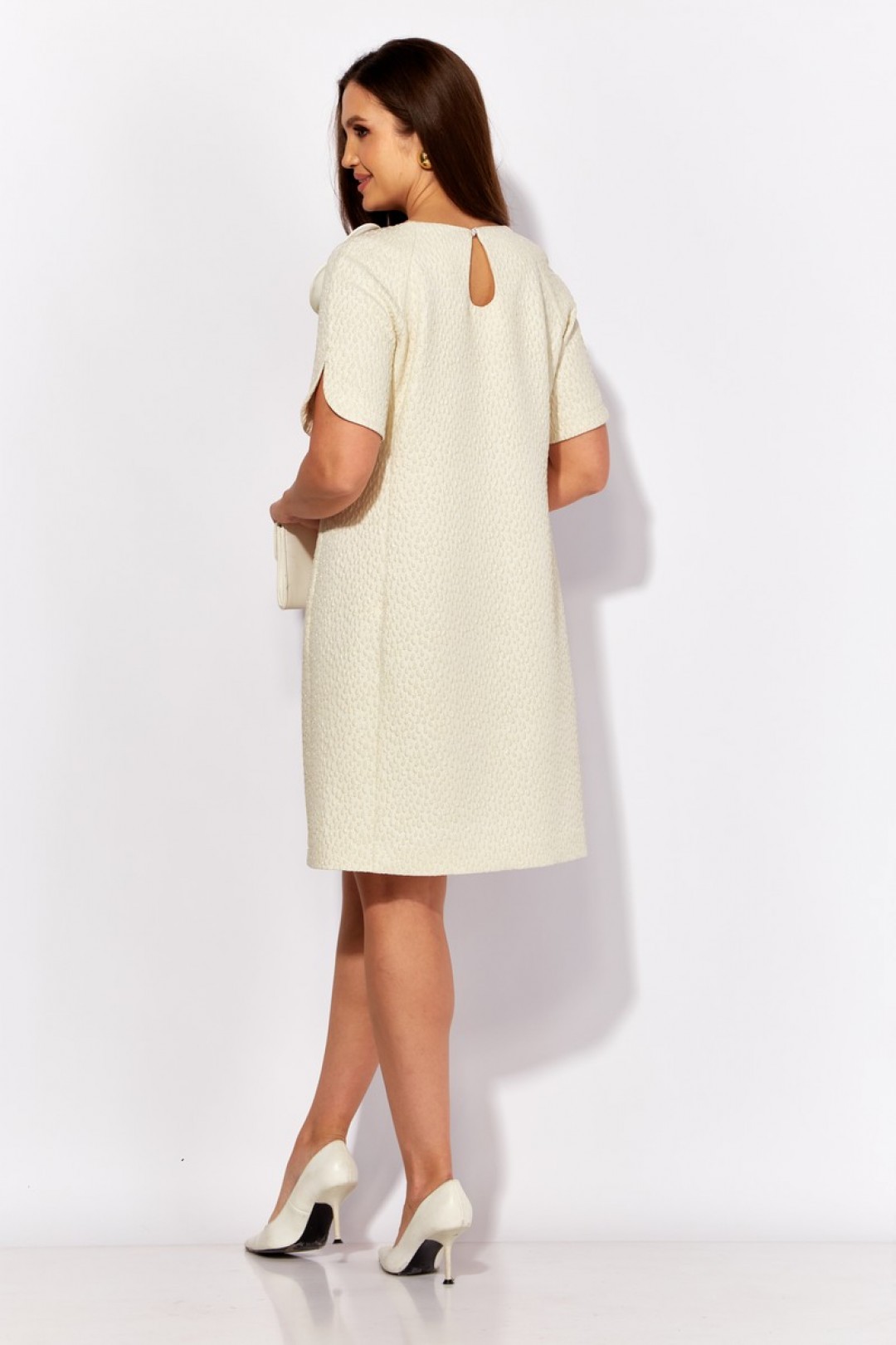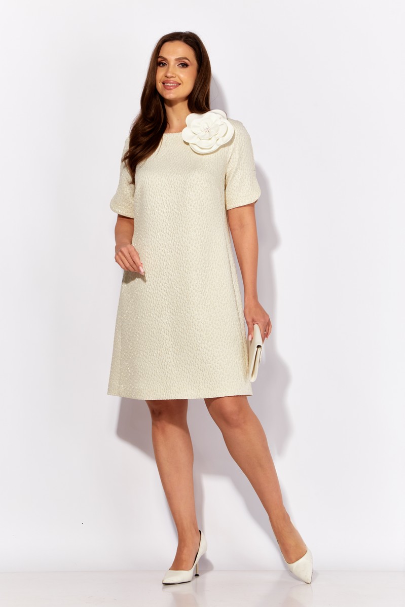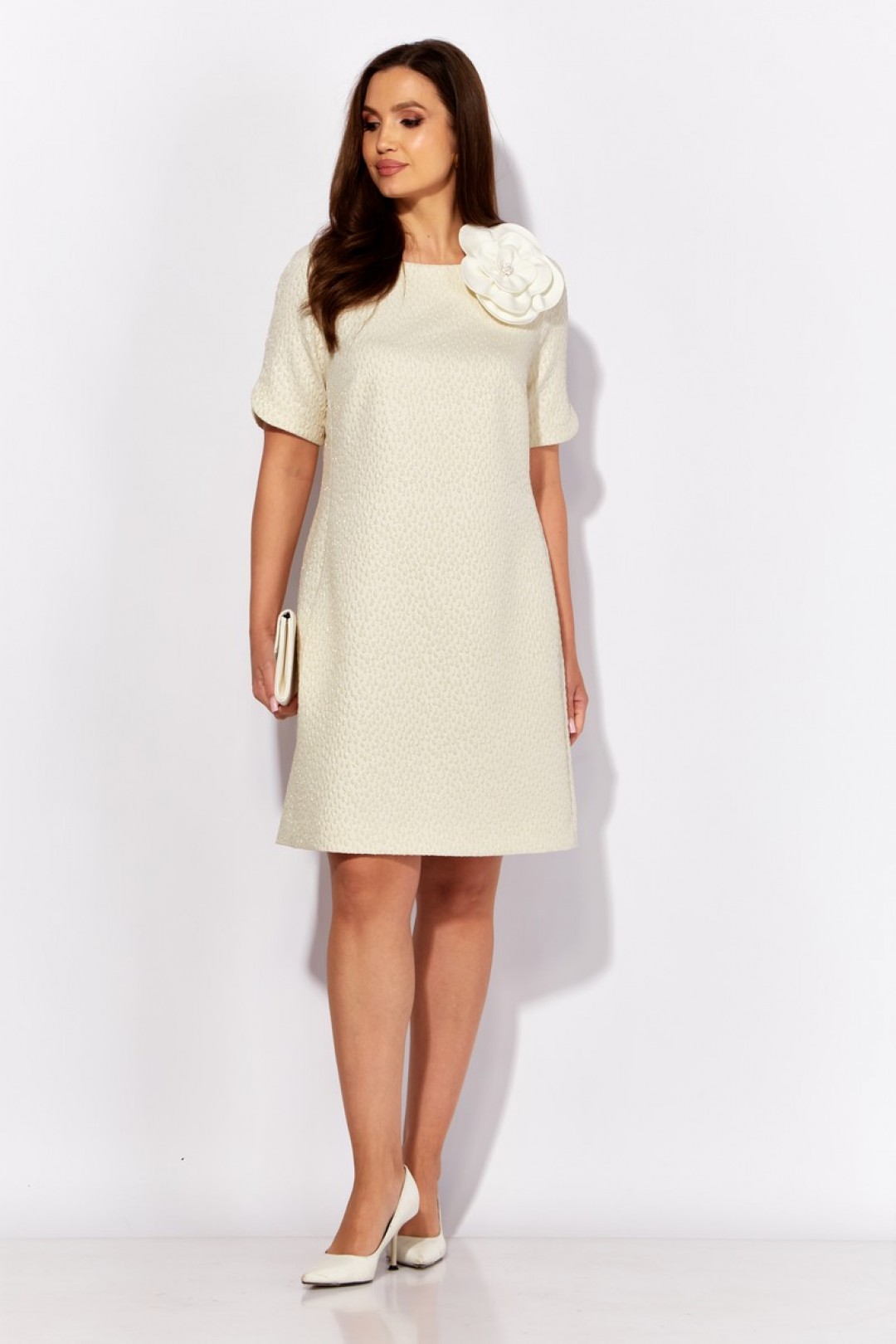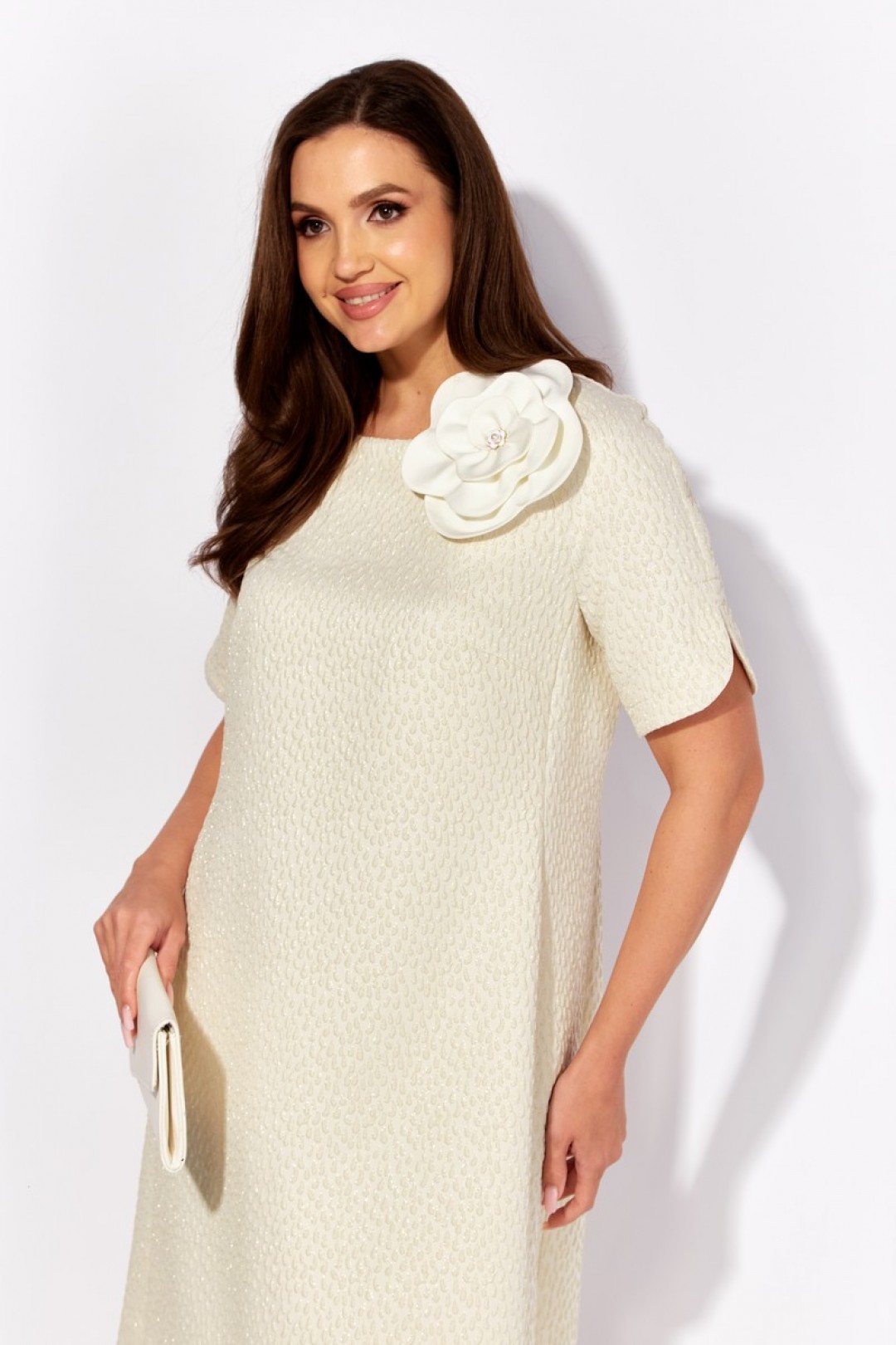 Описание:Платье женское, А силуэта с коротким рукаквом. Рукав покроя "реглан" с фигурным разрезом. Вырез горловины круглой формы. По спинке застежка на навесную петлю и пуговицу и вырез "капля" Силуэтность платью придают рельефы переда и спинки с цельнокройными бочками. Декором служит съемный цветок из отделочной ткани.
