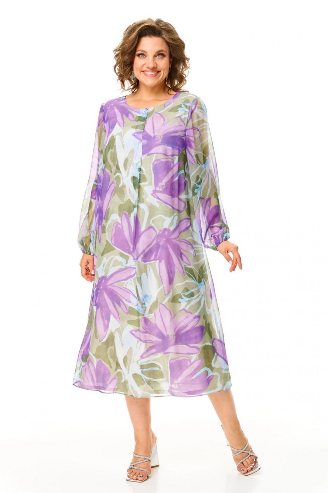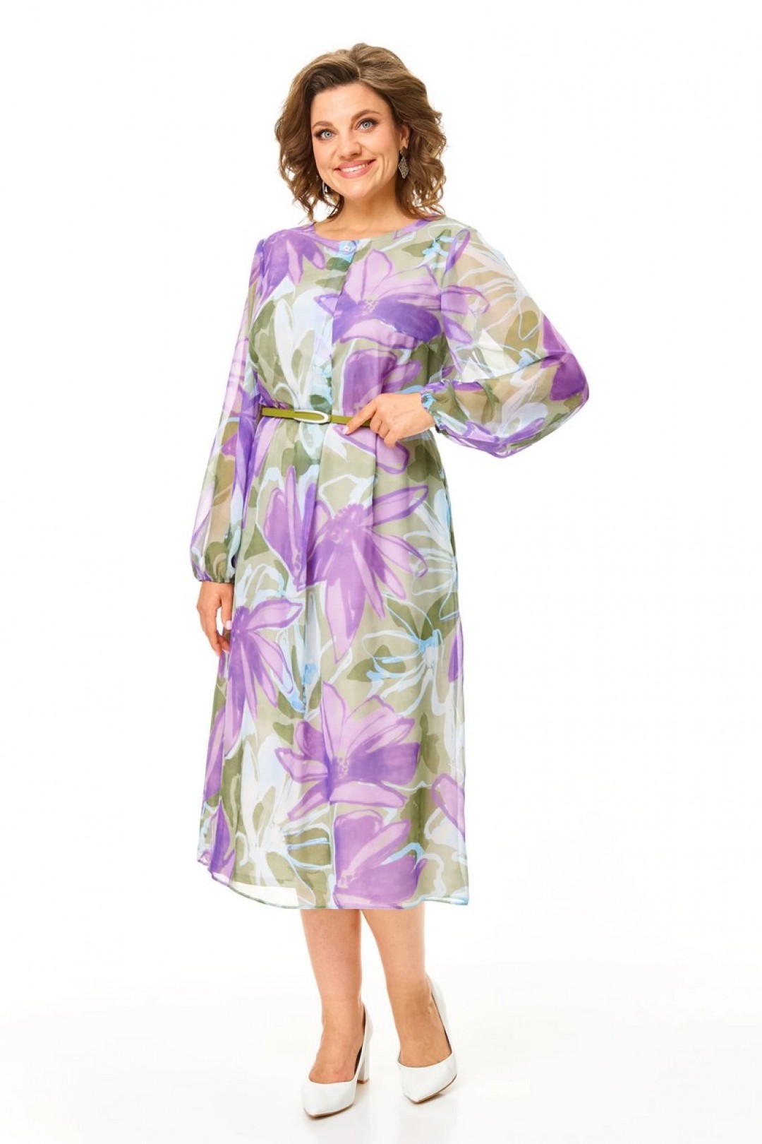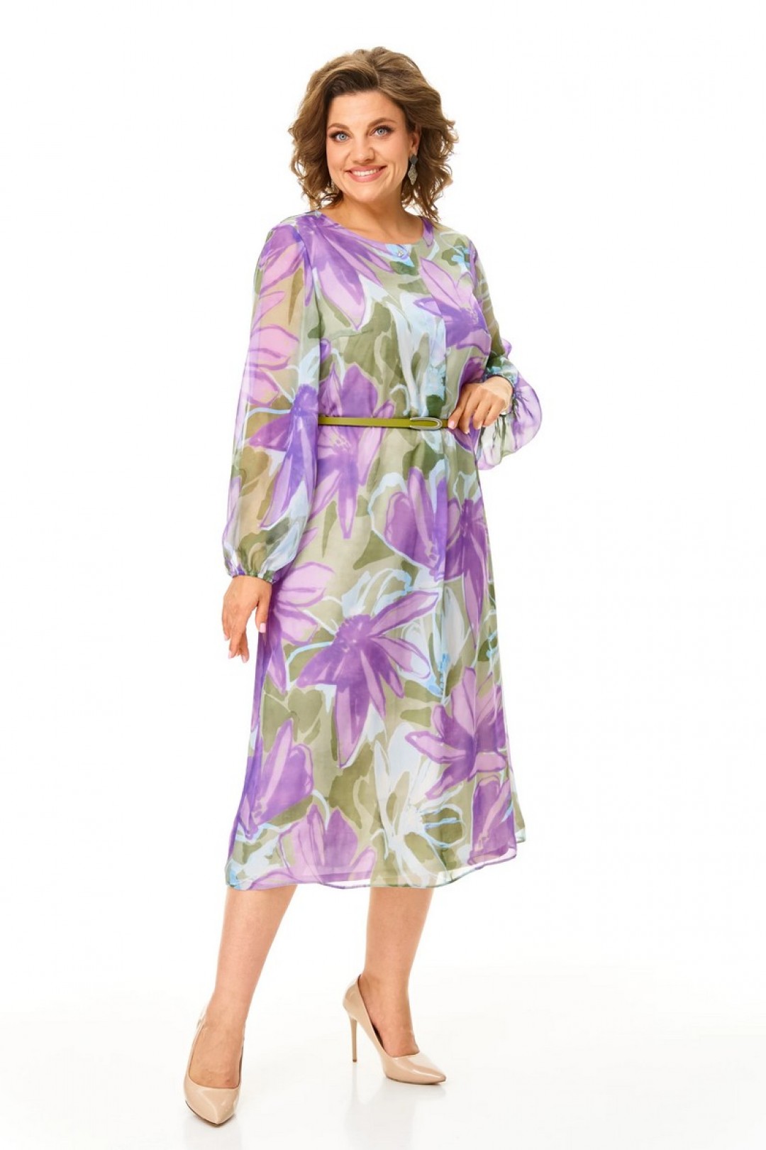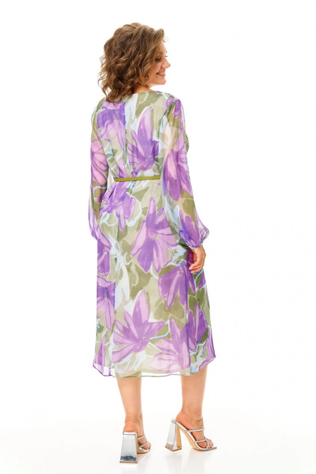 Платье выполнено из шифона с цветочным принтом. Силуэт прямой, чуть расширен к низу. По переду в горловину входит складка, складка частично настрочена. По переду есть нагрудные вытачки. Перед и спинка на трикотажной подкладке. Рукав втачной, прямой, к низу расширен. Низ рукава на резиночке. Спинка со средним швом, без особенностей. Съёмный пояс в комплекте.
