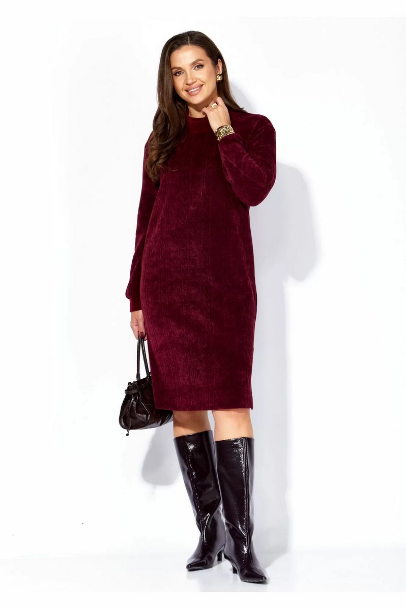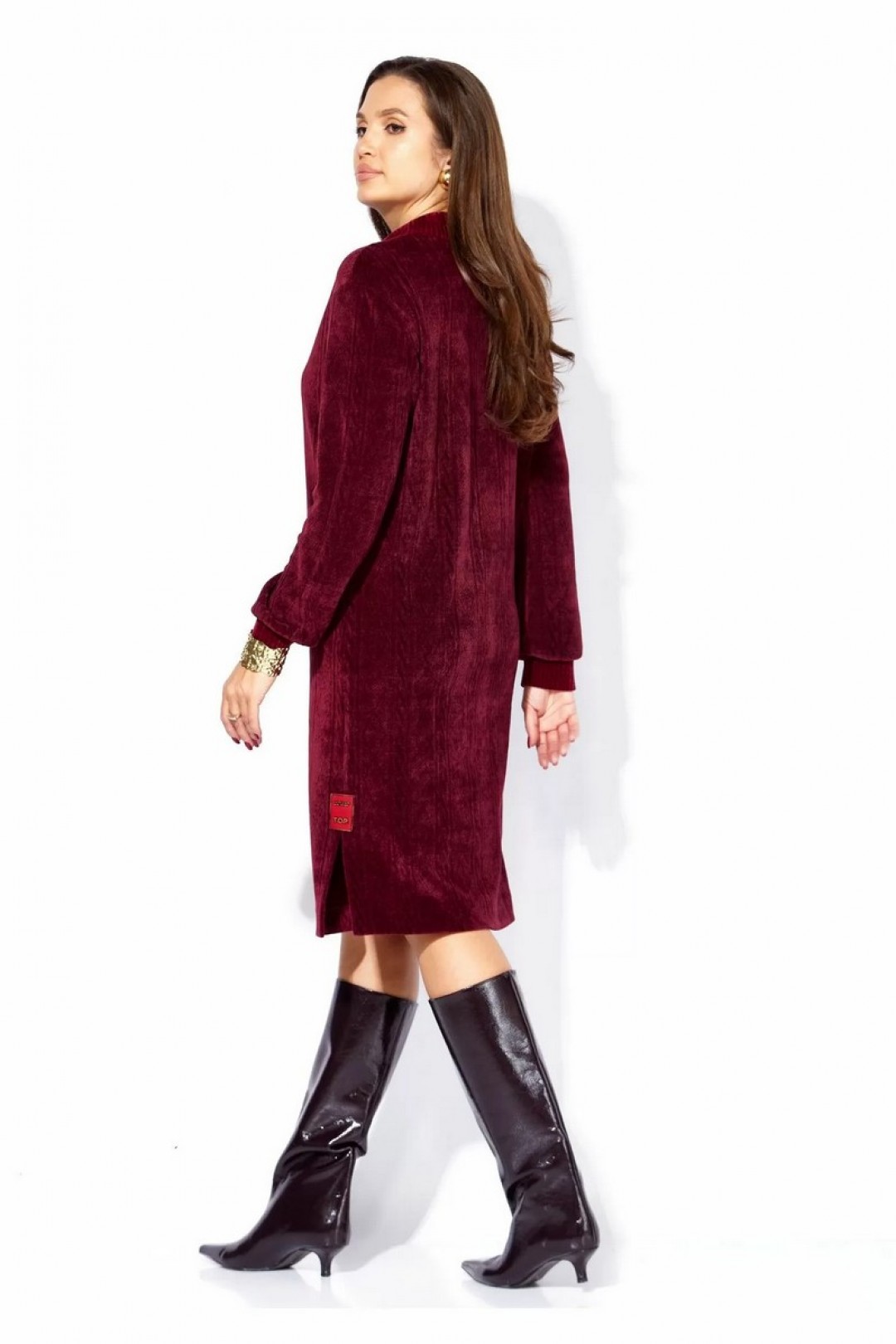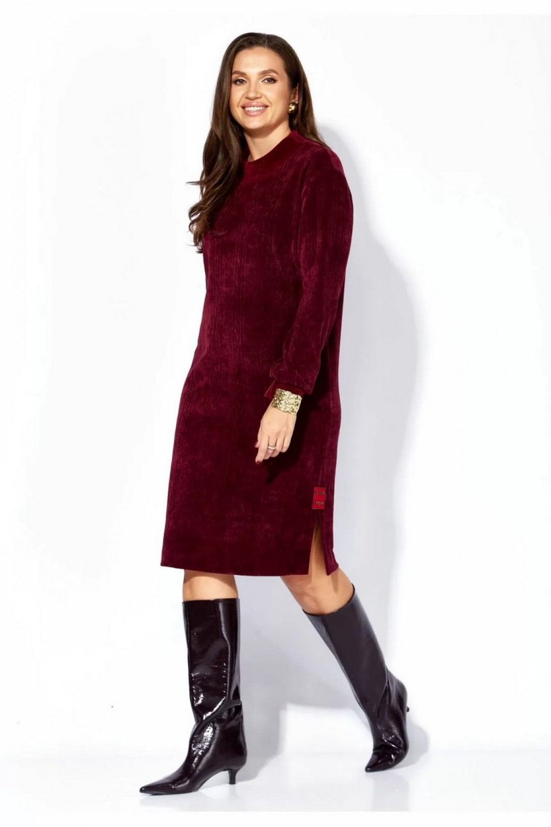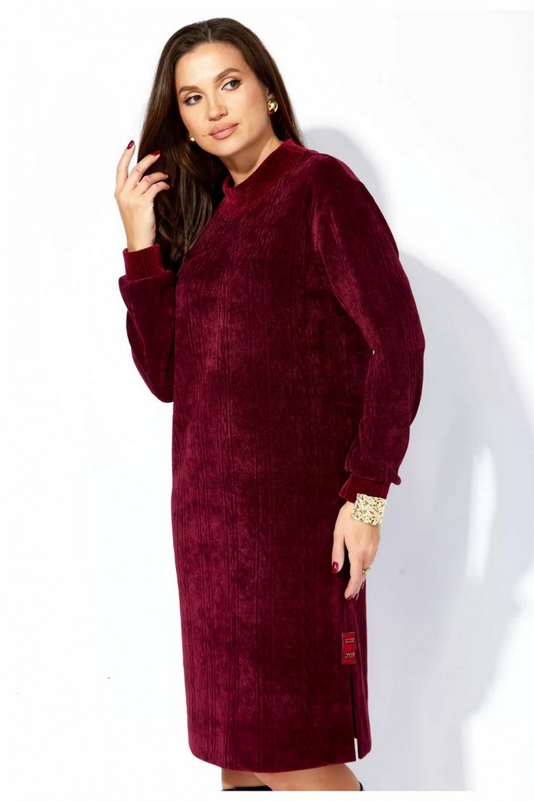 Платье женское, прямого силуэта с длинным рукавом. Рукав со спущенной линией плеча, по низу на манжете. Горловина оформлена высокой, мягкой стойкой. По боку разрез, акцентирован декоративной стойкой. Спинка без особенностей.