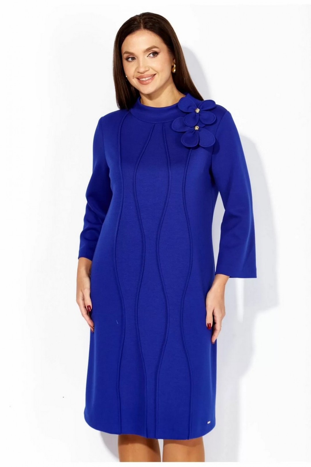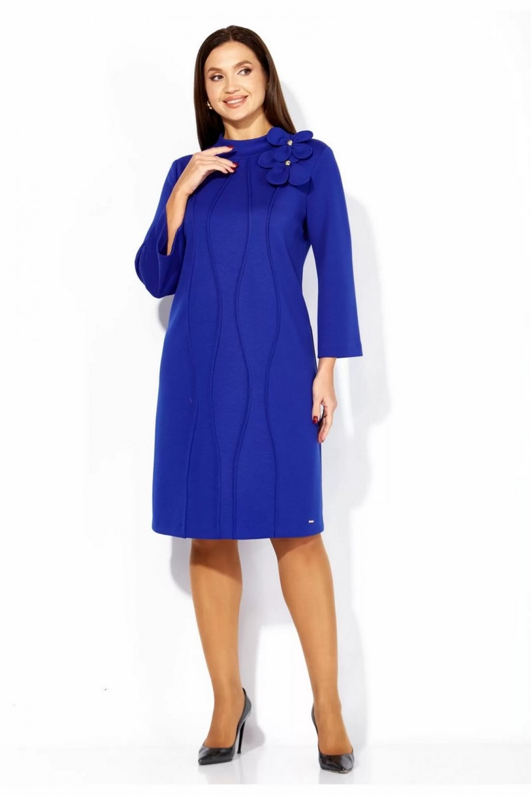 Платье женское, чуть А-силуэта, с втачным рукавом, длинной 7/8. По центу переда объемные , фигурные рельефы. Горловина оформлена небольшой мягкой стойкой. Декором служат съемные цветки-броши. По низу платья отделочная нашивка. Спинка со средним швом. Платье изготовлено из трикотажного полотна "тенсел".