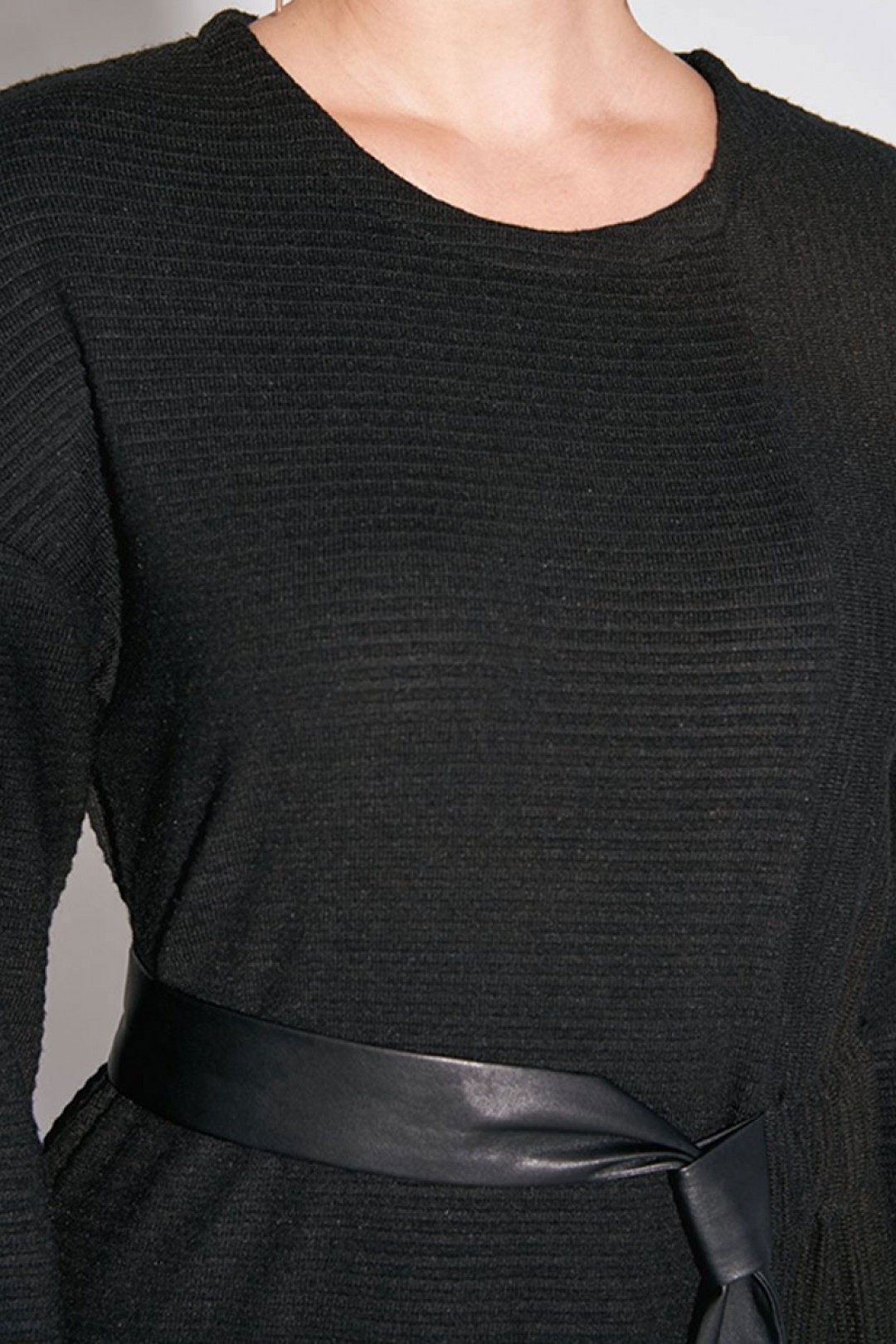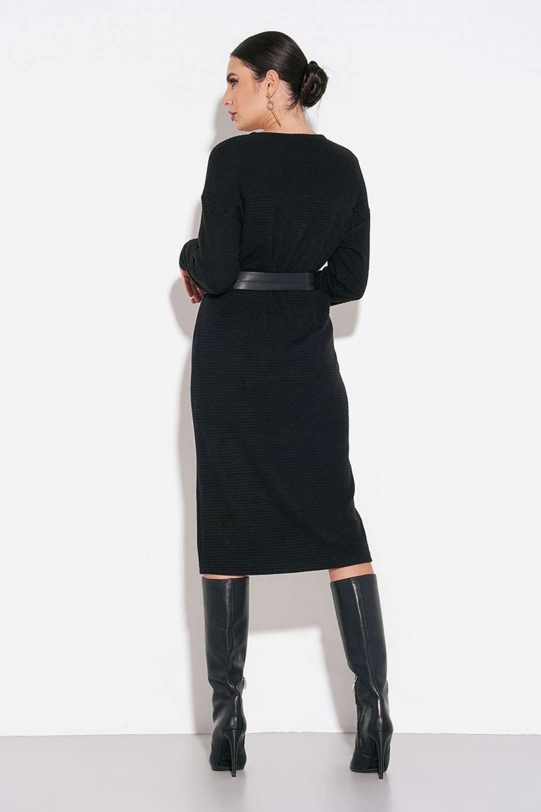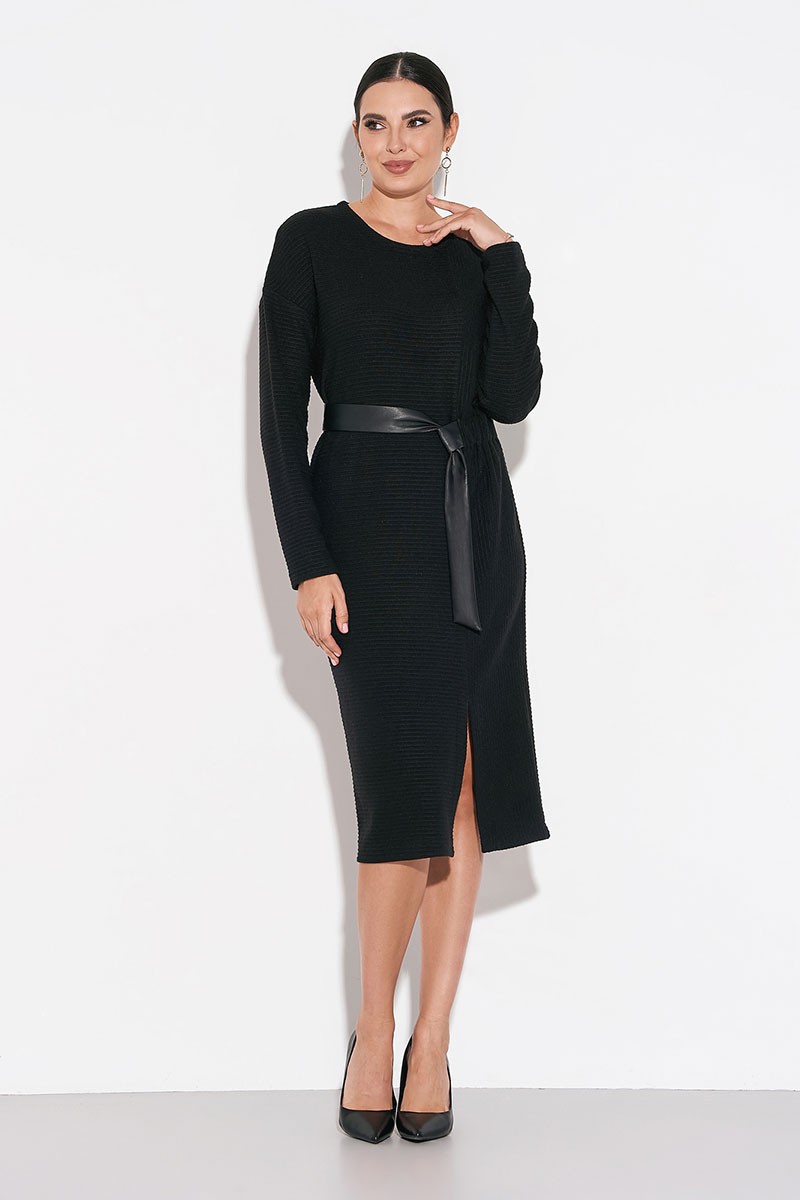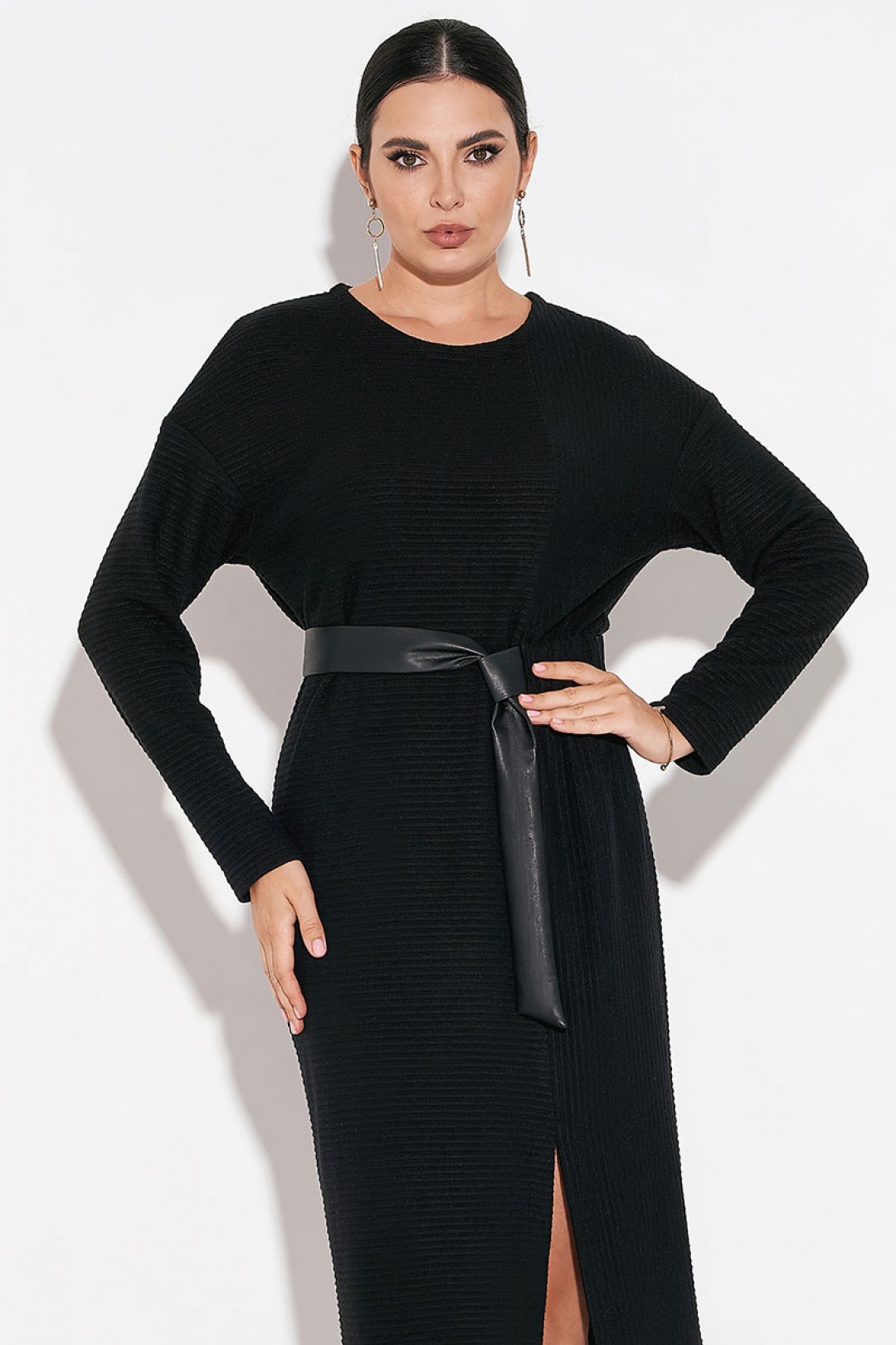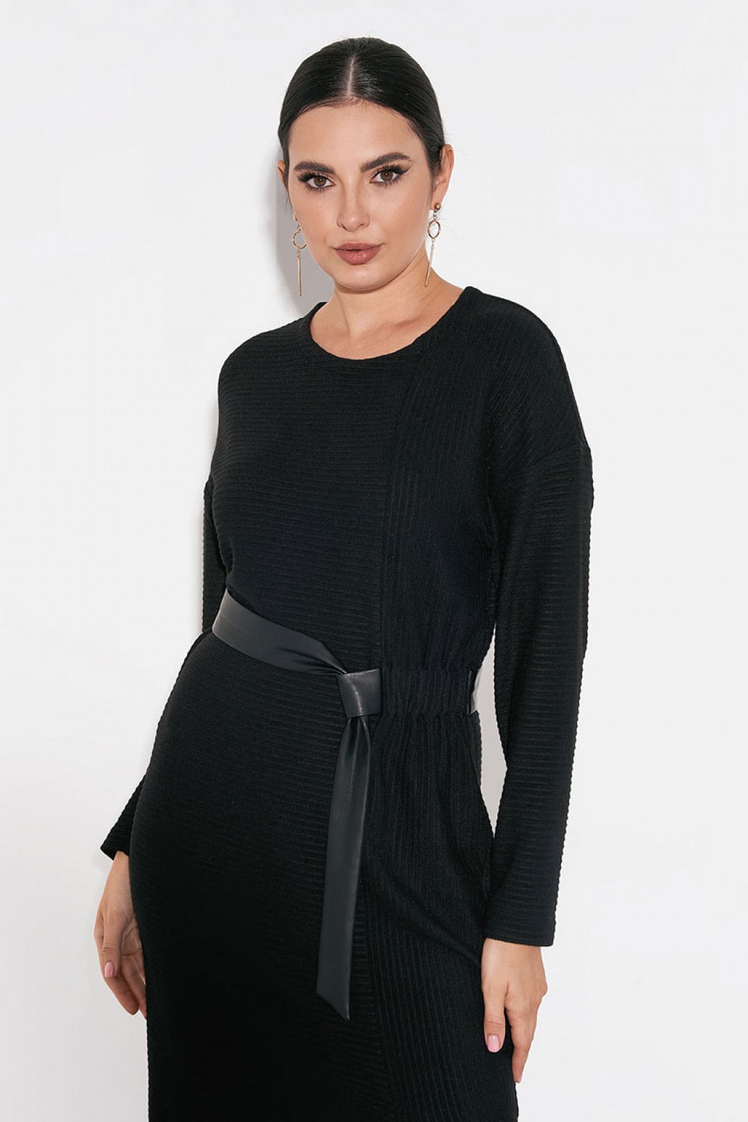 Женское платье полуприлегающего силуэта со спущенной линией плеча и круглым вырезом горловины выполнено из мягкого высококачественного трикотажа с содержанием вискозы. По переду изделия ассиметричный шов и декоративный разрез. По линии талии с одной стороны вставлена резинка и функциональный пояс из ЭКО-кожи, который подчеркивает силуэт. При правильном уходе ткань не скатывается и не деформируется. Уход: - стирка при температуре не более 30 градусов, предпочтительно ручная или деликатный режим стиральной машины; - выкручивать изделие из трикотажа нежелательно, допустимо немного отжать; - сушить в горизонтальном положении на полотенце; - хранить изделие из трикотажа в сложенном виде, а не на плечиках.