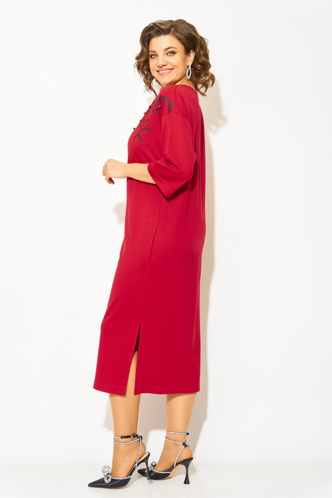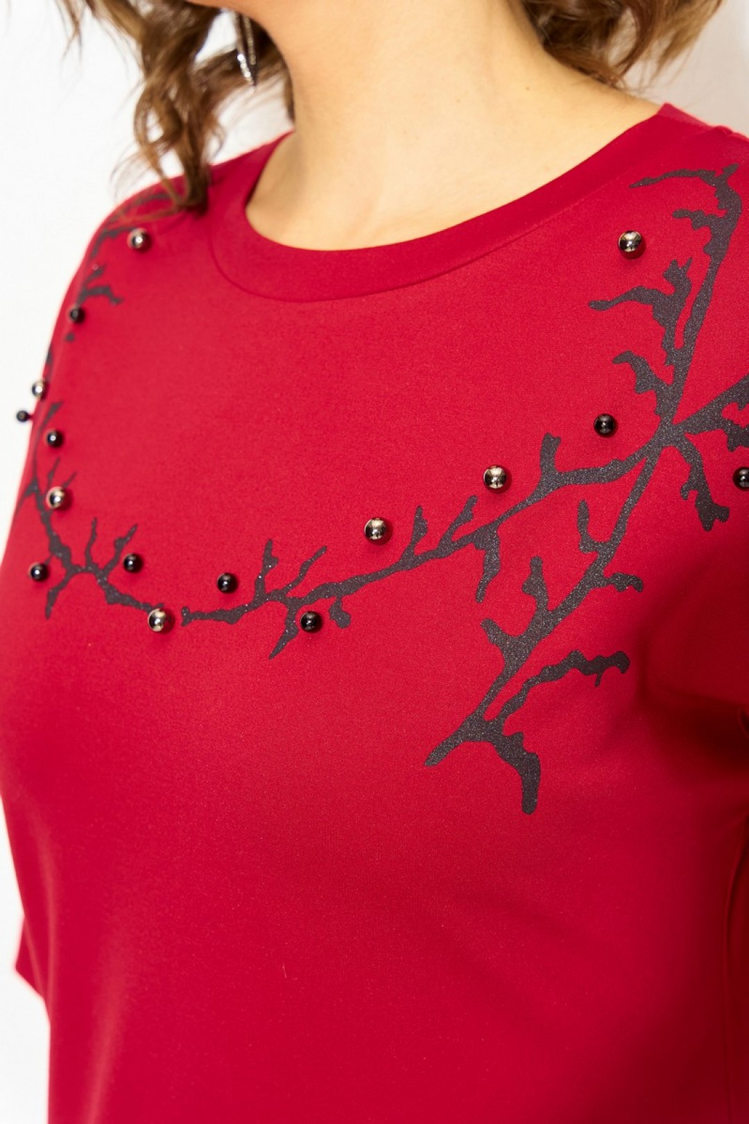 Трикотажное платье алого цвета подчеркнет Вашу женственность и добавит образу смелости! Материал, из которого выполнена модель - мягкий, комфортный и теплый! Силуэт платья прямого кроя, с рукавом длиной ¾-ти на спущенном плечевом поясе. Вырез горловины округлый, на мягкой планке. По бокам расположены разрезы на свободу движения. Изюминка данной модели- очаровательная печать накат с мерцающим эффектом украшенная бусинами и жемчугом. Такое платье можно носить с высокими сапогами, батальонами и даже с туфлями на каблуке. Добавьте к нему крупную бижутерию, кожаный ремень или перчатки - и создайте по истине элегантный и стильный образ!