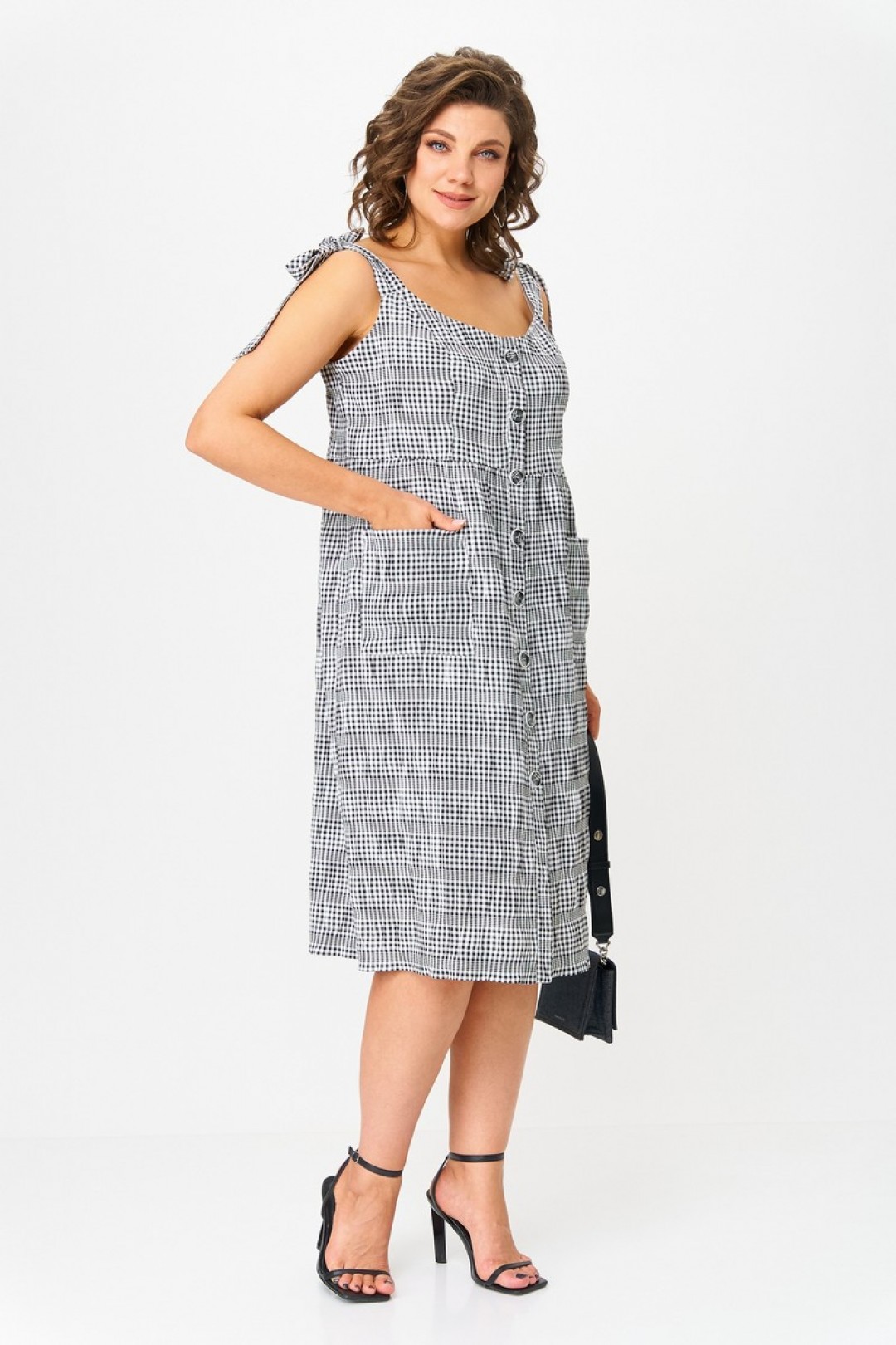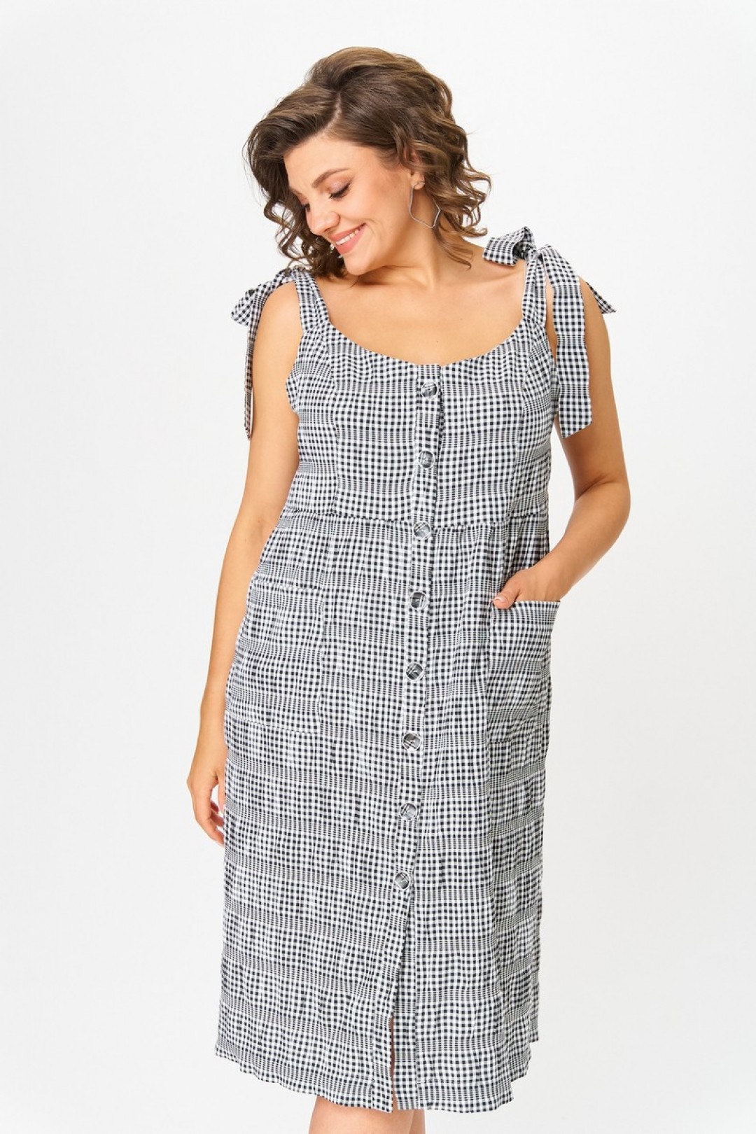 Нарядный и в то же время относительно простой летний сарафан, выполнен из легкой ткани. Полуприлегающий силуэт обеспечат комфортную носку даже в самые знойные дни. Застёжка на пуговицах. Юбка имеет небольшую сборку по линии талии. По бокам два накладных кармана. Благодаря завязкам на плечах прекрасно отрегулируется на любой рост. Универсальный крой, сочетающийся как с туфлями, так и с кедами. Это изделие станет любимым в Вашем гардеробе в наступающем сезоне.