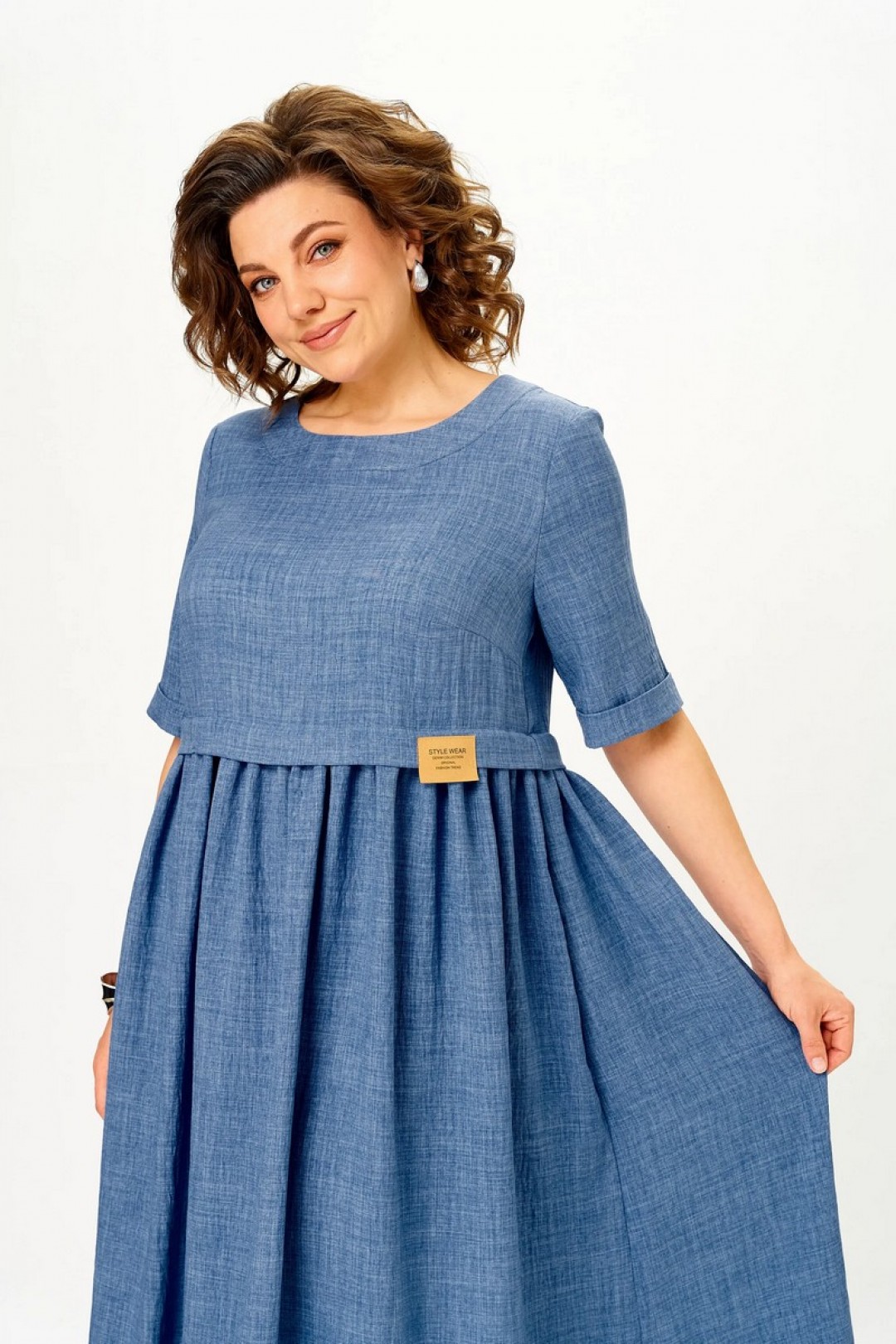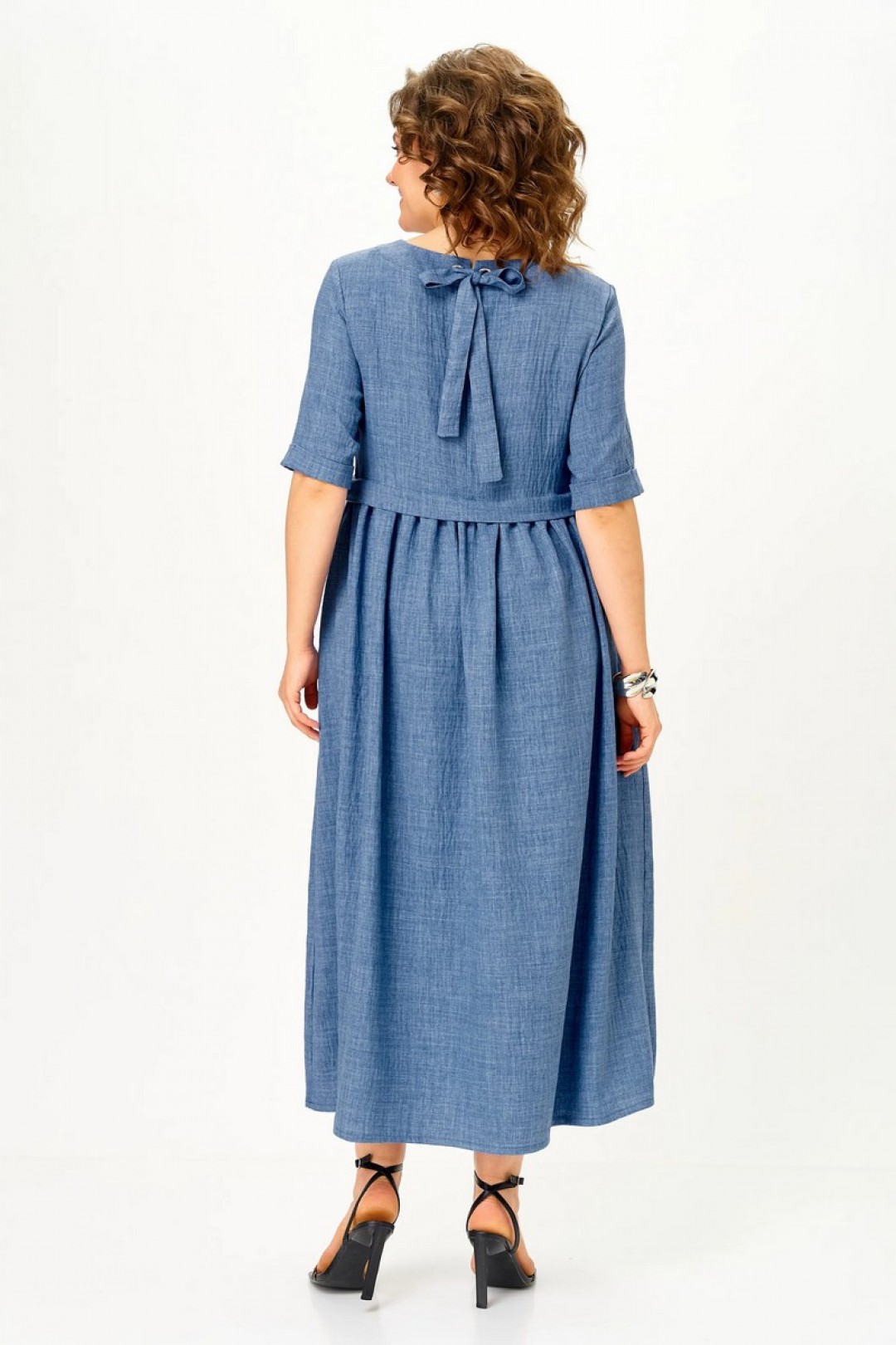 Платье имеет завышенную талию, округлую горловину и рукава длиной 45 см, что делает его одновременно женственным и практичным. Уникальная деталь — завязка на спинке, которая подчеркивает изящность силуэта. Карманы по бокам добавляют удобства и функциональности, не нарушая гармонии образа.