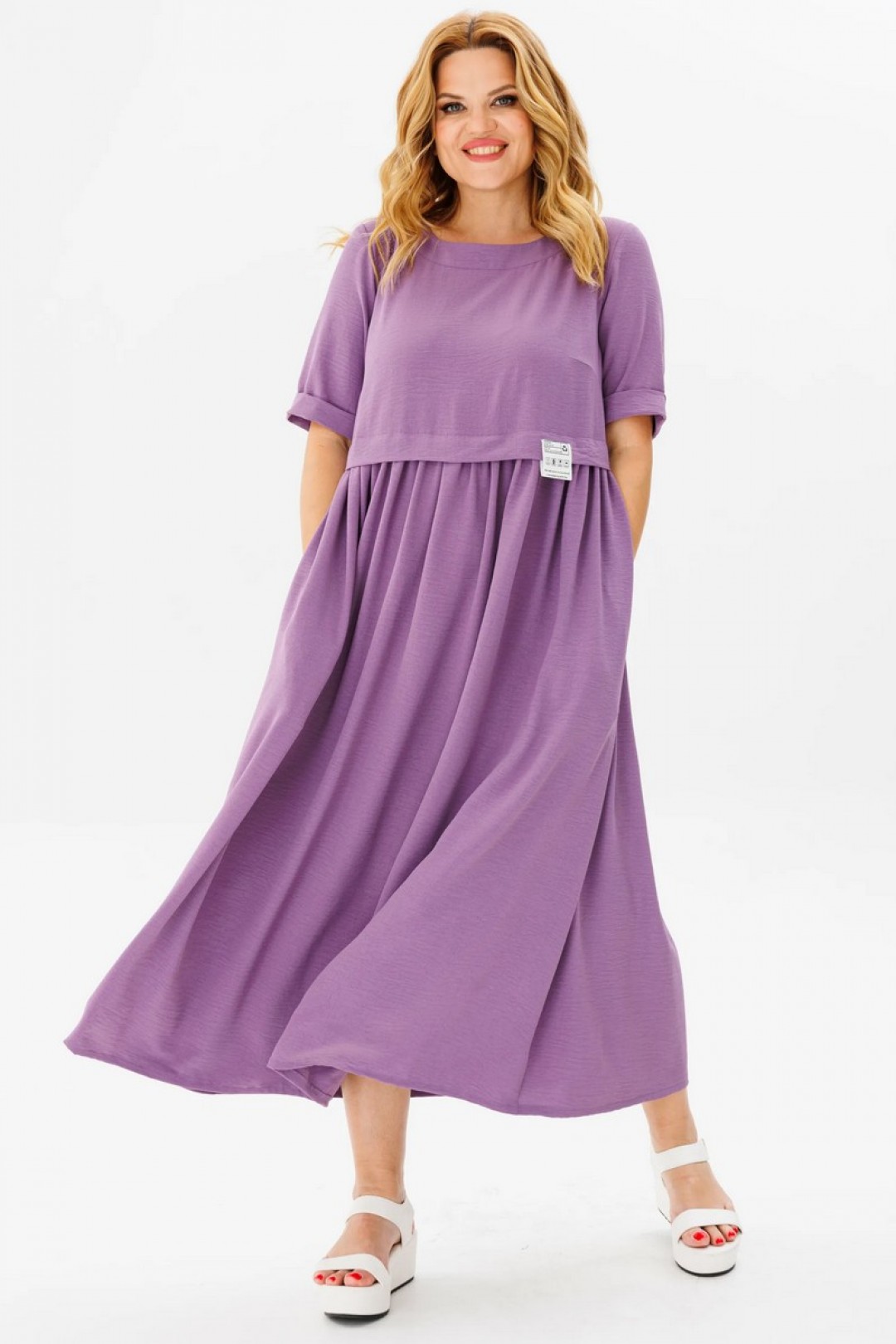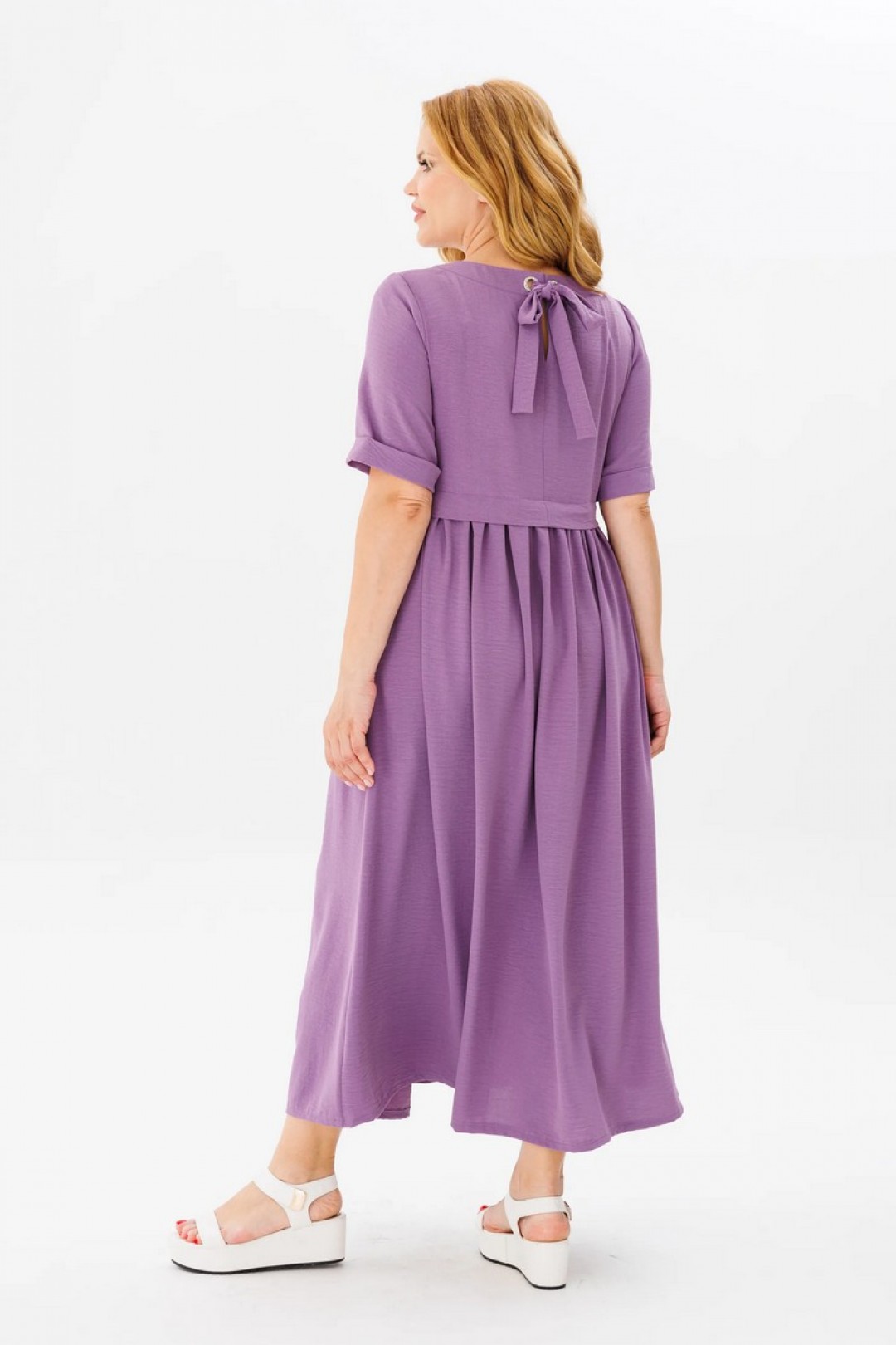 Актуальное длинное платье оригинального кроя — отличное решение для межсезонной погоды, для будней и для торжеств. Платье выполнено из текстильной ткани — жатка. Верх изделия с завышенной талией, округлой горловиной и втачным укороченным рукавом. Верх горловины на спинке украшен завязкой. Низ платья свободного летящего кроя с боковыми карманами, по талии сборка.