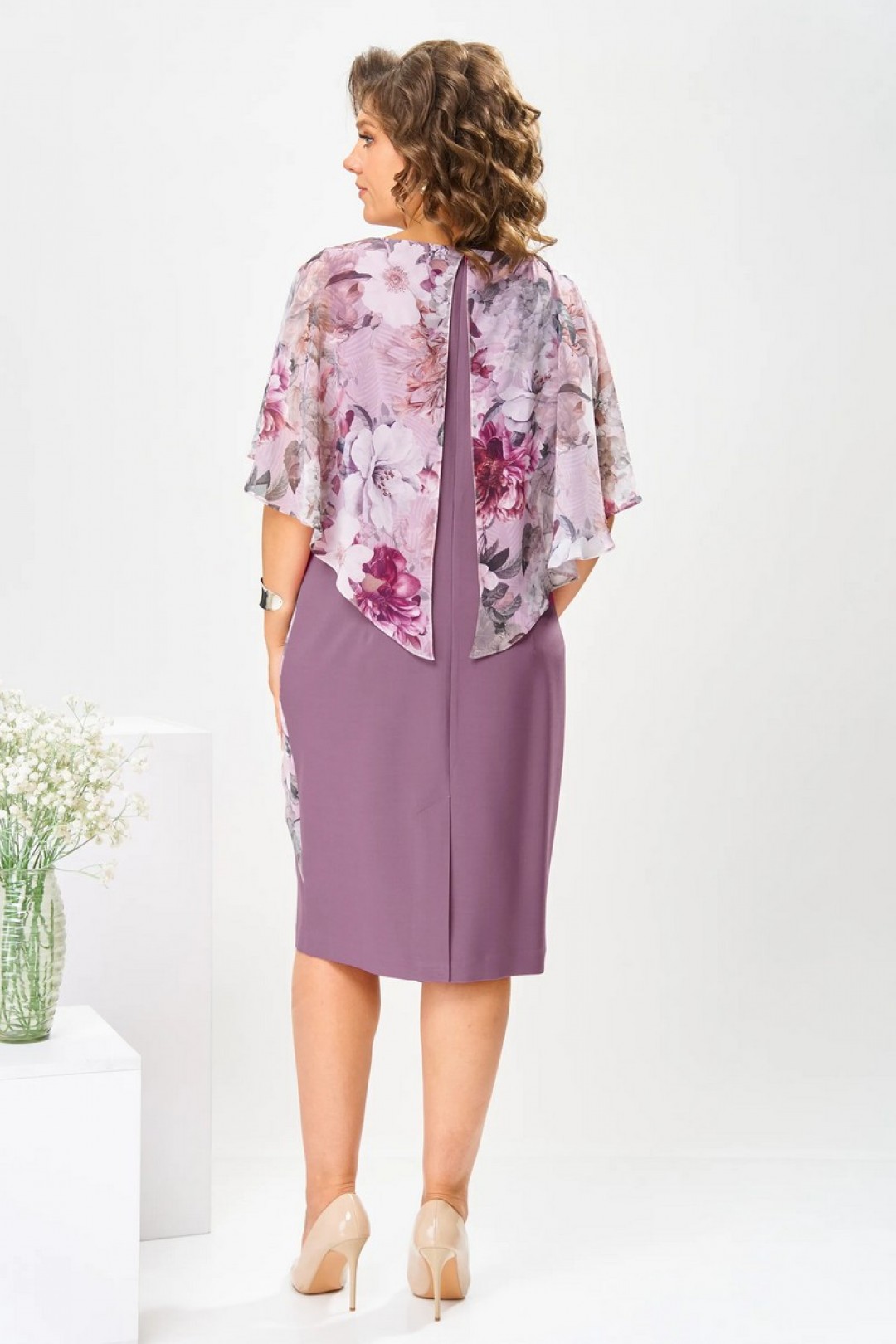 Платье женское относится к нарядной торжественной одежде. Платье полуприлегающего силуэта, с отлетной накидкой длиной за колено. Перед с двумя нагрудными вытачками, с двумя талиевыми вытачками. Спинка с двумя талиевыми вытачками и средним швом, заканчивающимся шлицей. Застежка на потайную тесьму-молнию в среднем шве спинки. Горловина круглая, обтачная, без воротника, по горловине закреплена накидка. Слева на уровне линии талии отделочным хлястиком, декорированным тесьмой накидка закрепляется на платье, нижняя часть накидки закреплена в левом боковом шве. Накидка с фигурным низом. Платье без рукавов.