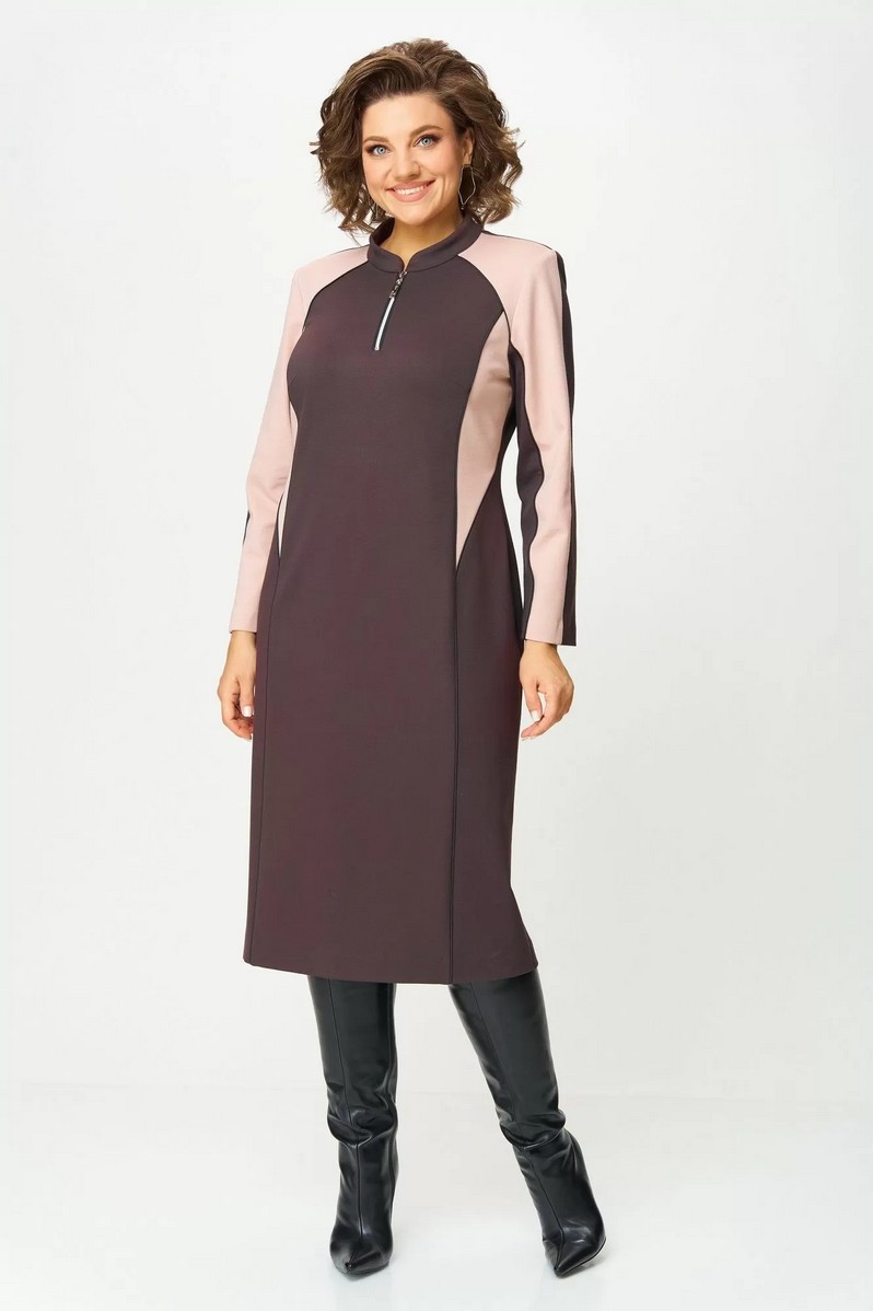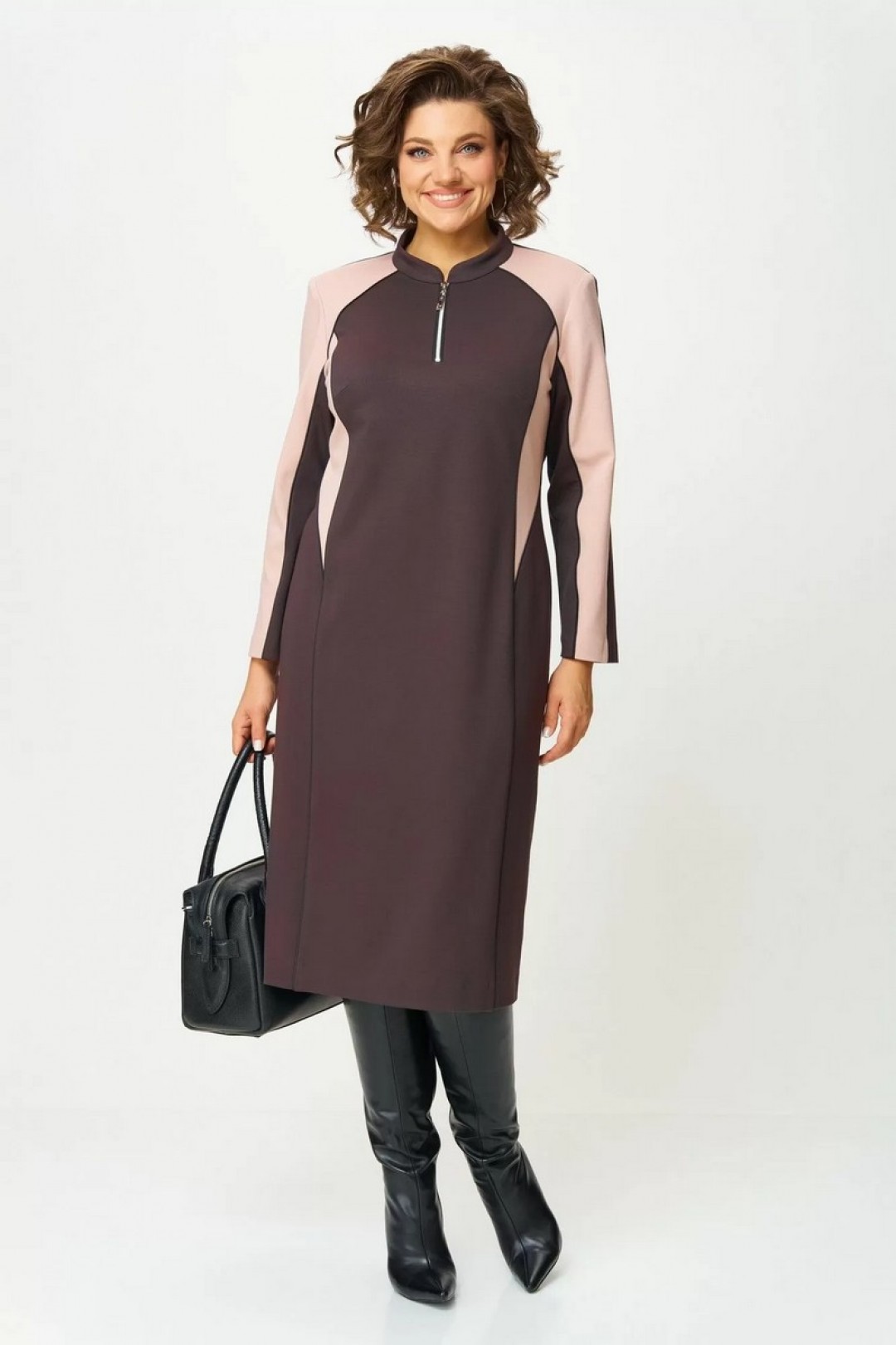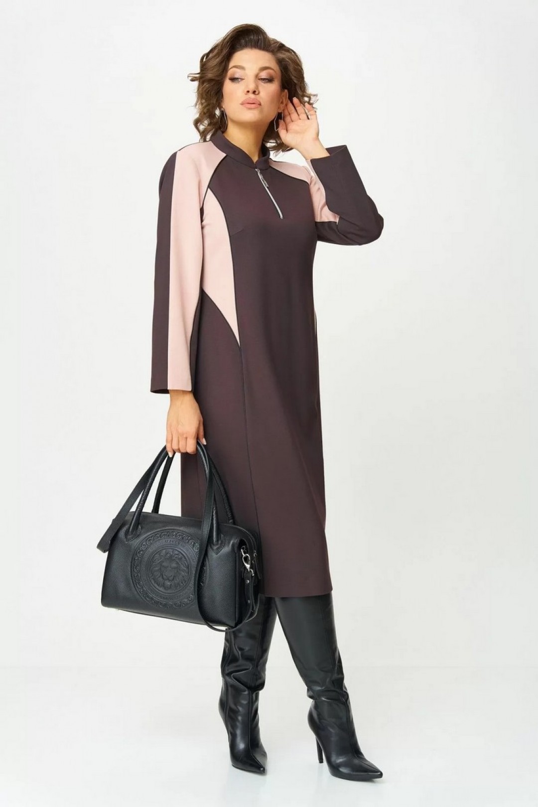 Это платье создано для женщины, которая умеет сочетать элегантность и современный ритм жизни. Глубокий шоколадный цвет словно обволакивает теплом, а нежные пудровые вставки придают образу мягкость и женственность. Контрастные линии визуально вытягивают силуэт, подчёркивая фигуру и делая его стройнее. Платье прямого силуэта, длина миди. Горловина- круглая с короткой стойкой-воротником и декоративной молнией по центру лифа. Рукав длинный втачной.