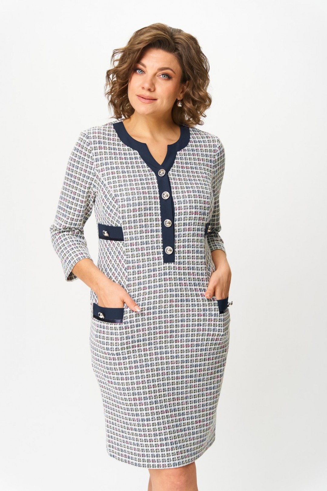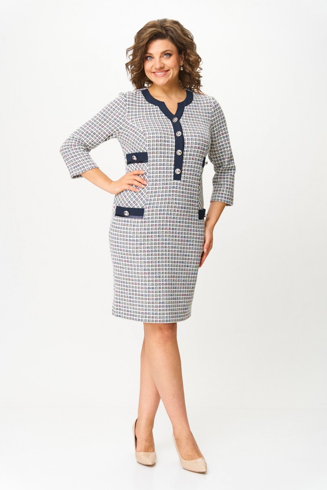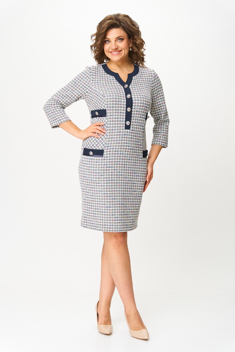 Платье женское полуприлегающего силуэта, без подкладки, тесьма-молния в среднем шве спинки, планка по переду застегивается на петли и пуговицы. Перед с рельефами от проймы, переходят в боковой шов, ниже линии талии, в шве обработан карман с клапаном. На боковую часть переда ниже линии груди пришит клапан. По низу клапанов боковой части переда и клапана кармана, настрочена отделочная тесьма, по центру клапана пришита пуговица. Спинка со средним швом, переходящим в шлицу, талиевые вытачки. Горловина спинки обработана обтачкой. Горловина переда обработана планками и подбортом. Рукав одношовный, втачной.