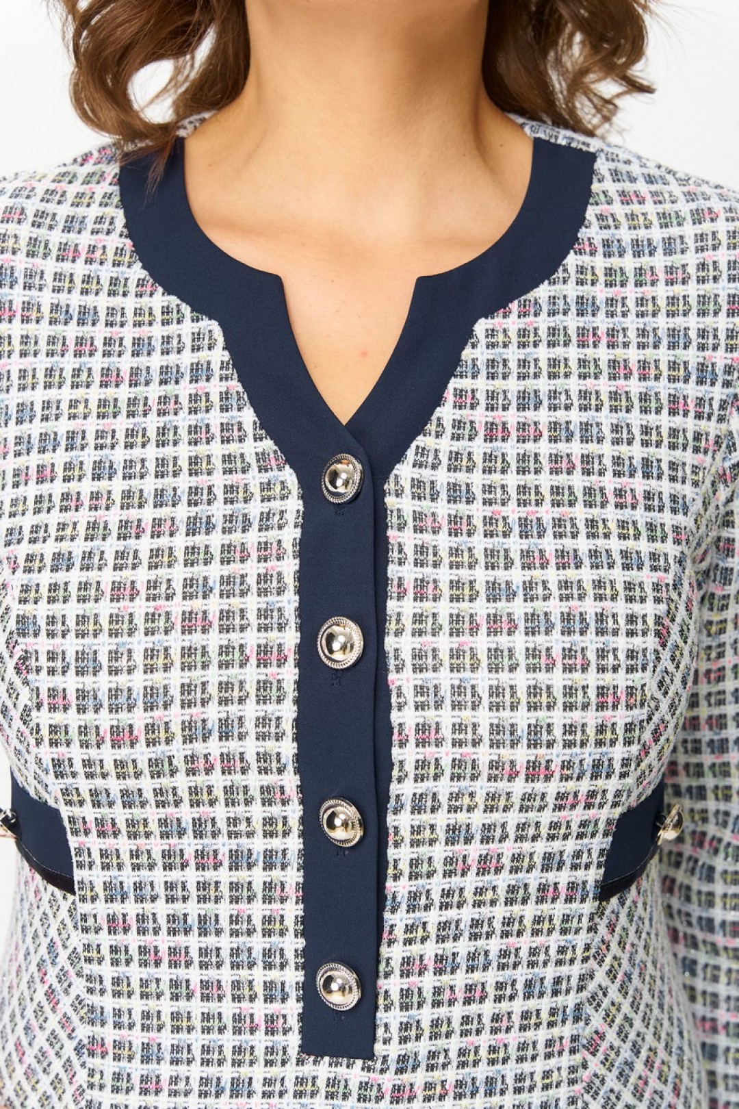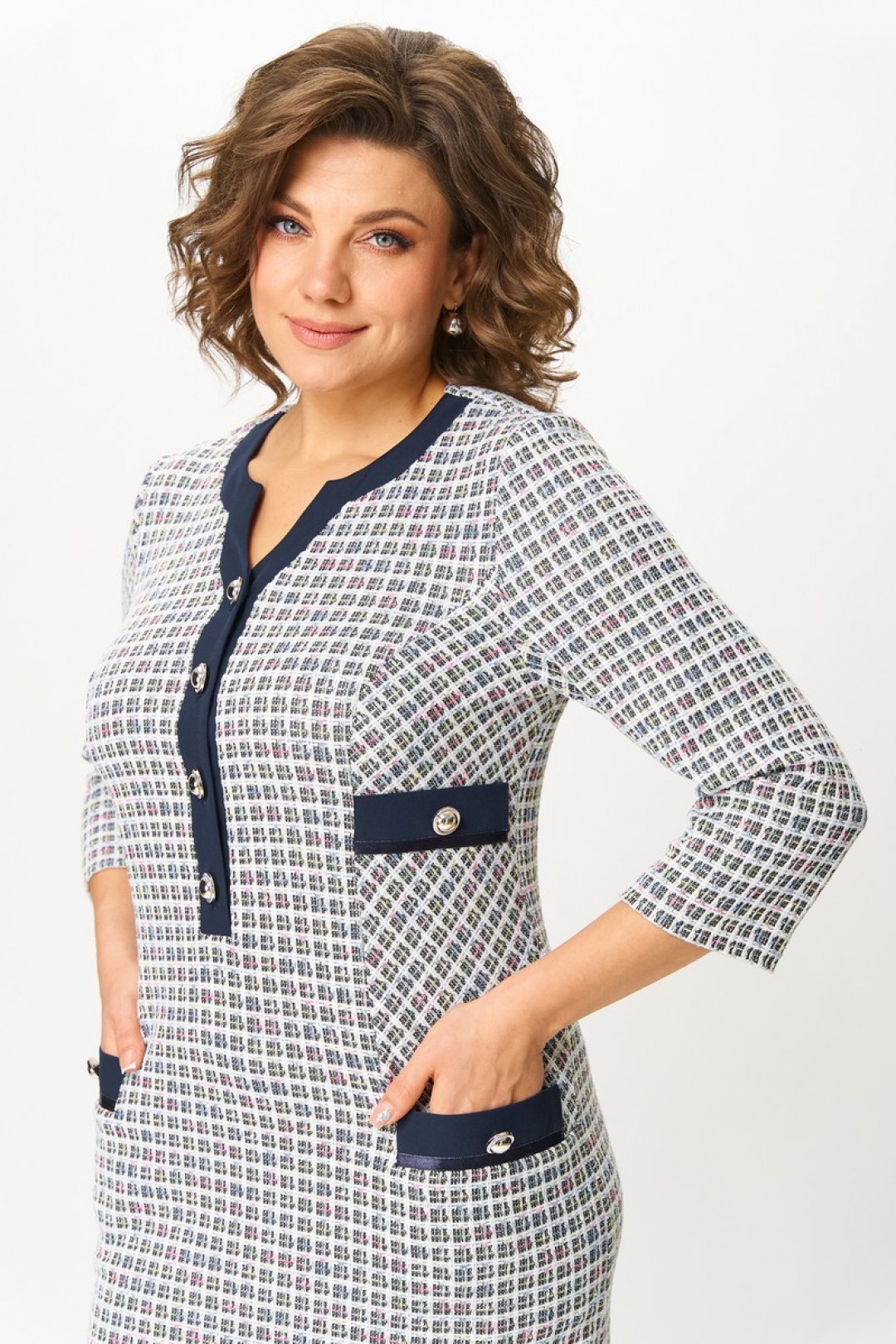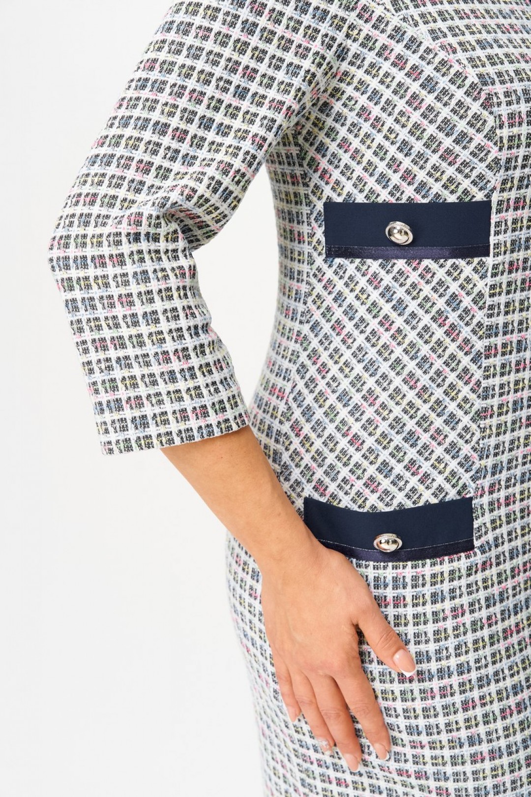 Платье женское полуприлегающего силуэта, без подкладки, тесьма-молния в среднем шве спинки, планка по переду застегивается на петли и пуговицы. Перед с рельефами от проймы, переходят в боковой шов, ниже линии талии, в шве обработан карман с клапаном. На боковую часть переда ниже линии груди пришит клапан. По низу клапанов боковой части переда и клапана кармана, настрочена отделочная тесьма, по центру клапана пришита пуговица. Спинка со средним швом, переходящим в шлицу, талиевые вытачки. Горловина спинки обработана обтачкой. Горловина переда обработана планками и подбортом. Рукав одношовный, втачной.