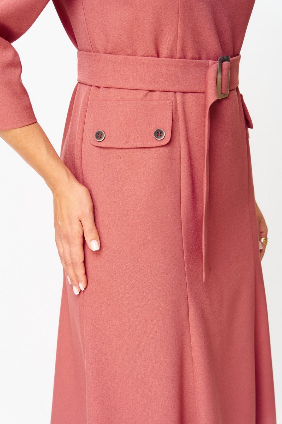 Платье женское полуприлегающего силуэта, расширенное к низу, без подкладки, тесьма-молния в среднем шве спинки. Перед и спинка с рельефами от проймы. Вырез горловины переда фигурный V-образный. На боковой части переда на уровне ниже линии талии, пришит закругленный клапан, закреплен по краям двумя пуговицами. Спинка со средним швом. Горловина обработана обтачками. Рукав втачной, одношовный. В дополнении пояс из основной ткани, фиксируется пряжкой.