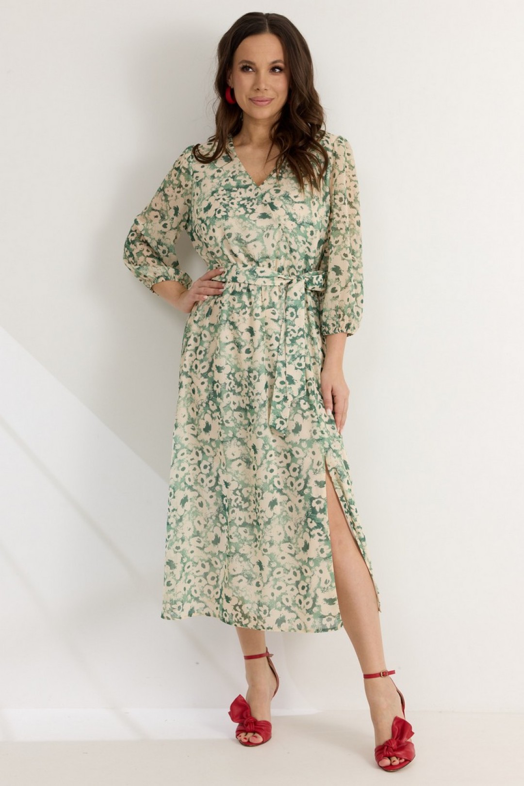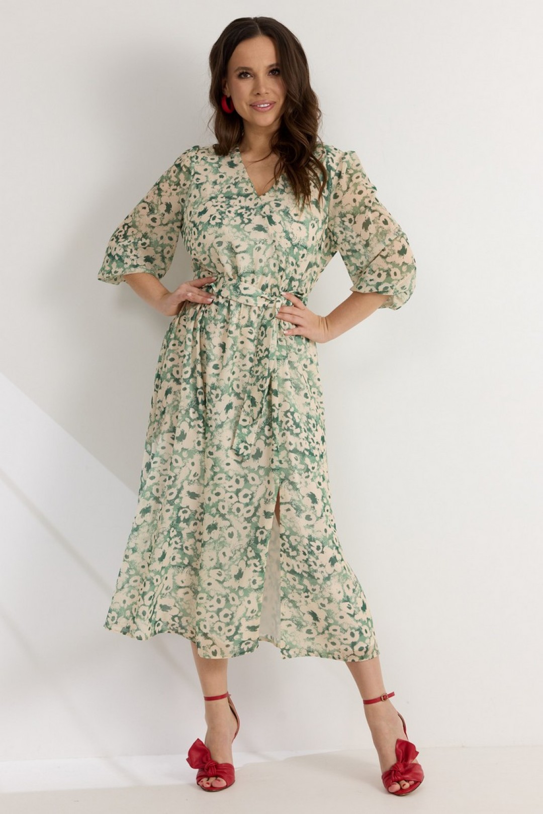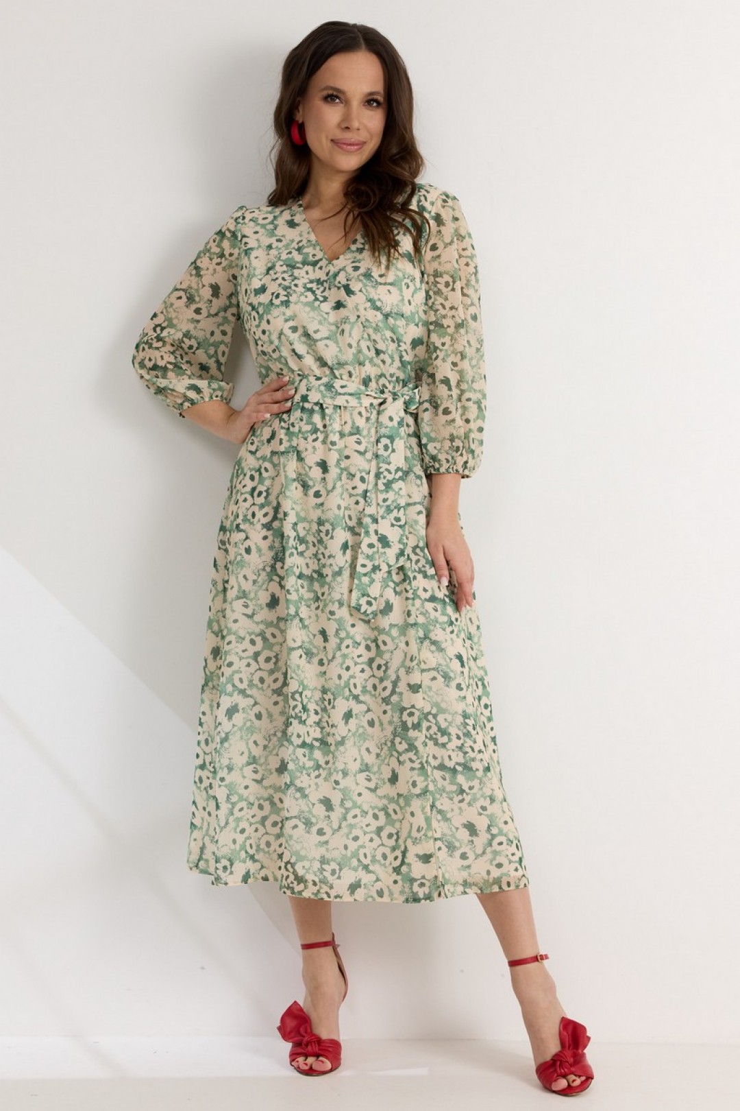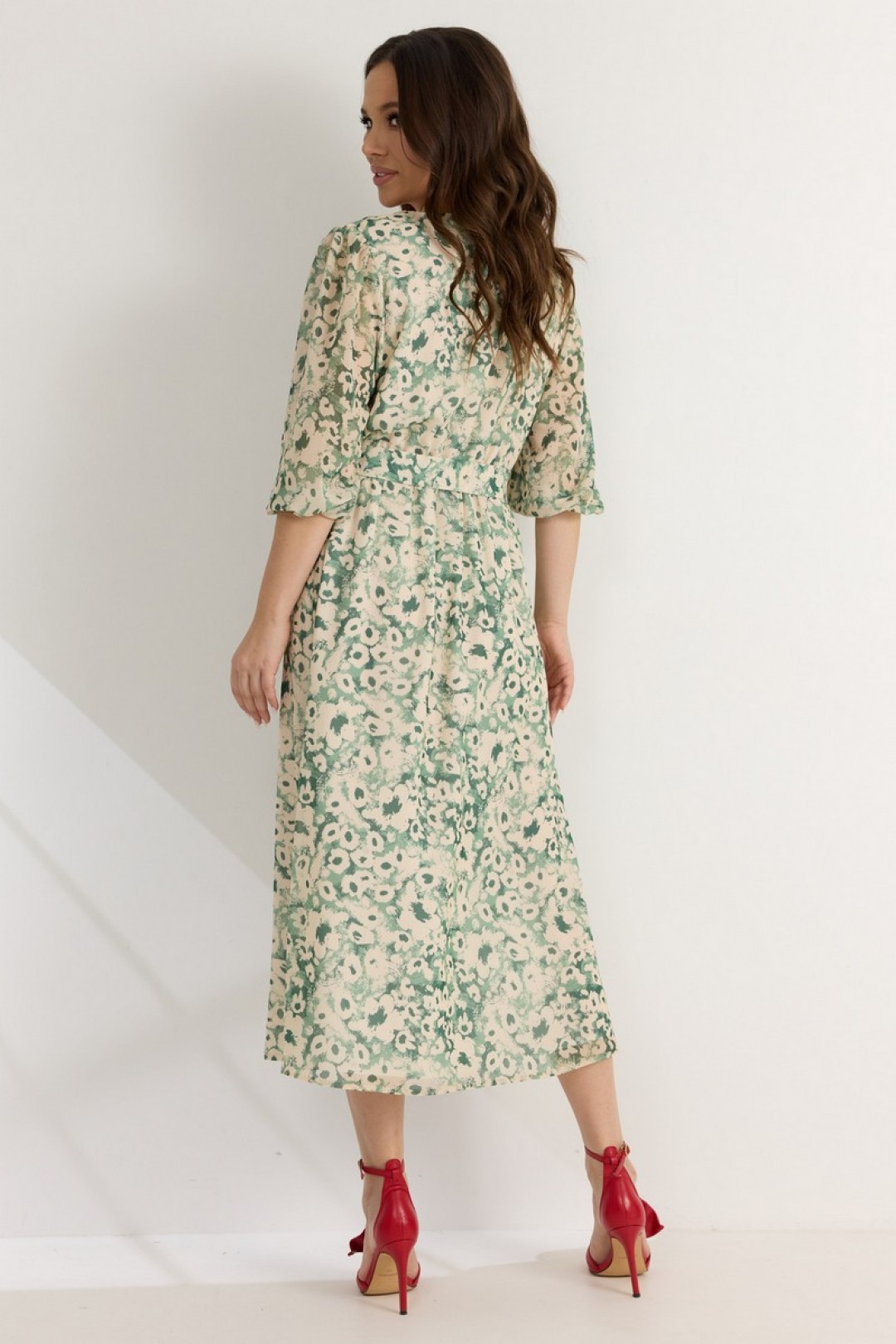 Легкое воздушное платье приталенного кроя с расширенной книзу юбкой. То талии платье отрезное, присборено на эластичную тесьму. Дополнено съемным поясом , выполненным из основной ткани. Рукав втачной, 3/4, по низу присборен на эластичную тесьму. Горловина с V-образным вырезом. Спереди платье дополнено разрезом.