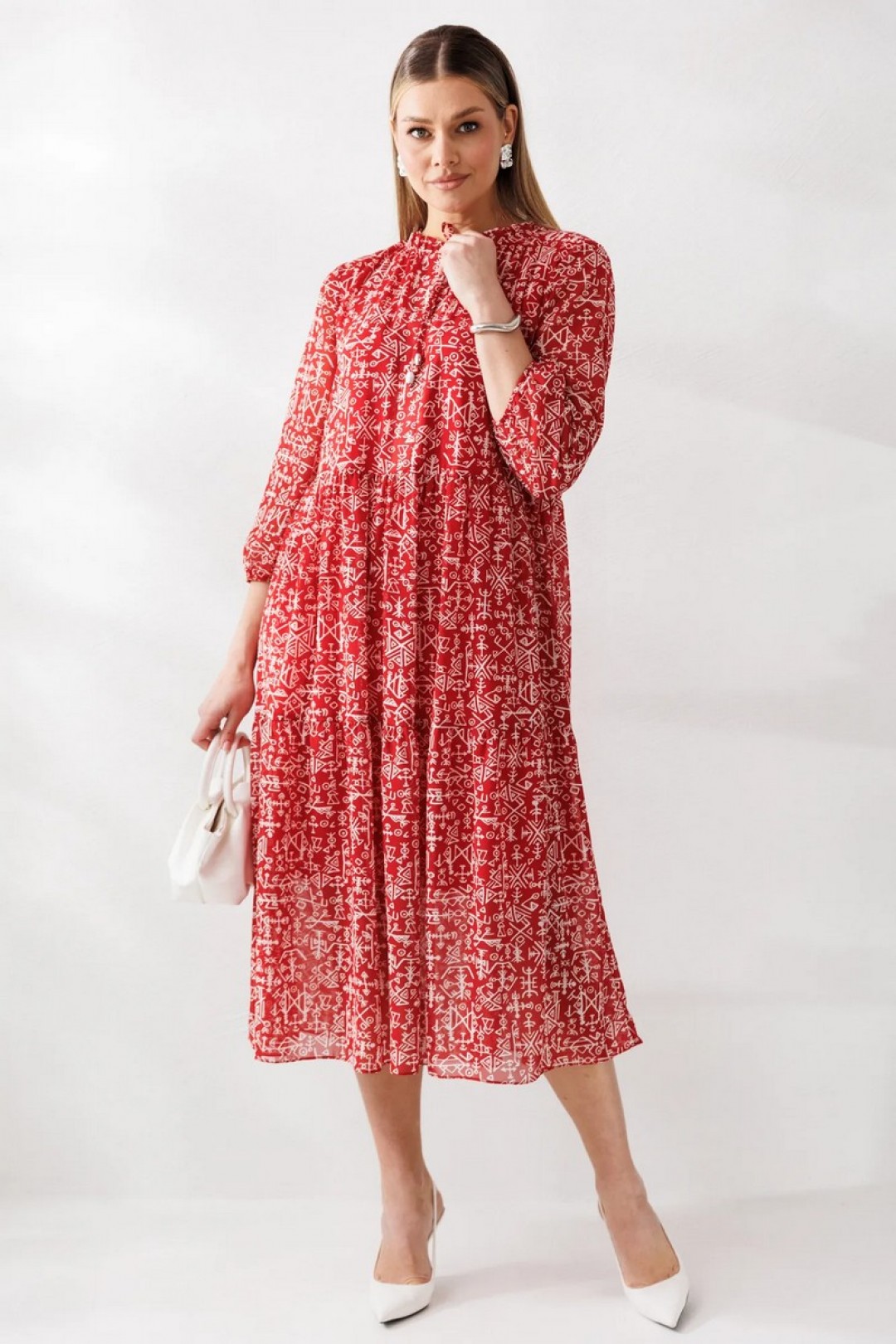 Стильное женское платье свободного силуэта, выполнено из плательной шифоновой ткани (не тянется) с дизайном «Геометрия», на подкладке (тянется).