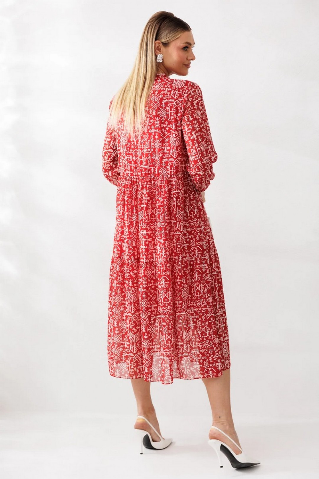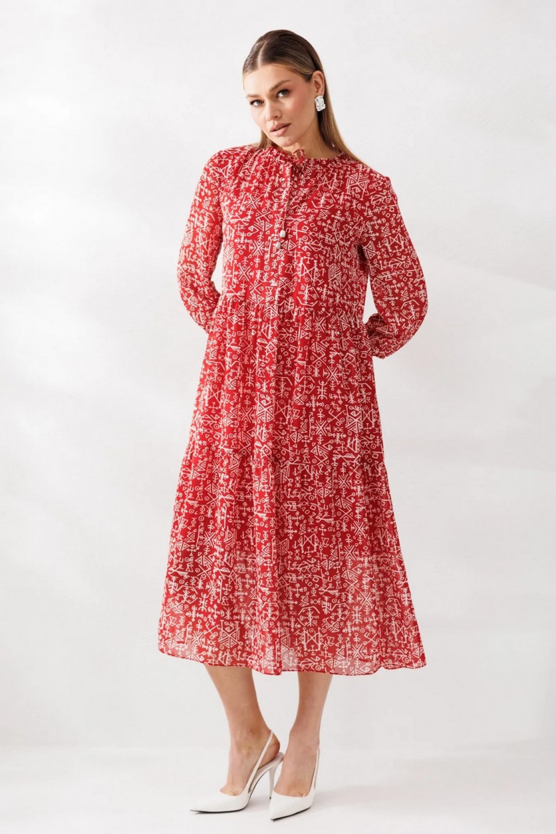 Платье отрезное чуть выше линии талии. Верхняя часть переда с V-образным вырезом и цельнокроеными планками. Горловина оформлена рюшей, присборенной резинкой. Горловина с завязками. По нижней части платья два ряда присборенных воланов. Рукава втачные, одношовные по низу присборены резинкой