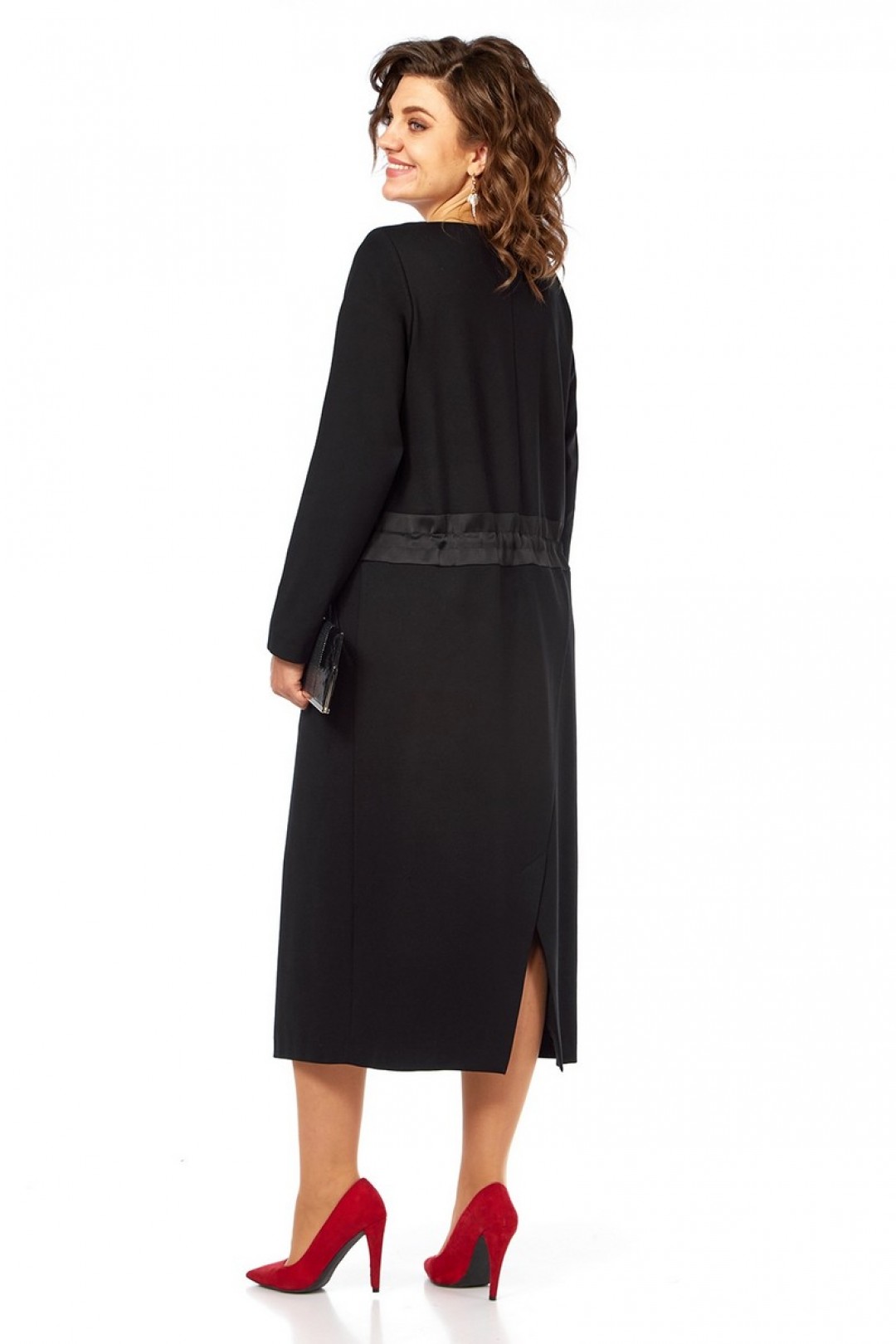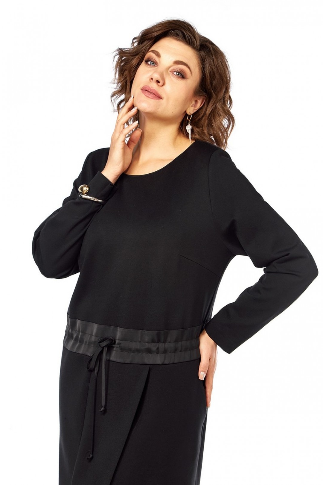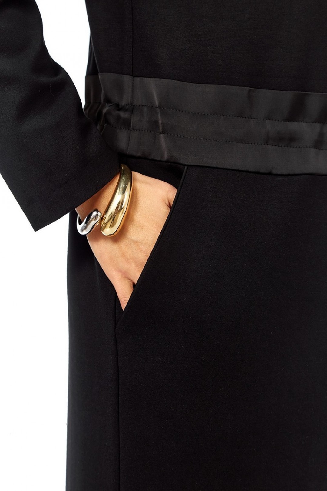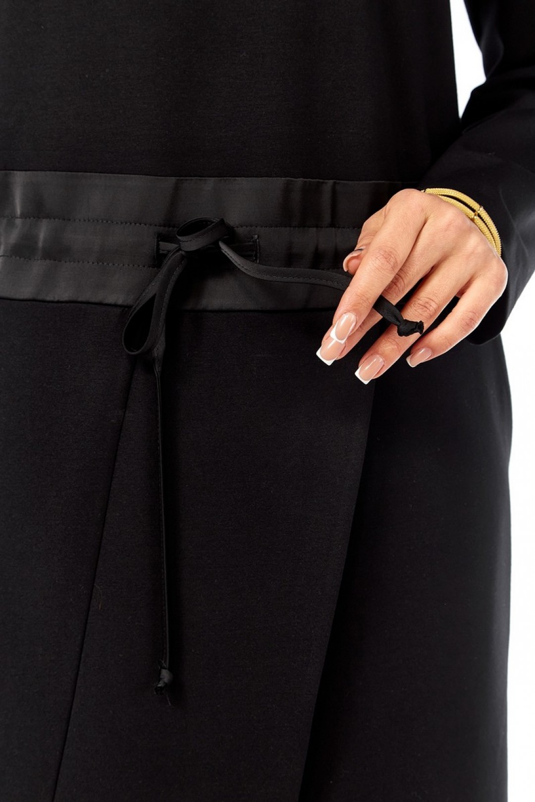 Платье женское прямого силуэта, изготовлено из трикотажного полотна и атласа. Платье отрезное ниже линии талии, со вставкой имитирующей пояс из отделочной ткани, с кулисой и втянутым шнуром. Горловина круглой формы с отделочным кантом. В нижней части платья обработан элемент с эффектом запаха. Обработаны карманы. Рукава втачные, длинные. Спинка разрезная с фигурным низом.