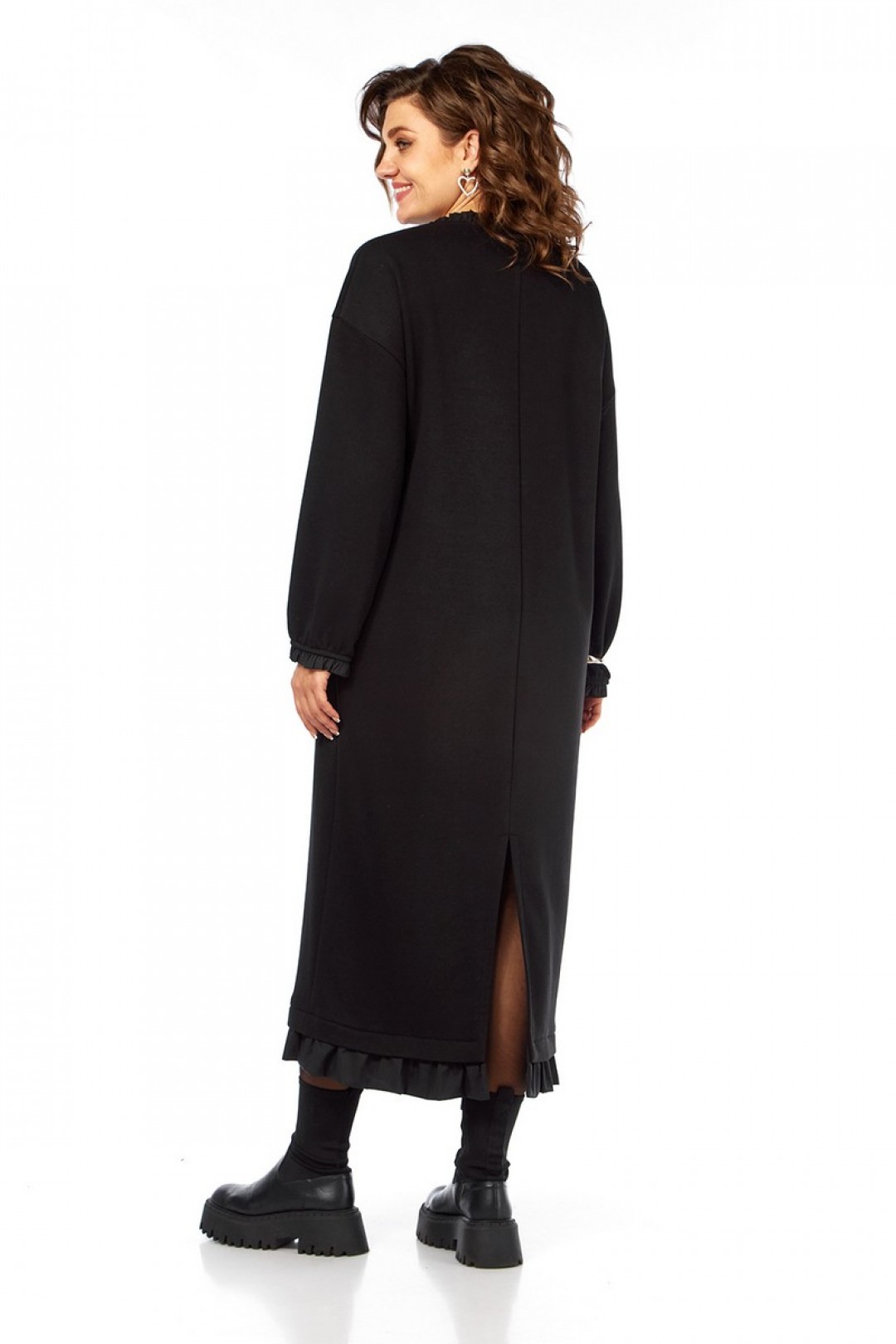 Платье женское прямого силуэта, изготовлено из трикотажного полотна. Рукава спущенные длинные. По горловине, низу рукавов и низу платья обработаны рюши из хлопковой ткани. По переду декоративная нашивка. Спинка со средним швом и разрезом по низу. В боковых швах карманы