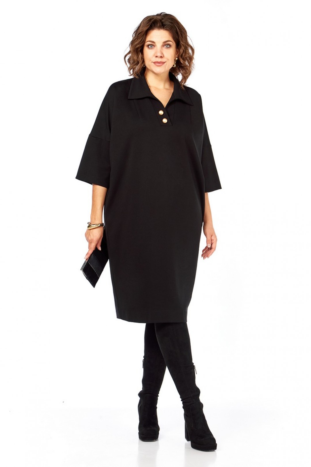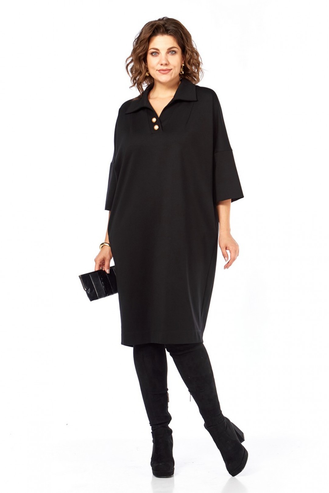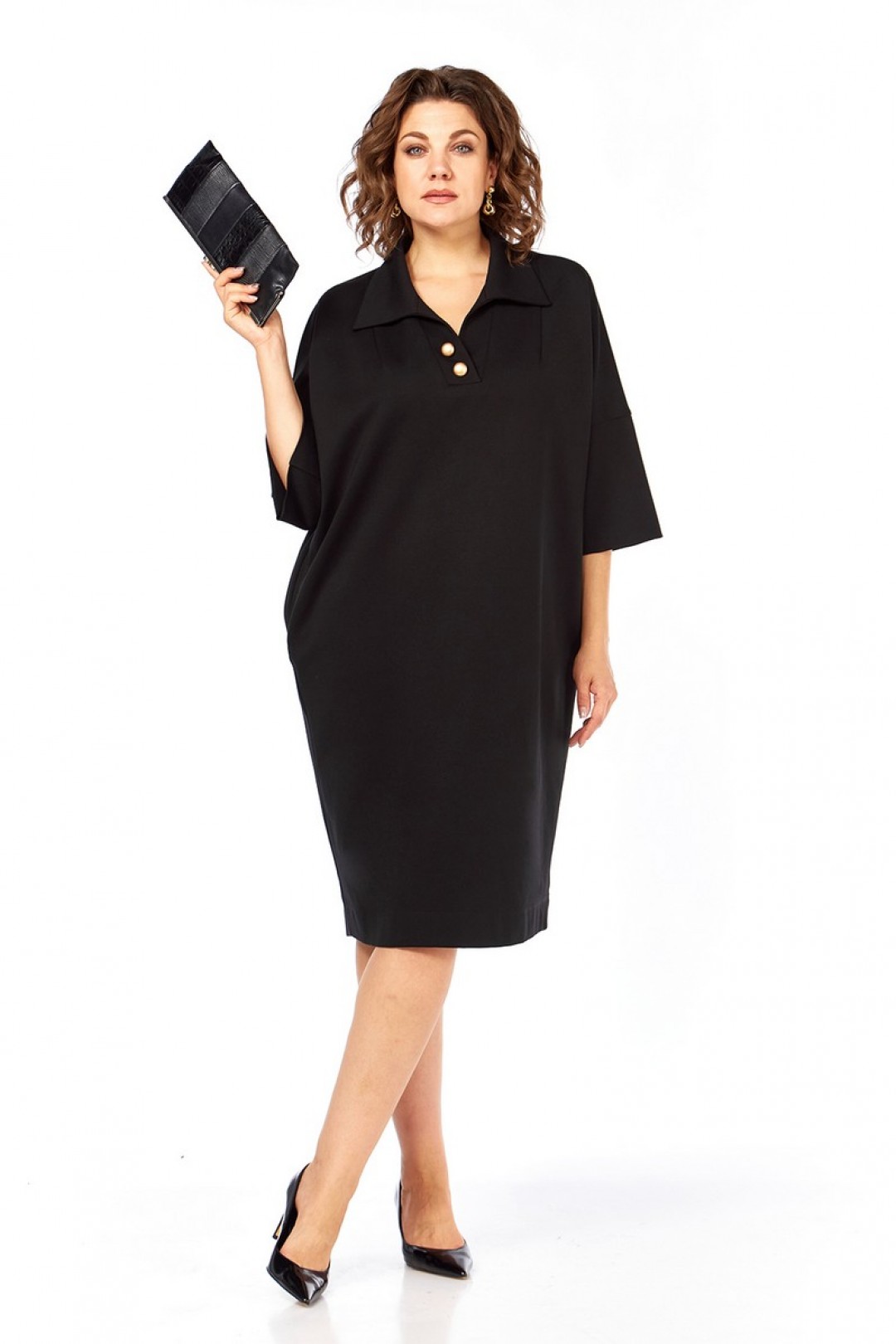 Платье женское, свободного кроя, изготовлено из трикотажного полотна. Горловина обработана стояче-отложным воротником и планками, декорированными пуговицами. Спинка со средним швом. Рукава спущенные, длиной ¾.
