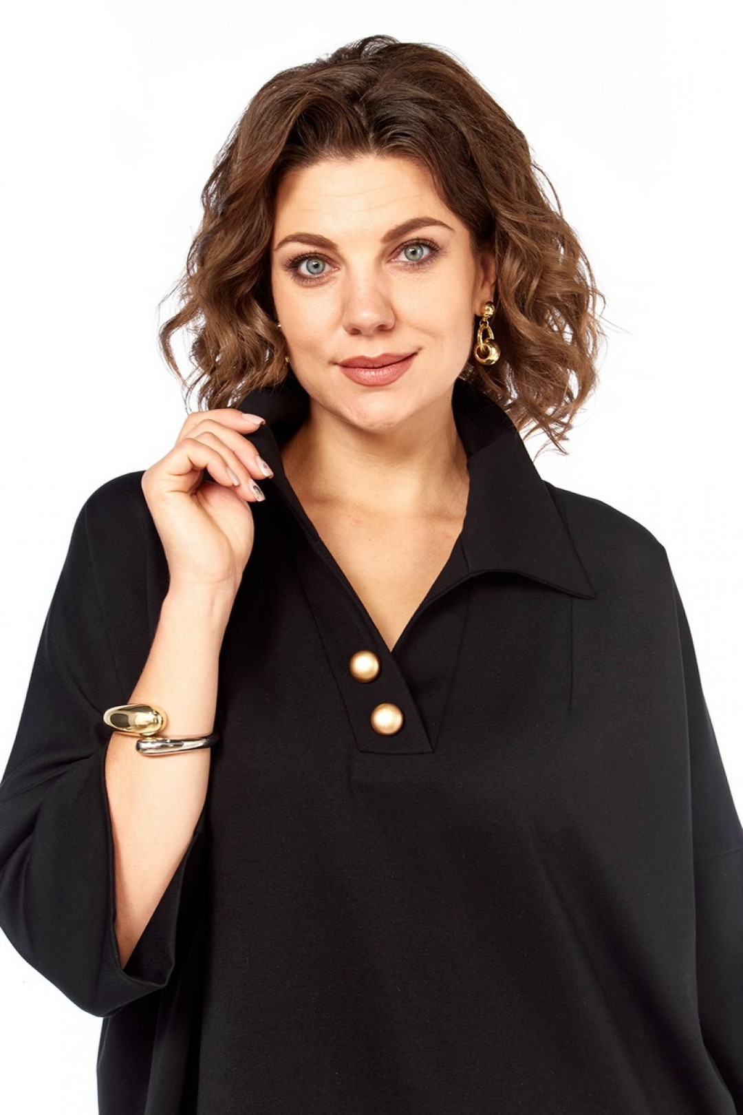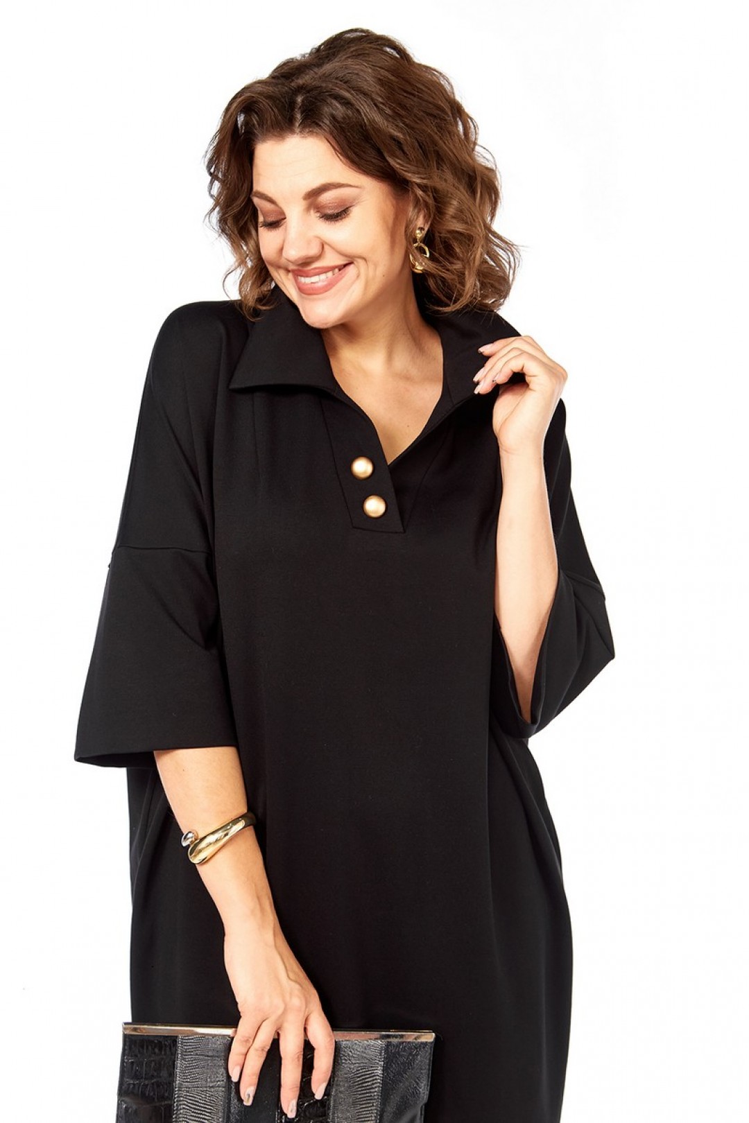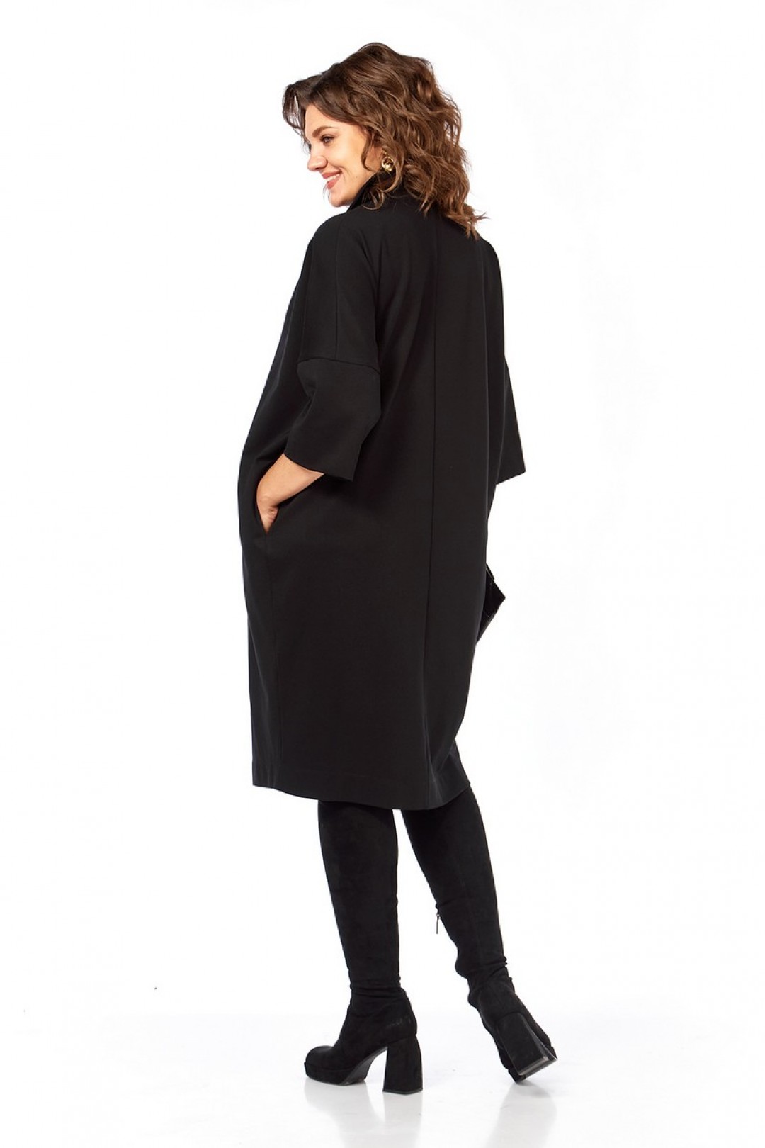 Платье женское, свободного кроя, изготовлено из трикотажного полотна. Горловина обработана стояче-отложным воротником и планками, декорированными пуговицами. Спинка со средним швом. Рукава спущенные, длиной ¾.