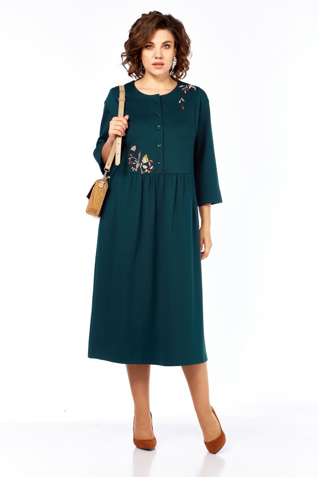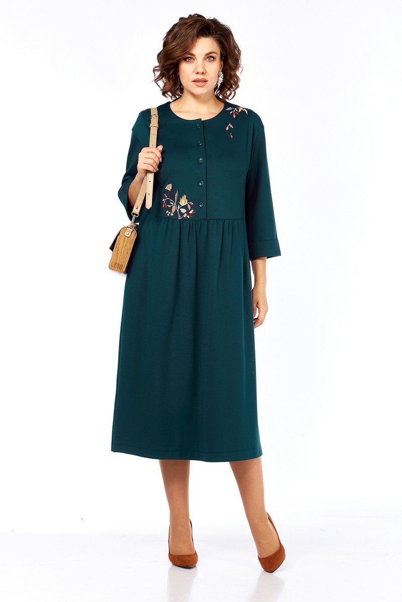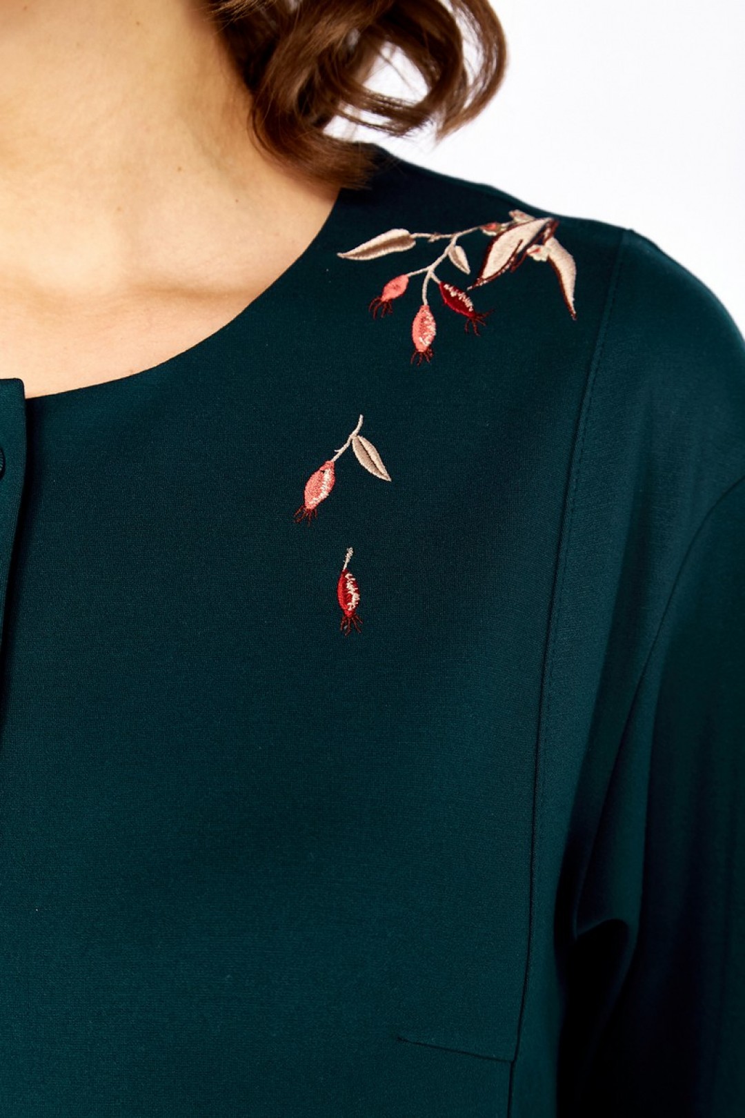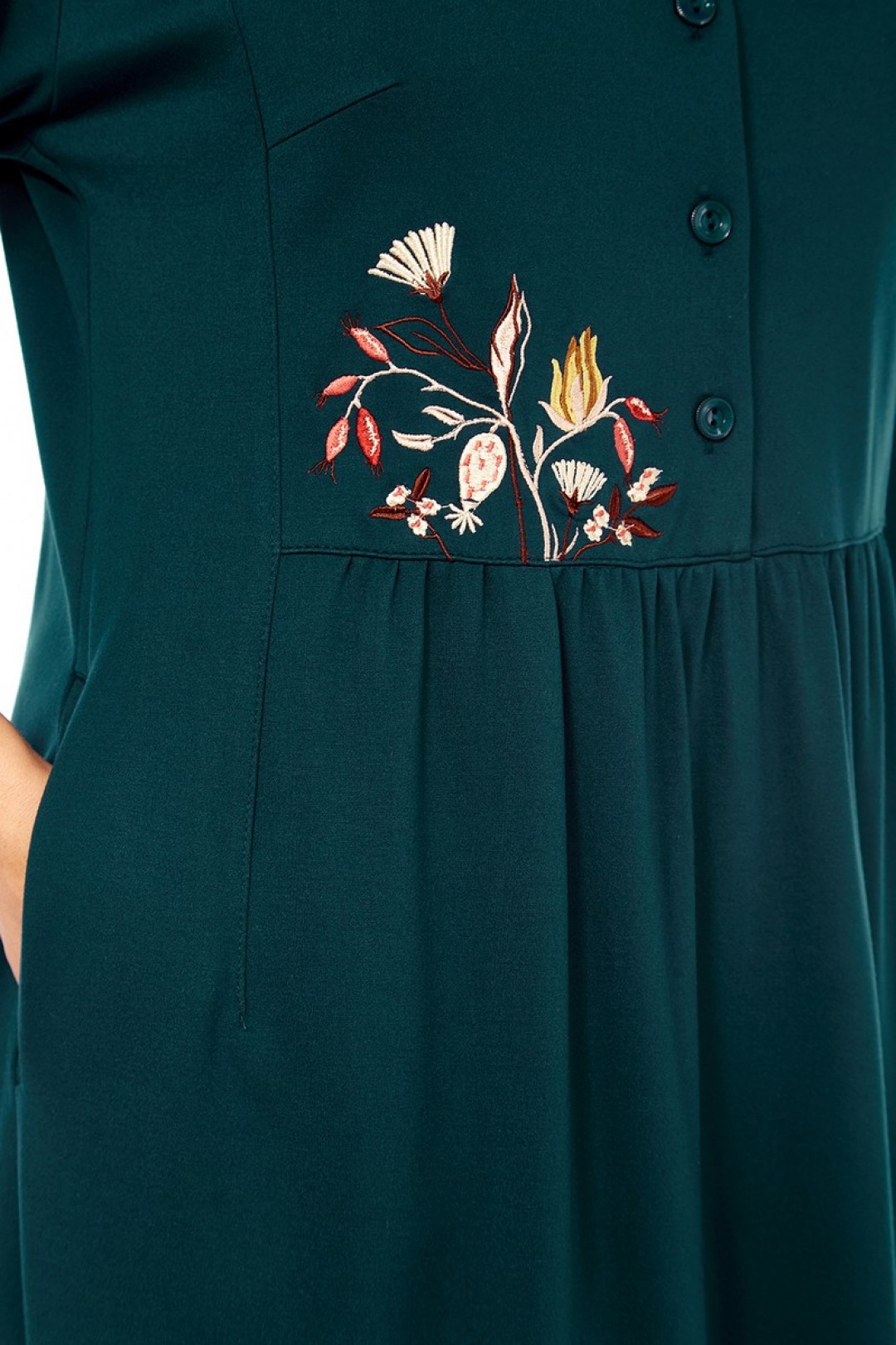 Платье женское А-силуэта выполнено из трикотажного полотна. Горловина округлой формы, застежка центральная, до линии талии на петли и пуговицы. По переду и спинке обработаны рельефы от линии плеча. Платье между рельефами отрезное по линии талии, со сборкой. Рукава спущенные с отложными манжетами. Изделие декорировано вышивкой.