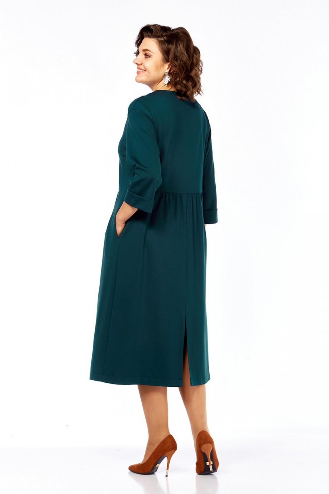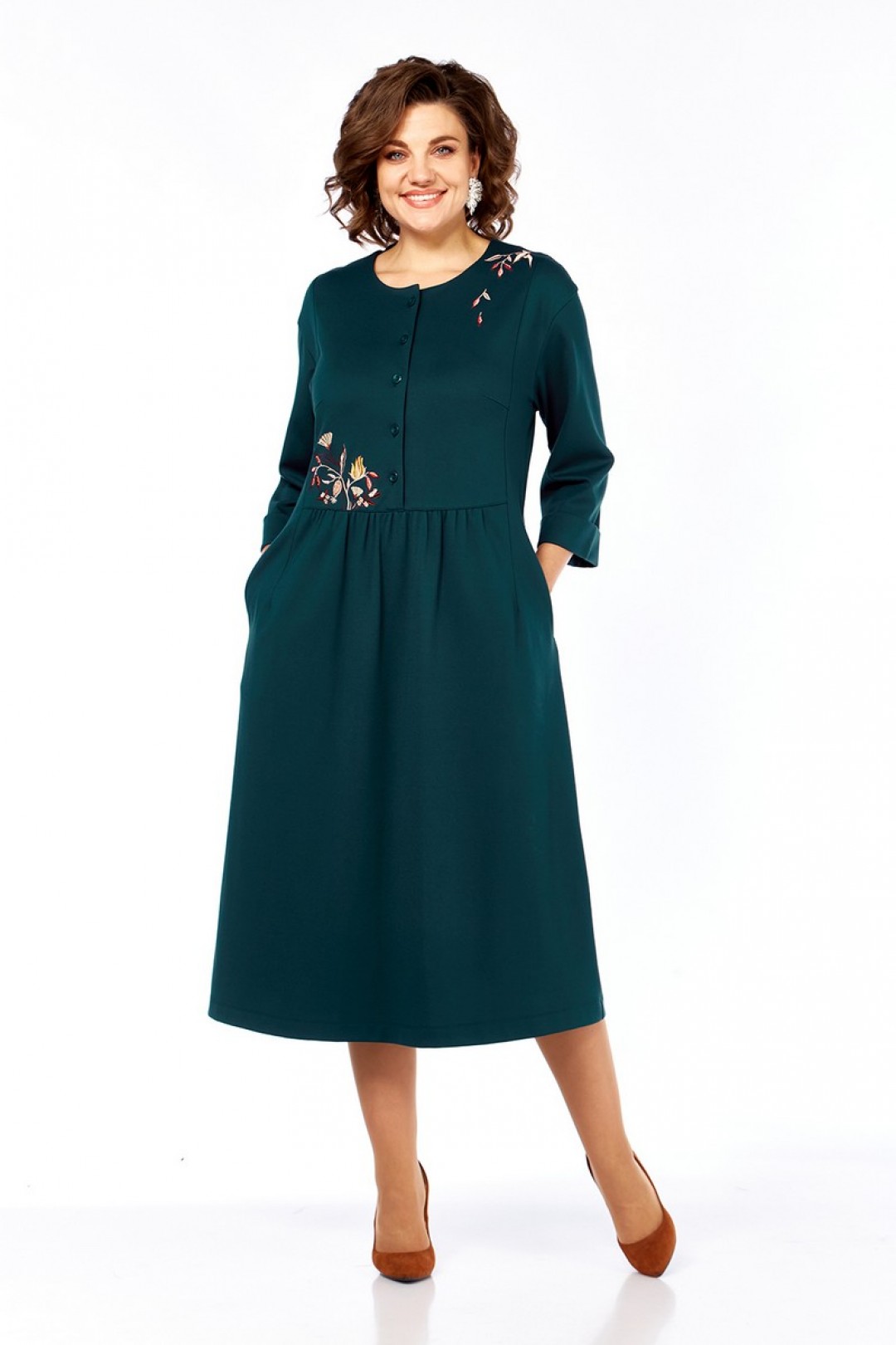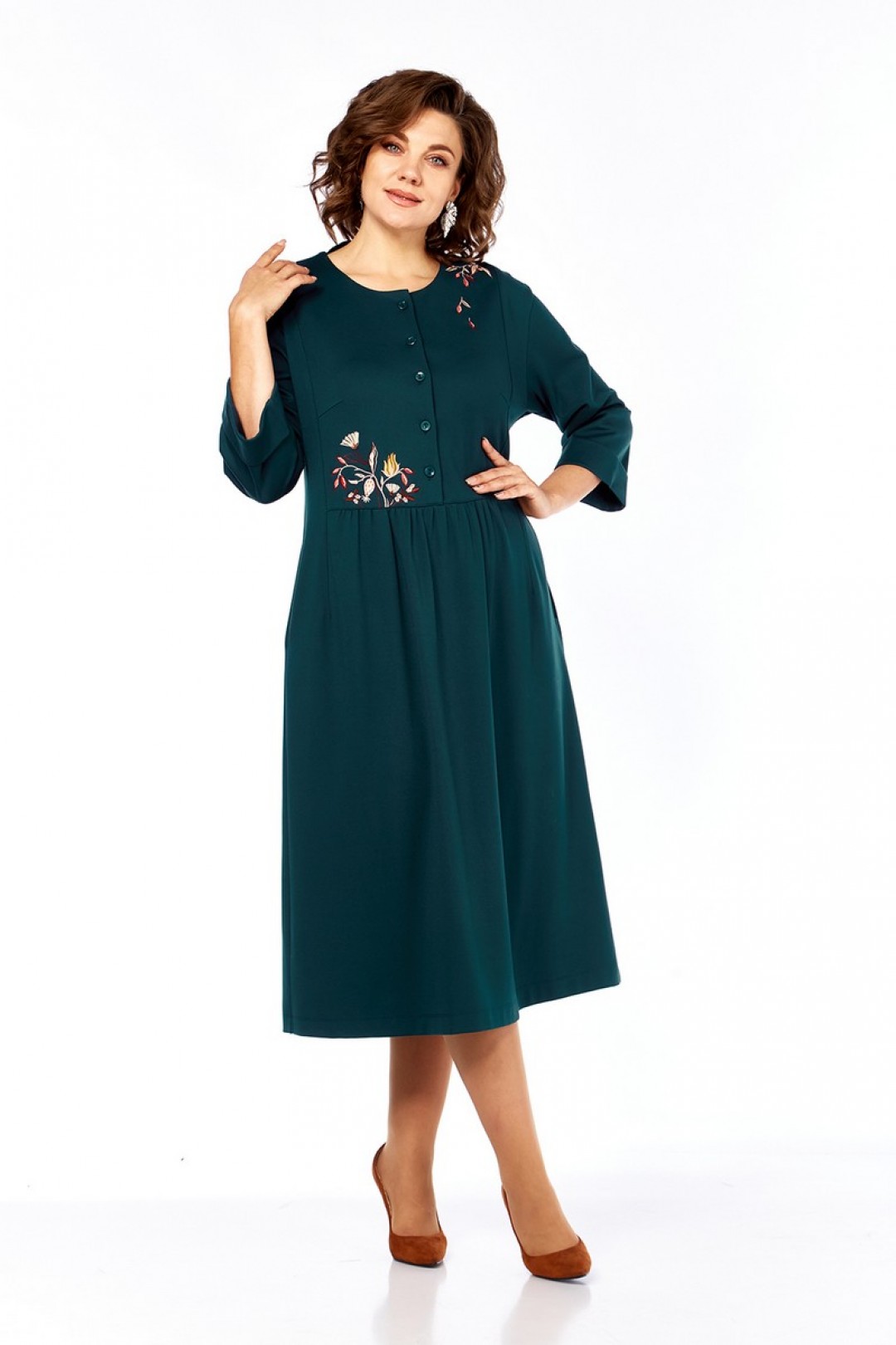 Платье женское А-силуэта выполнено из трикотажного полотна. Горловина округлой формы, застежка центральная, до линии талии на петли и пуговицы. По переду и спинке обработаны рельефы от линии плеча. Платье между рельефами отрезное по линии талии, со сборкой. Рукава спущенные с отложными манжетами. Изделие декорировано вышивкой.