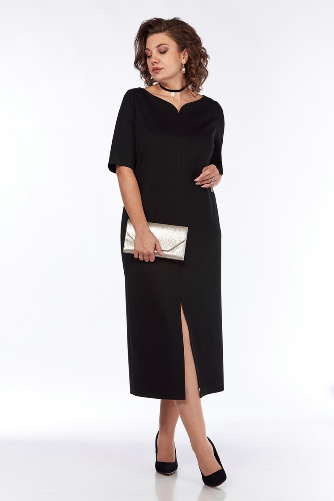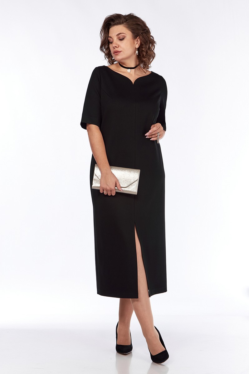 Платье женское, нарядное, полуприлегающего силуэта выполнено из фактурного трикотажного полотна премиум-класса. Горловина фигурной формы. Перед с нагрудными вытачками и средним швом в котором обработан разрез. Спинка со средним швом. Рукава втачные, одношовные с небольшим разрезом по шву.