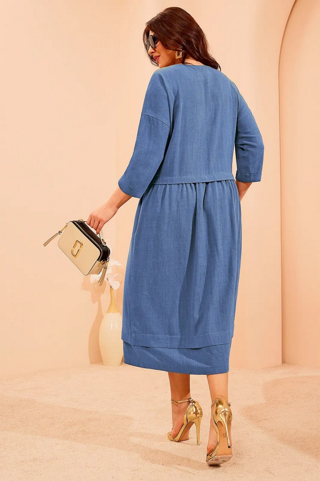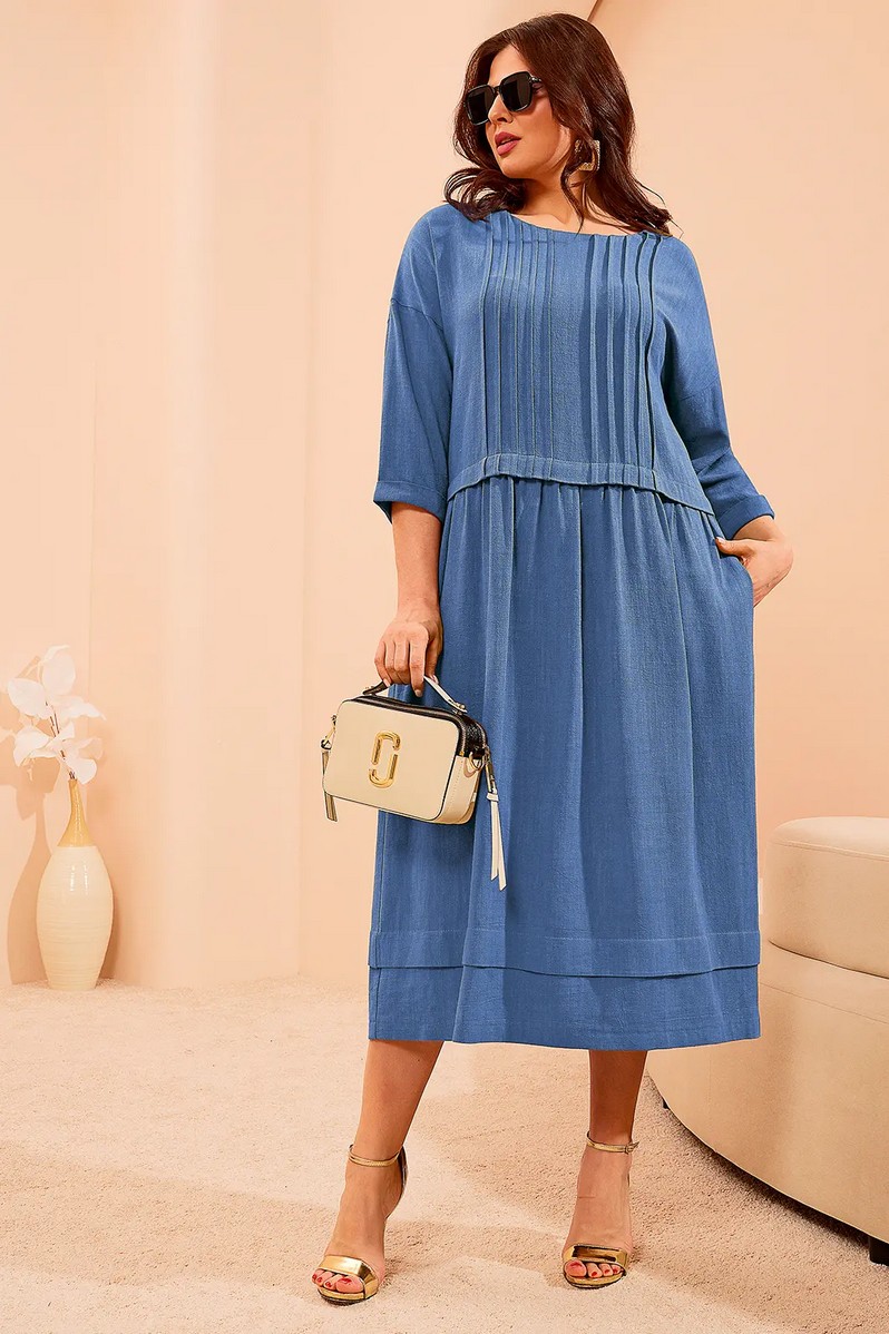 Платье с округлым вырезом горловины и спущенной линией плеча. Изделие отрезное в области талии и сборкой от подреза. Перед с застроченными складками в верхней части. Рукава втачные. Платье с карманами в боковых швах.