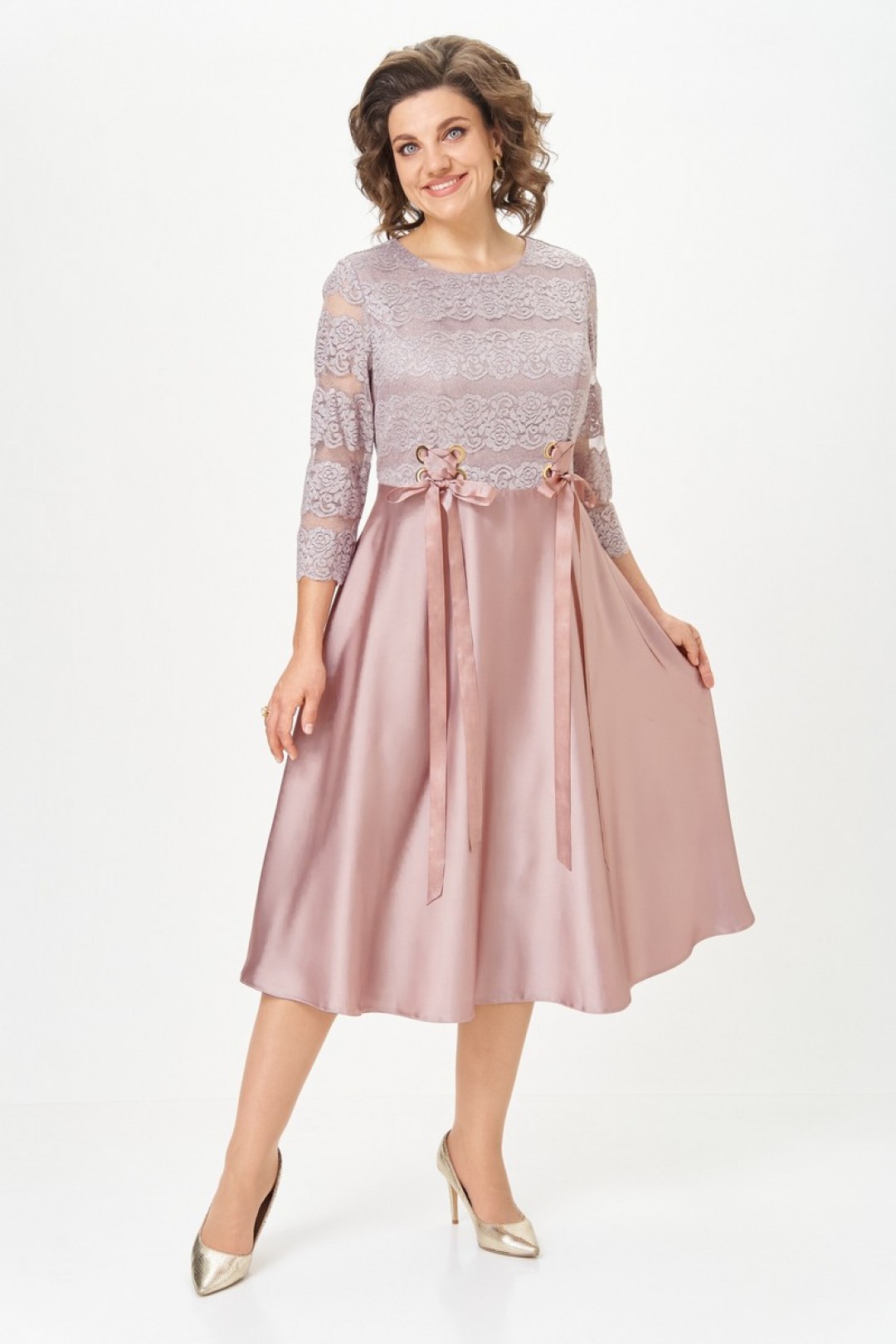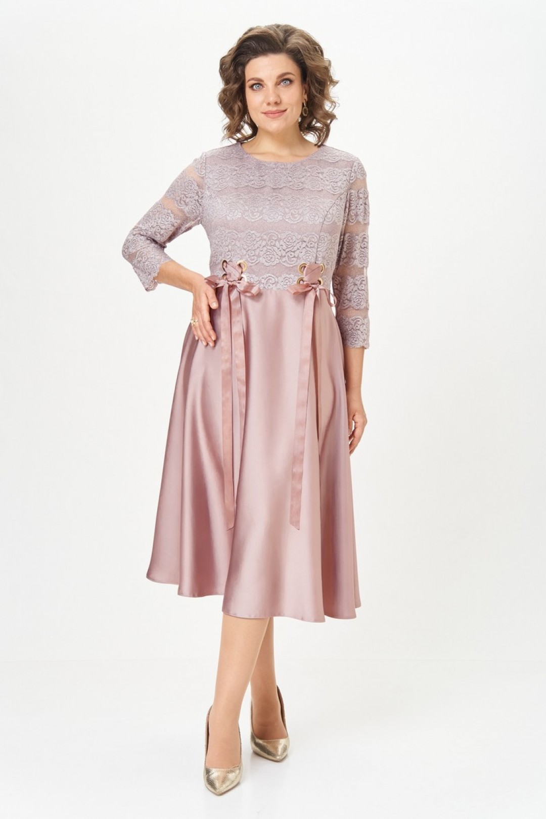 Нарядное женское платье полу-прилегающего силуэта, выполнено из гипюра с глитером и атласа. Лиф платья отрезной по линии талии, выполнен из гипюра с глитером. Горловина платья округлой формы, на обтачке, на полочке выполнены рельефы, по рельефам обработаны люверсы с декоративной лентой. Юбка платья расклешенного силуэта, из атласа, спинка идентична полочке, со средним швом и рельефами, в среднем шве потайная молния. Рукав втачной, оптимальной длины, выполнен из гипюра с глитером. Нарядное платье отличный выбор для торжественных мероприятий!