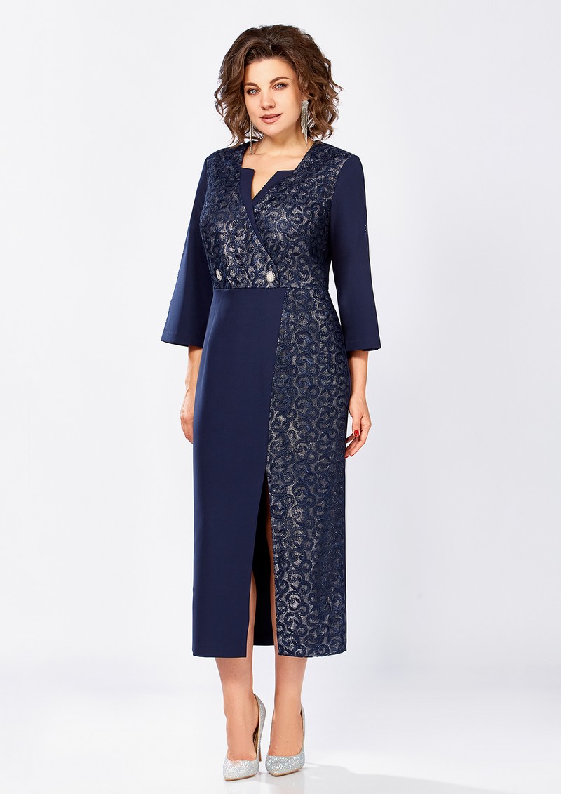 Стильное, женское платье, выполненное из текстиля и кружева. Полочка отрезная по линии талии, выполнена из кружева наложенного на ткань с блеском, горловина V-образной формы, обработана декоративными элементами из текстиля, по линии талии полочка декорирована пуговицами. Юбка платья выполнена из текстиля и кружева наложенного на ткань с блеском, с ассиметричным, вертикальным подрезом и разрезом по низу. Спинка выполнена из однотонного текстиля, со средним швом и вытачками среднем шве потайная молния. Рукав втачной, оптимальной длины, выполнен из текстиля, со средним швом, который к низу переходит в разрез, декорированный стразами. Элегантное платье с эффектной отделкой прекрасный выбор для торжественных мероприятий!