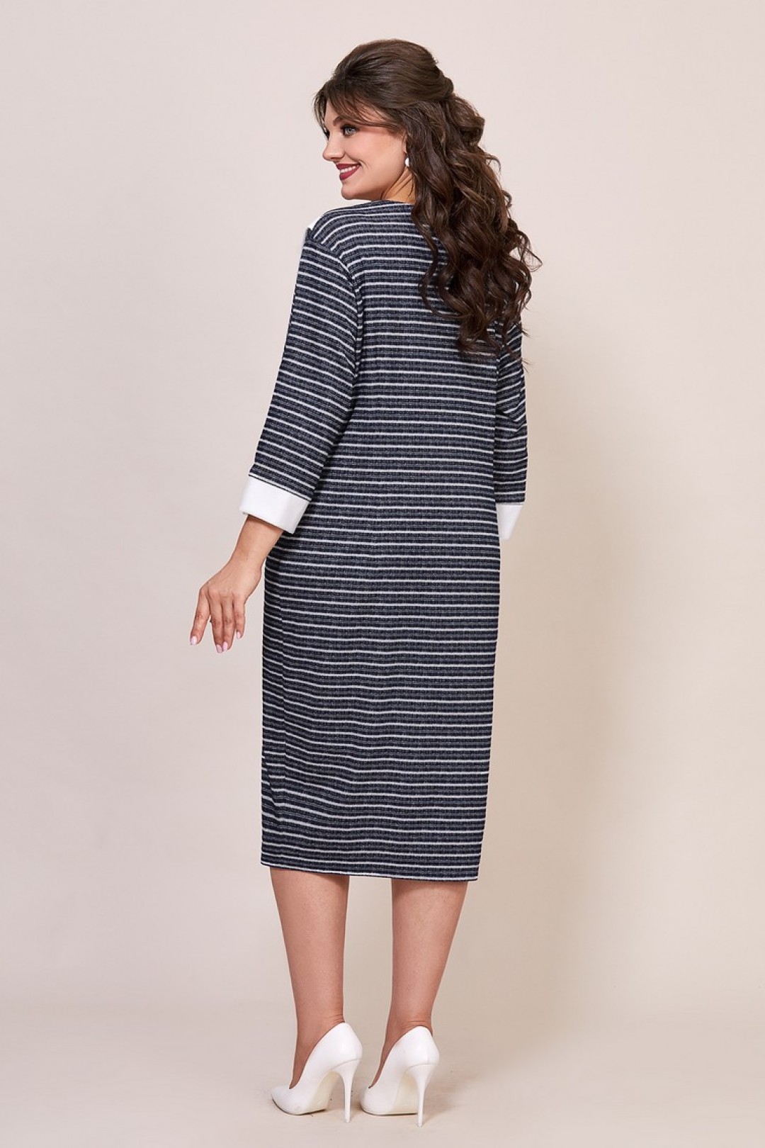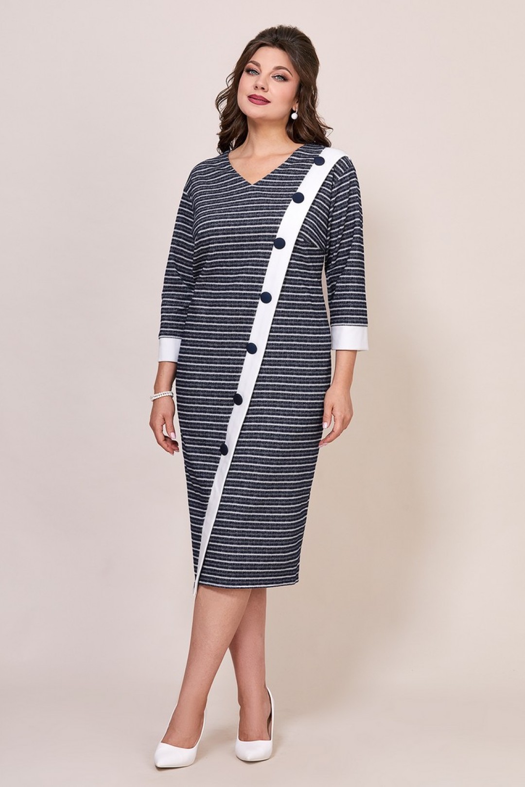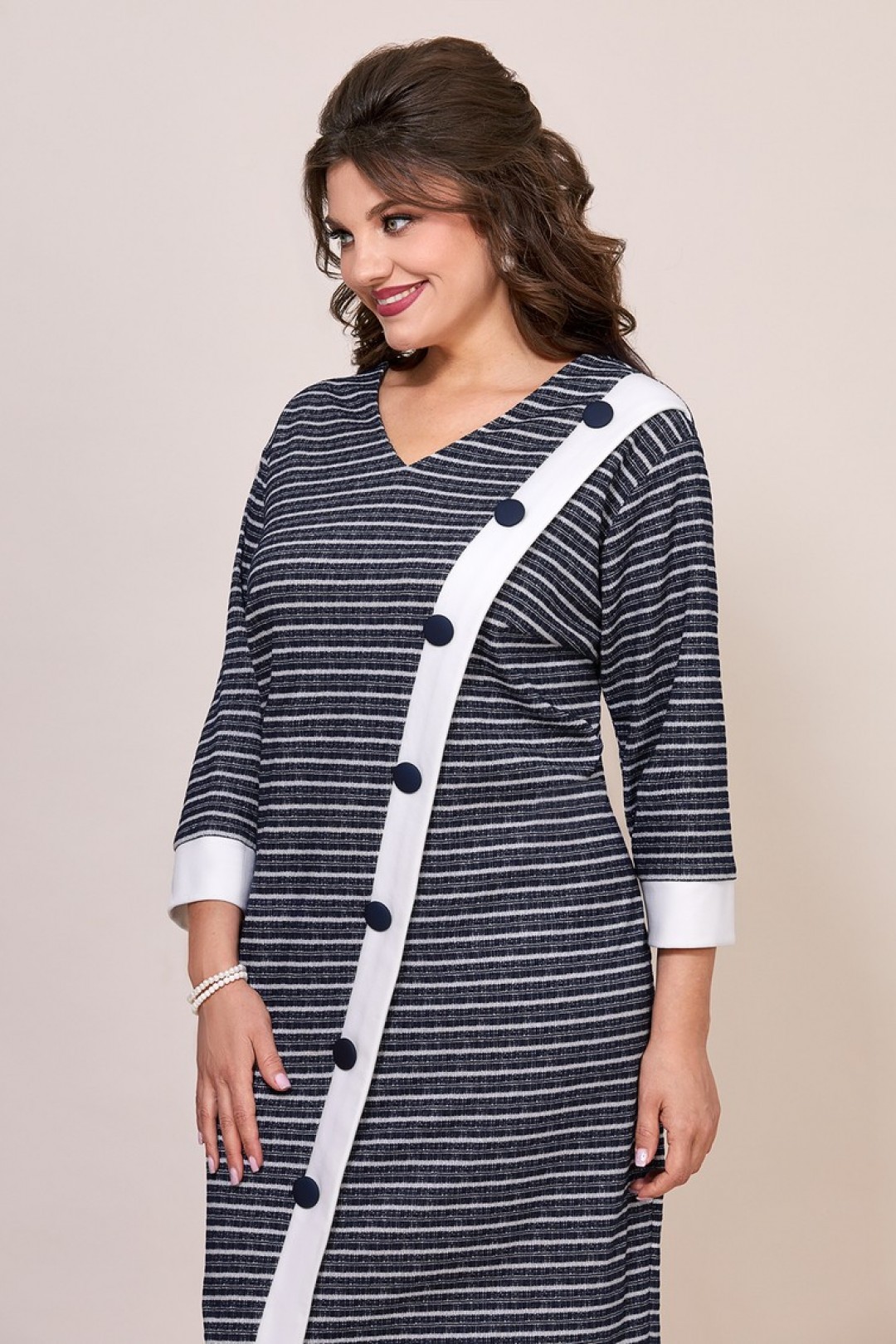 Повседневное трикотажное платье, полу-прилегающего силуэта, выполнено из трикотажного полотна в полоску. Горловина платья V-образной формы на обтачке, по полочке выполнена вставка из однотонного трикотажного полотна и декорирована пуговицами. Рукав втачной, длиной 3/4, по низу обработана манжетой из однотонного трикотажа. Спинка выполнена из основной ткани с вытачками. Универсальное и удобное платье для женщин с роскошными формами!